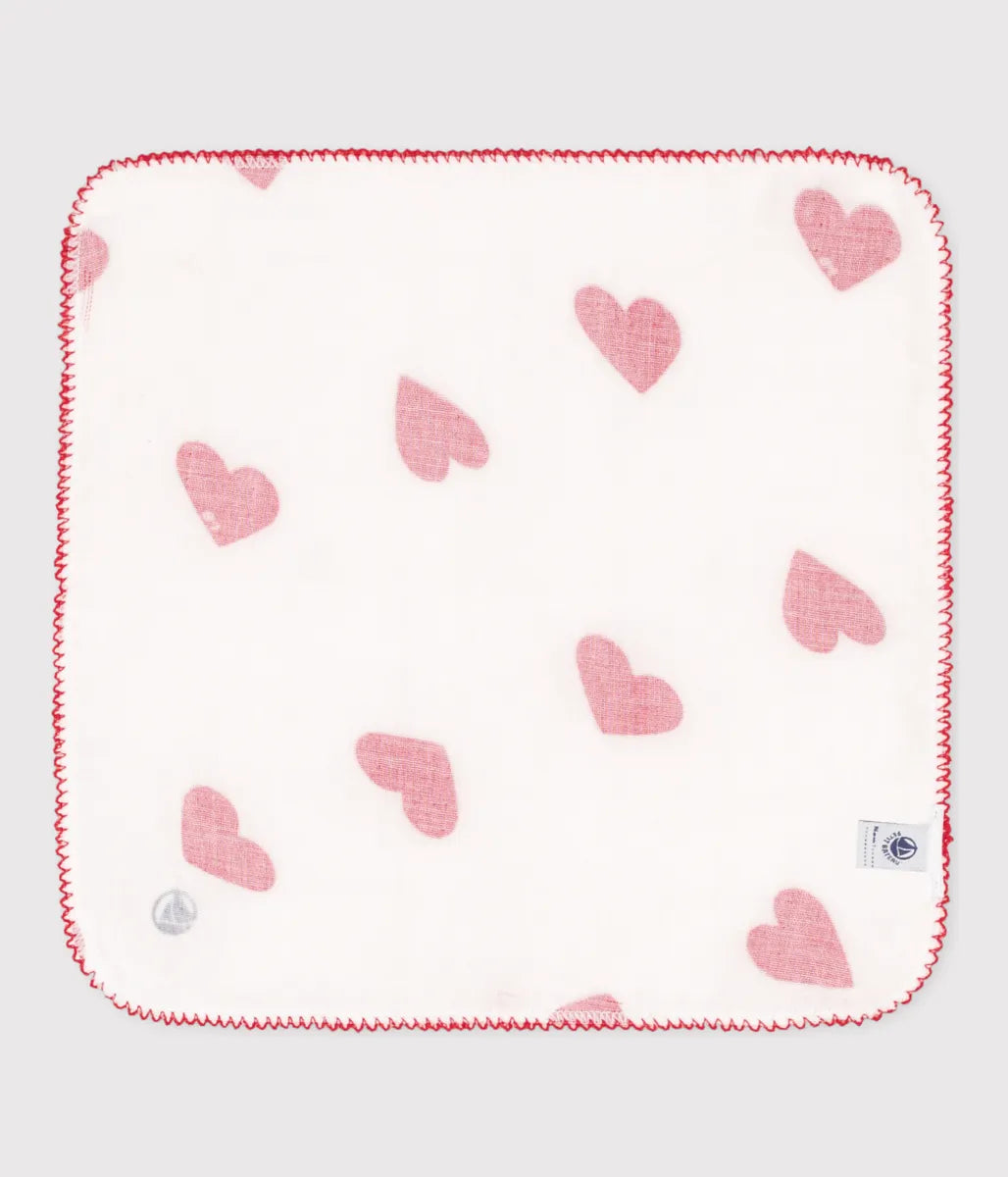 やわらかな肌触りのダブルガーゼを使用したハンカチが新登場!大人気のハートプリントのハンカチはピコレースとロゴがデザインのアクセント。柄違いのマリニエール柄と揃えたくなるアイテムは、ギフトにもおすすめです。