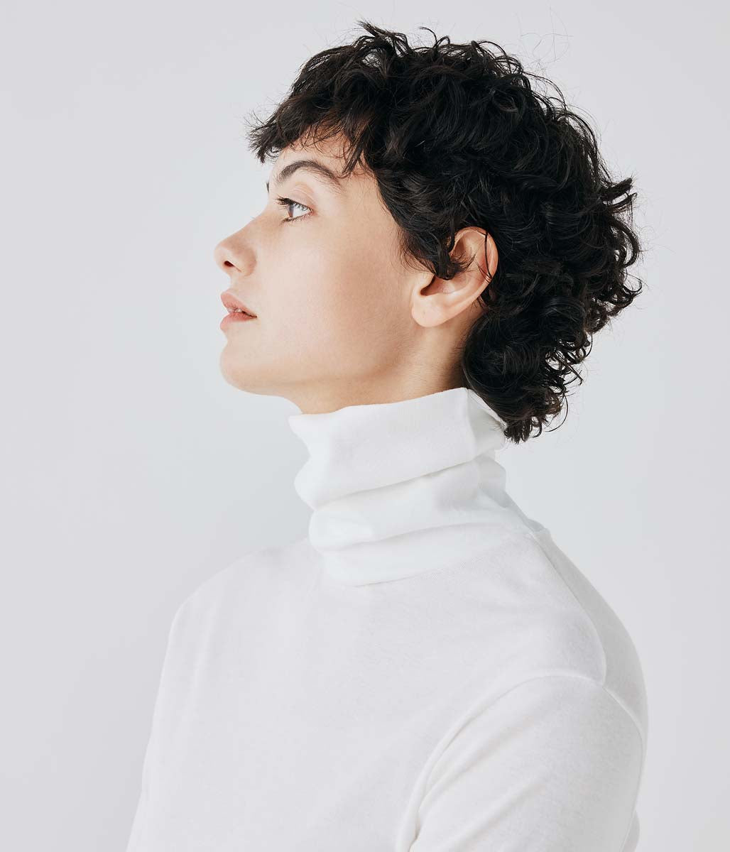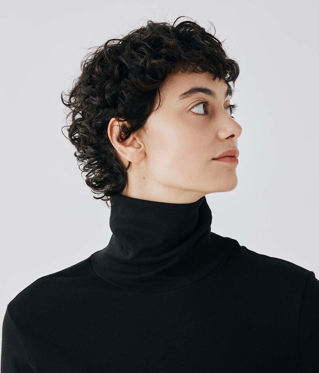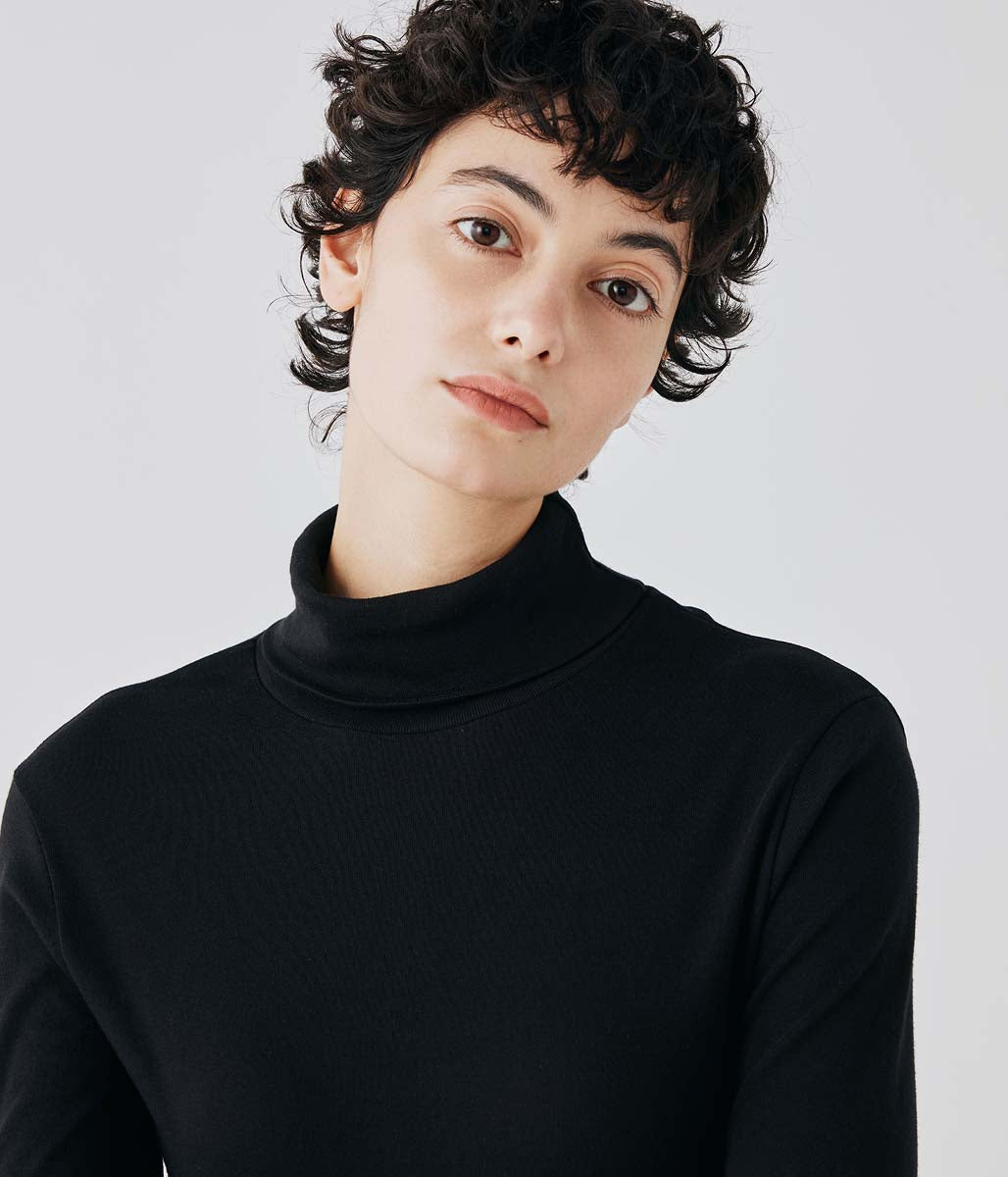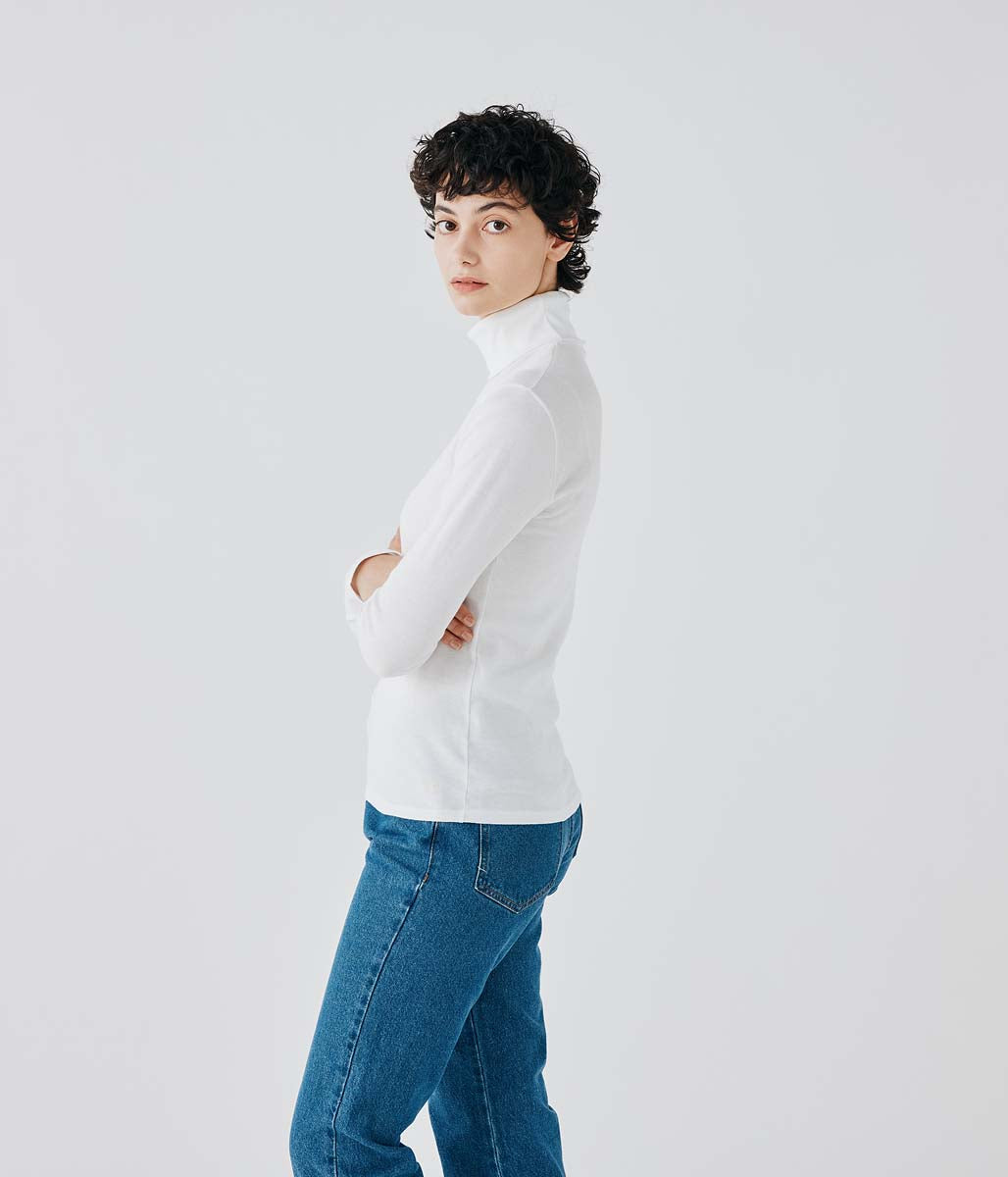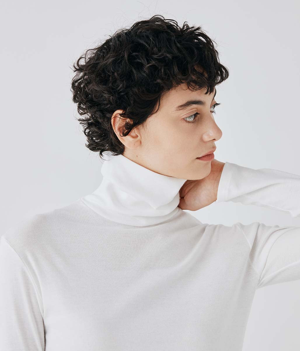 シンプルなプレーンカラーで揃えたタートルネック長袖Tシャツです。第二の肌と呼ばれるほど心地よい肌触りの1x1リブ編み素材を使用。タートルネックが首周りをあたたかく包み込み、冬の寒さにも対応。これ一枚でも、また重ね着でも活躍するおすすめアイテムです。