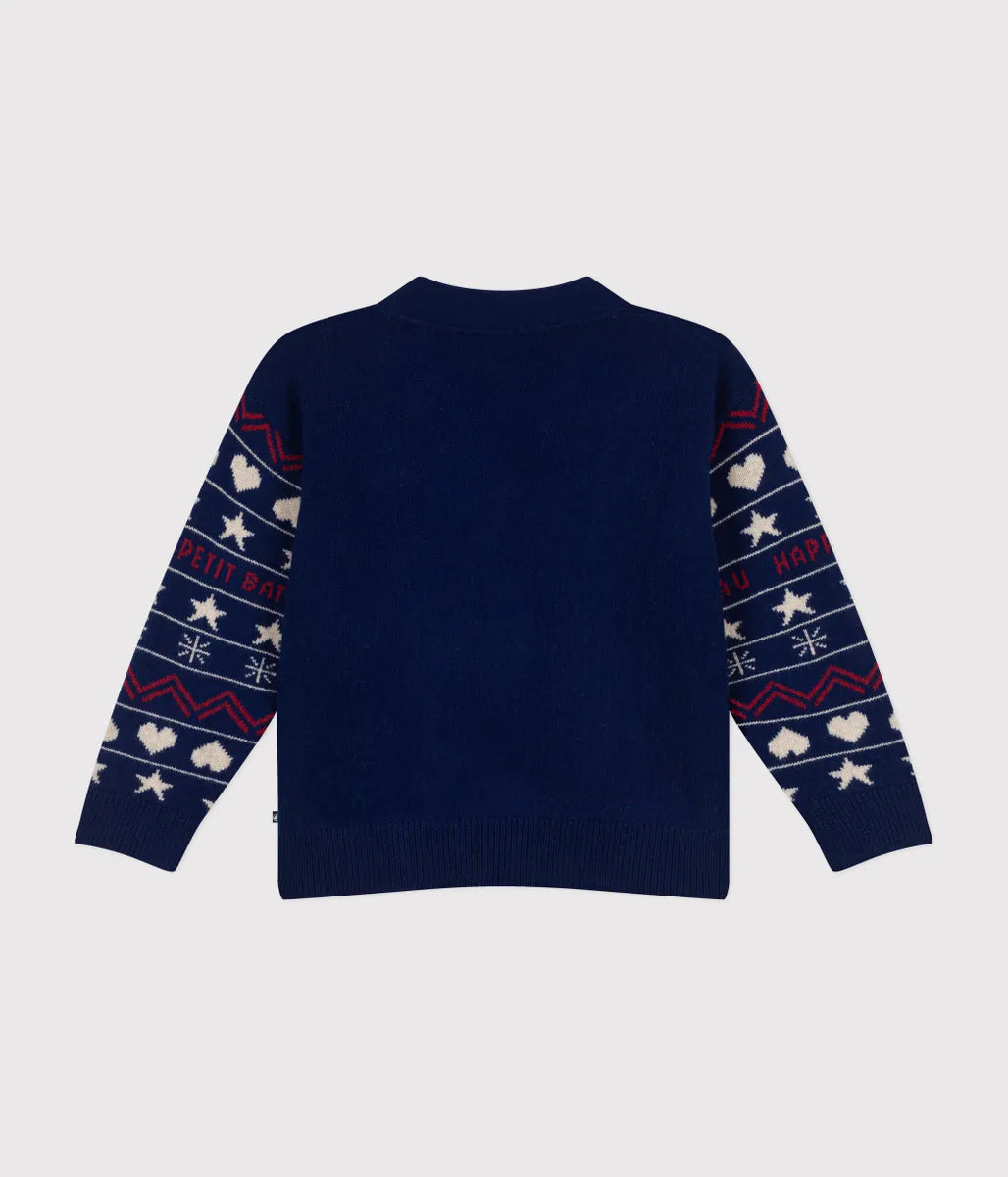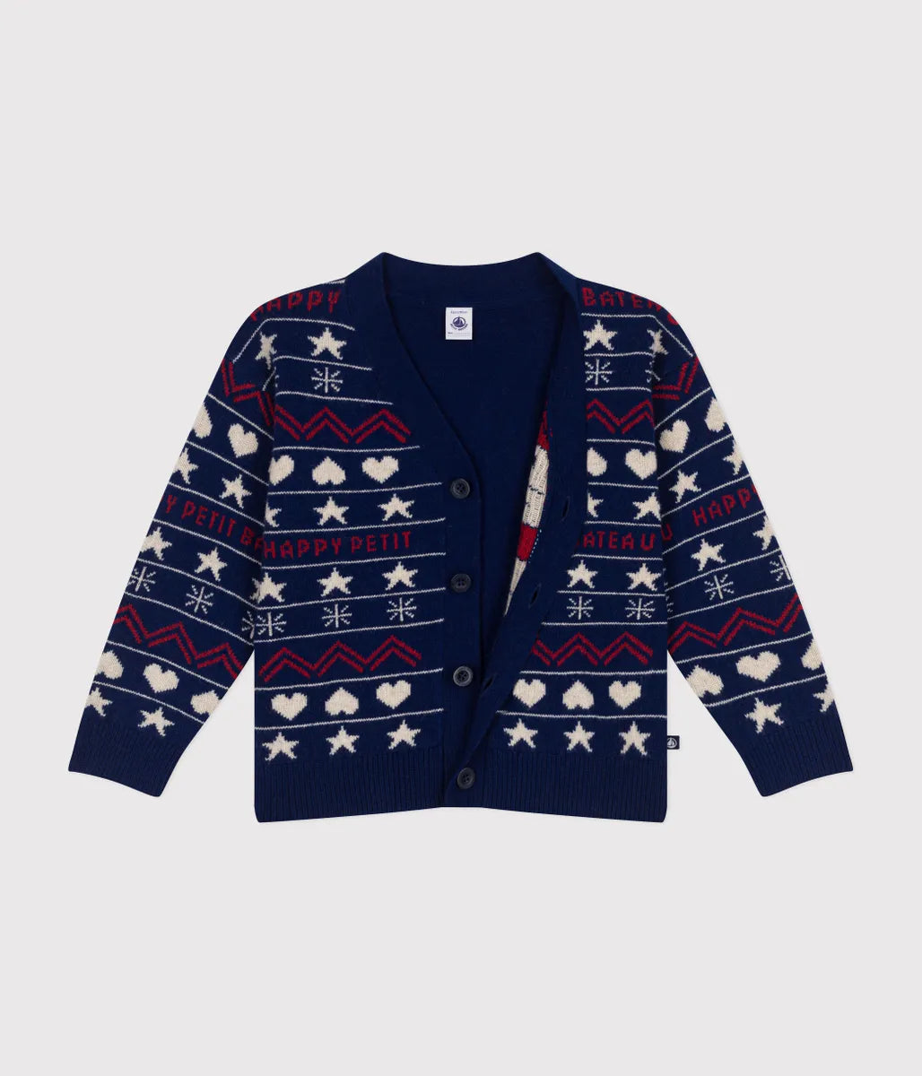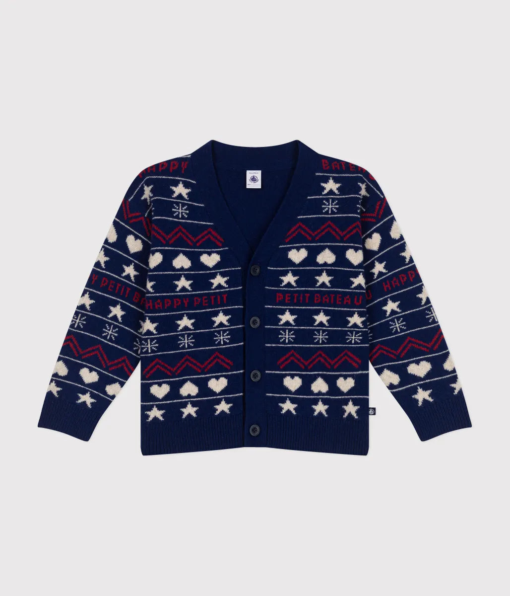 冬らしいノルディック柄にブランドロゴを織り交ぜたデザインが目を引くニットカーディガンの登場です。環境や動物にやさしいウールを使用したあたたかみのある肌触りと着心地に定評があります。サッと羽織れる一着は、これからのシーズンの定番として人気のアイテムは、きょうだいで合わせたコーディネイトも楽しめます。