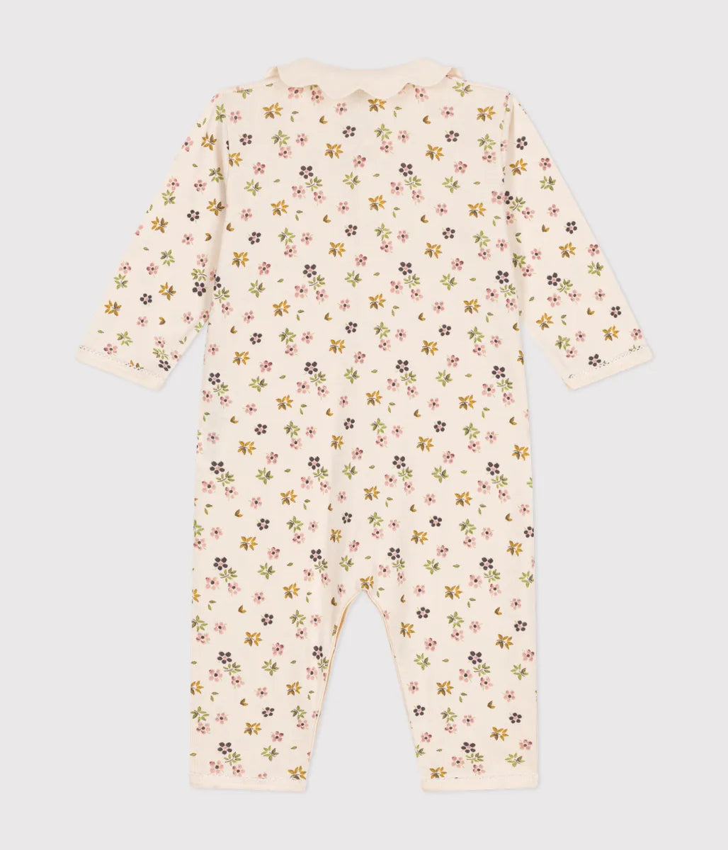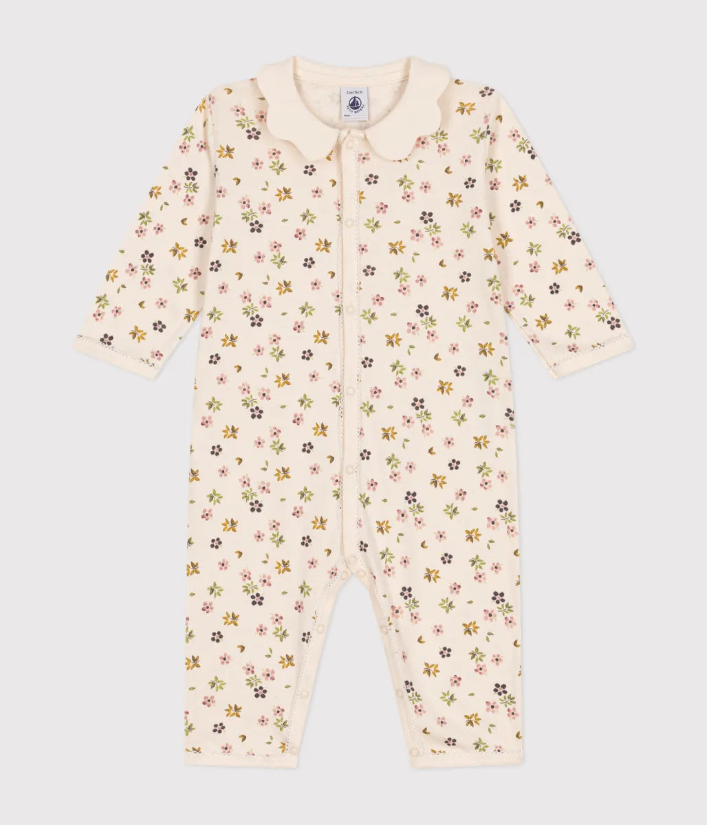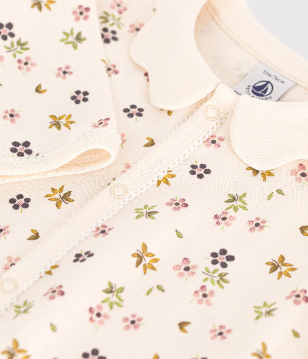 可憐なフラワープリントがとてもキュートな足なしロンパースです。環境にやさしく、第二の肌と呼ばれるほどやわらかな1x1リブ編みコットン素材を使用しナチュラルな着用感を実現しています。前面には取り外しが簡単なスナップボタンが施され大きく開くので、オムツ替えやお着替えも簡単。フリル衿やピコレースをあしらったキュートなデザインが、ギフトにも喜ばれるおすすめのアイテムです。