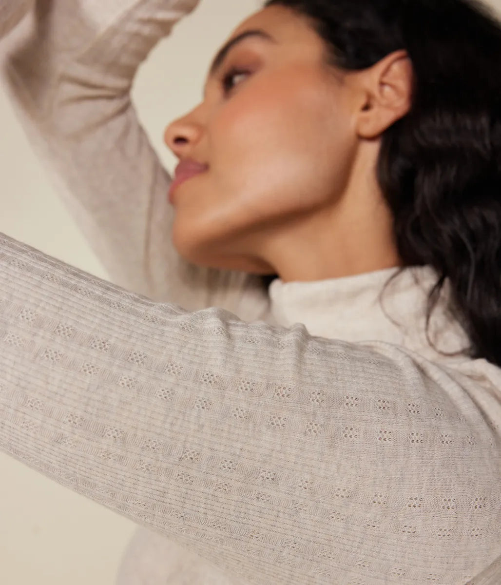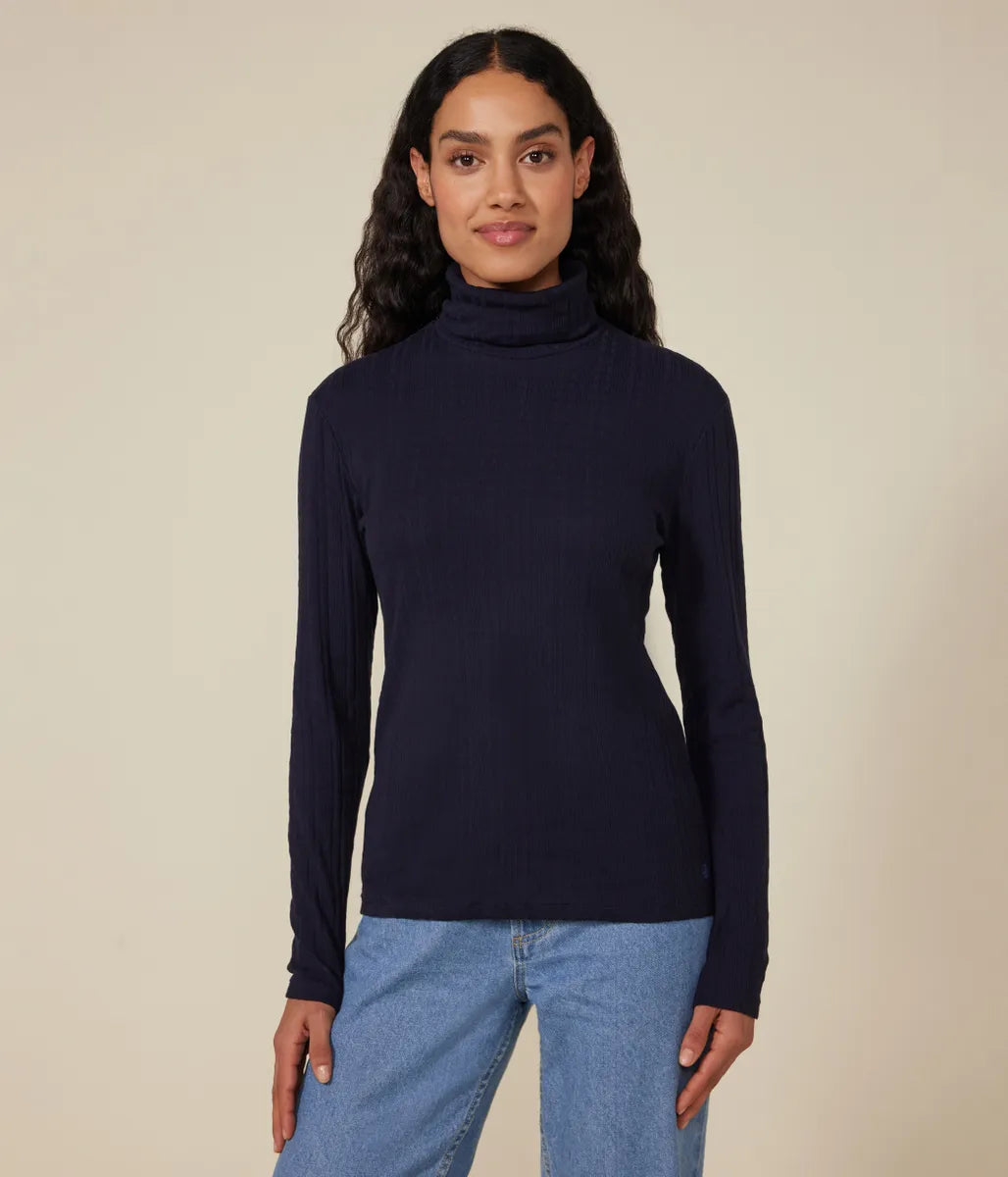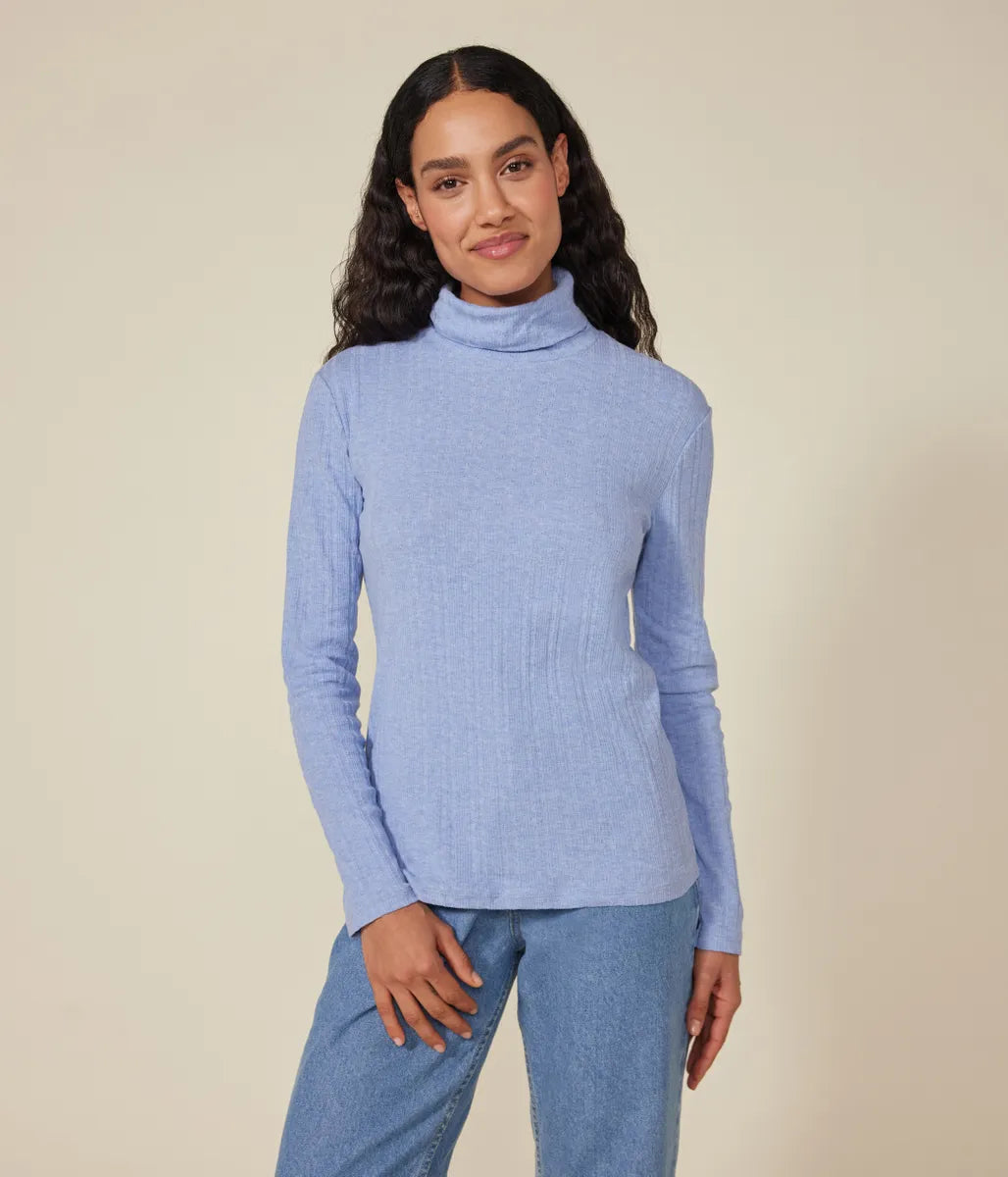 合わせやすいネイビー、ライトブルー、ホワイトを用意したオンラインブティック限定の長袖タートルネックです。環境に配慮したオーガニックコットンを使用。やわらかなタートルネックが首周りをあたたかく包み込み、冬の寒さにもしっかり対応してくれます。思わず色違いで揃えたくなるおすすめのアイテムです。