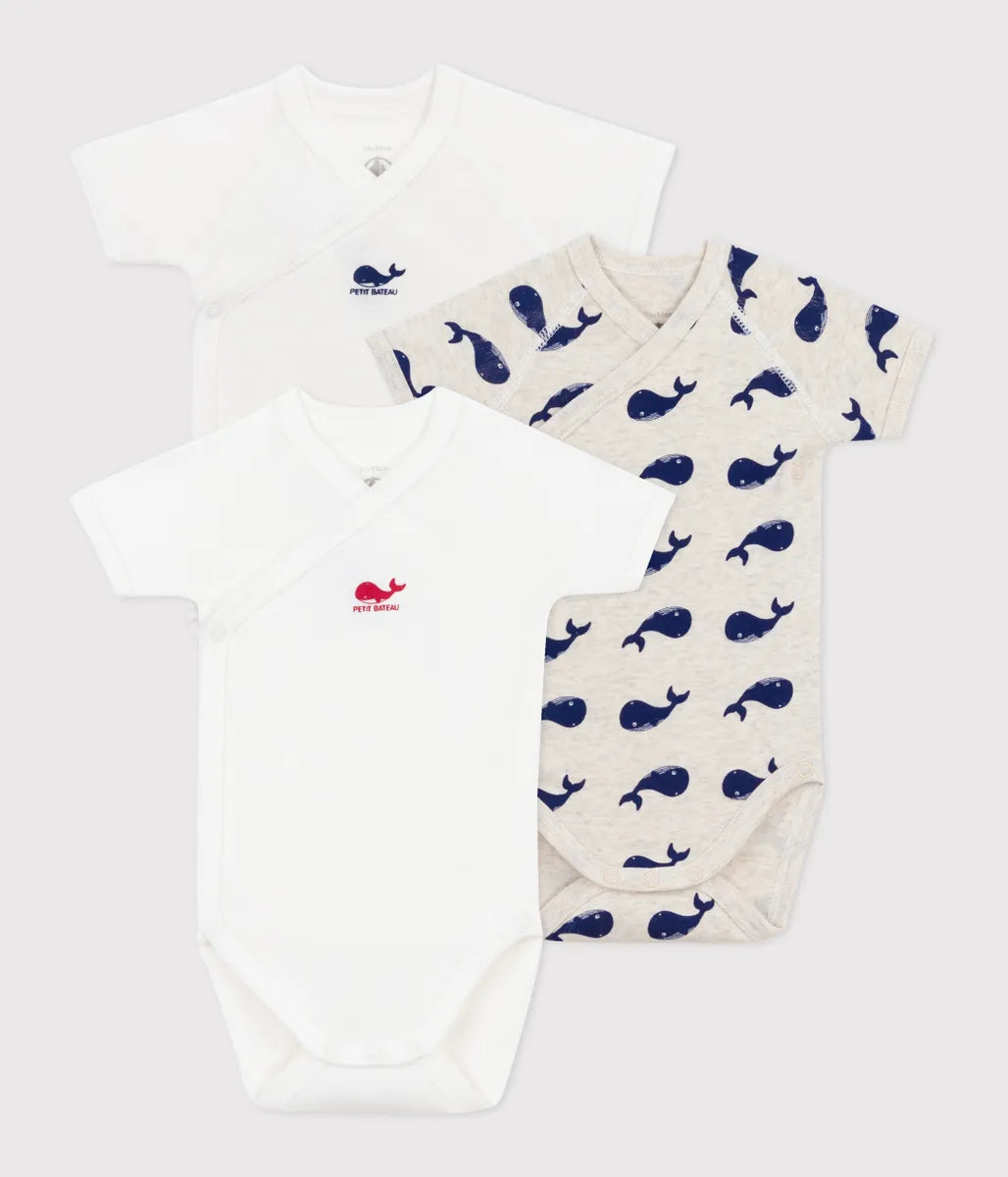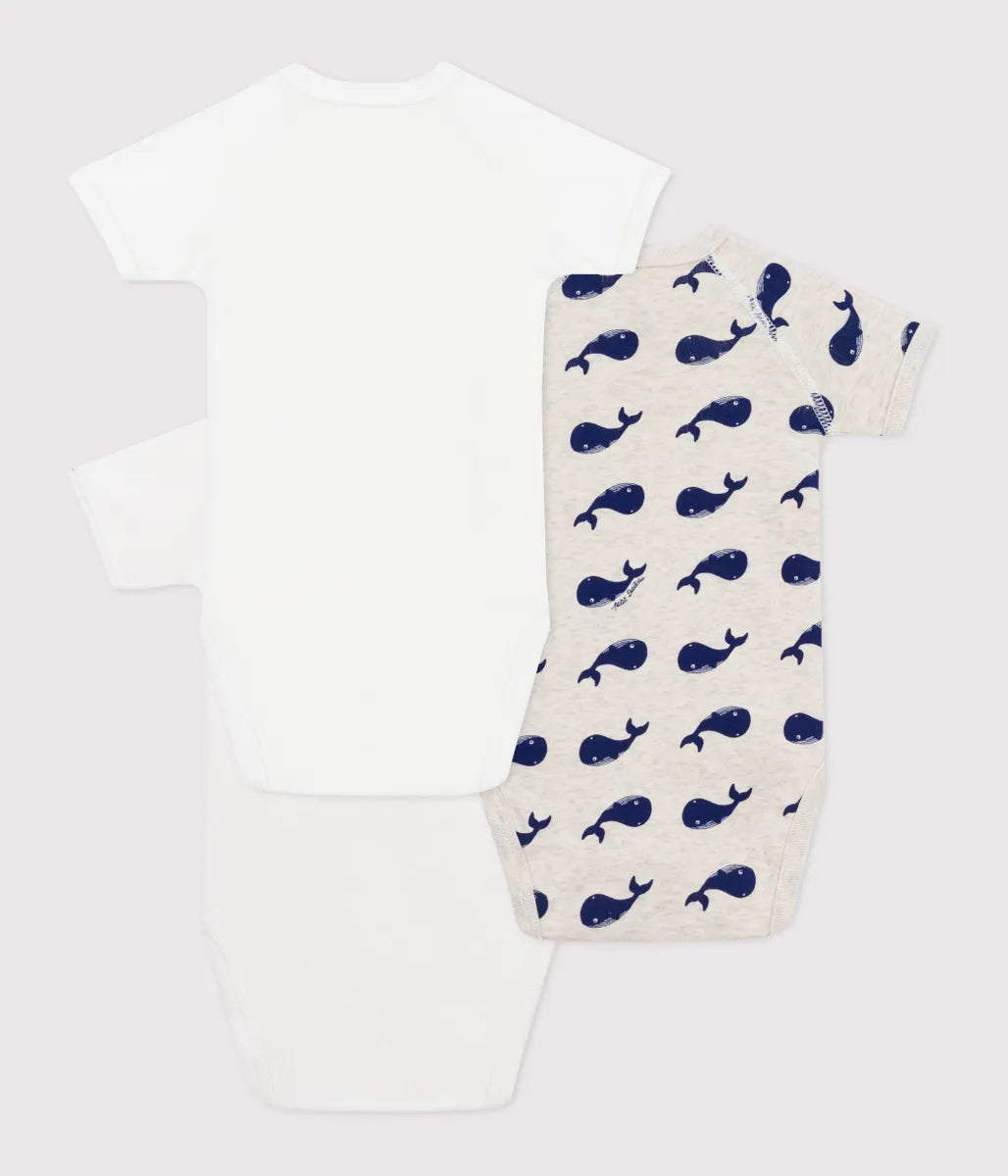 パターン違いのキュートなクジラプリントで揃えた半袖あわせボディ3枚セットです。環境にやさしく、第二の肌と呼ばれるほどやわらかな1x1リブ編みコットン素材を使用し、ナチュラルで快適な着用感を実現しています。お着替えのしやすい合わせ仕様に加え、股下がスナップボタンで大きく開くのでオムツ替えやお着替えも簡単。ユニセックスで着用できるセットは、出産祝いなどのギフトにも大変おすすめです。