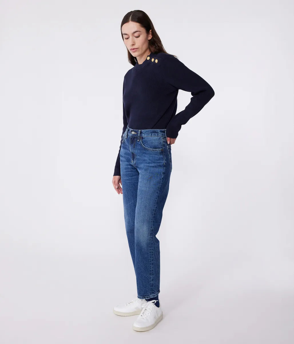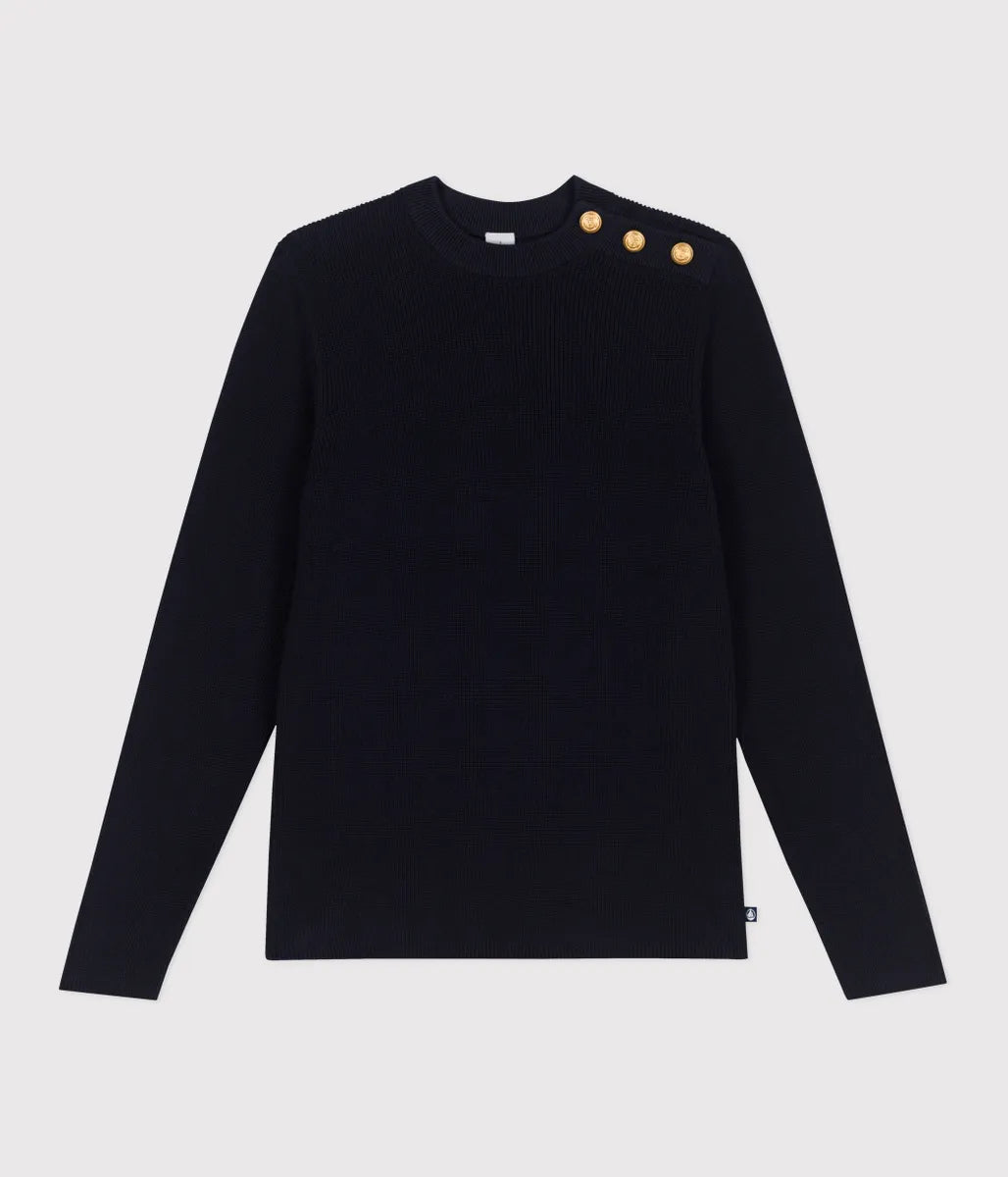ブランドカラーのネイビーにロゴ入り金ボタンが映えるニットプルオーバーです。環境に配慮したやわらかなウールを使用したあたたかくやわらかな着心地が特徴。カジュアルスタイルをちょっとエレガントにする、デニムからスカートまで幅広いアイテムと相性がいいおすすめアイテムです。Lサイズのみオンライン限定。