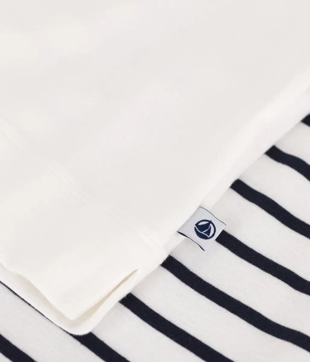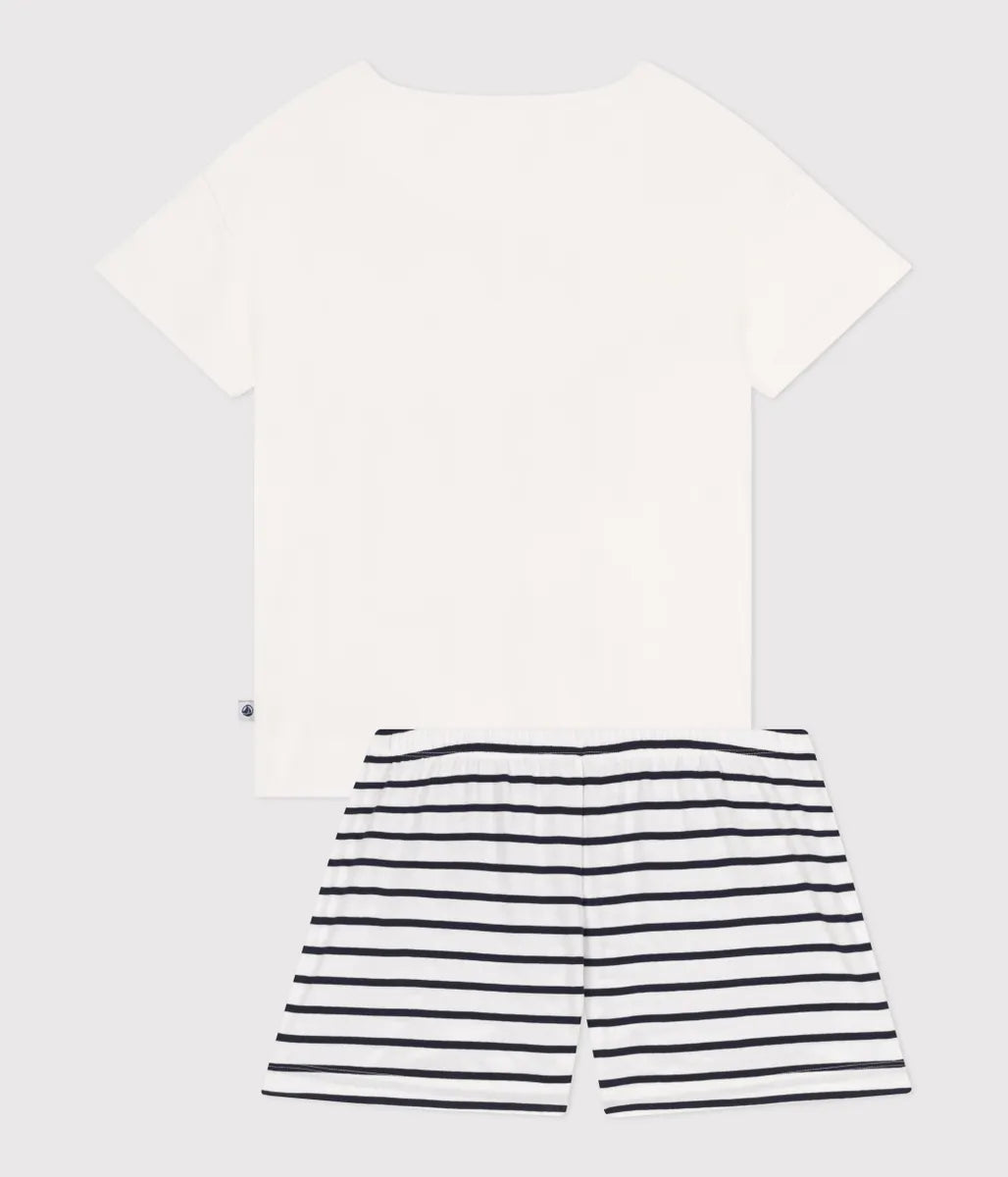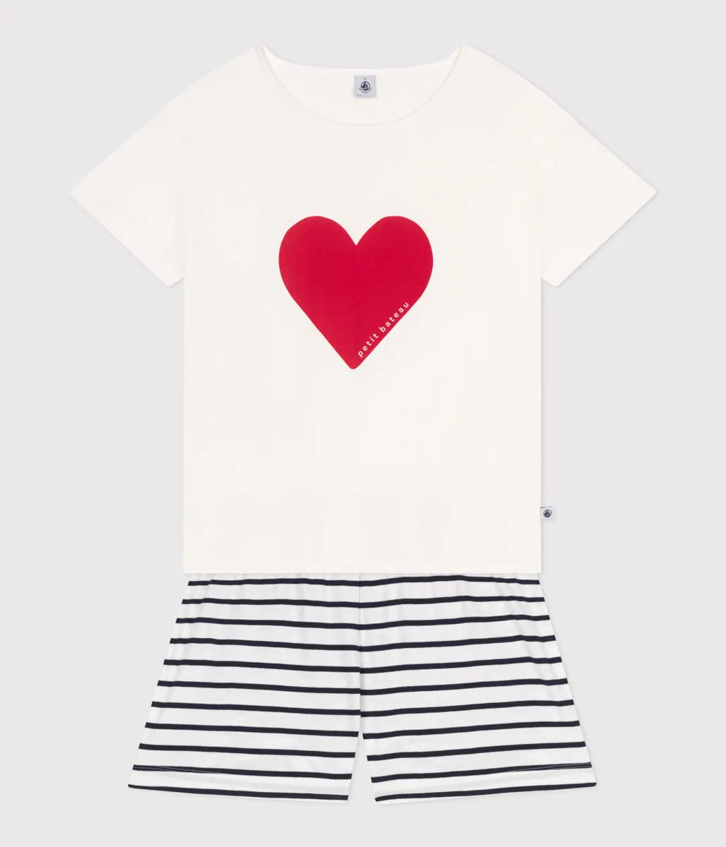 大きなハートプリントが目を引くトップスと、アイコニックなマリニエールボーダーのショートパンツを組み合わせた半袖パジャマです。環境にやさしく、第二の肌と呼ばれるほどやわらかく、伸縮性に優れた1×1リブ編み素材を使用し、快適な肌触りを実現。お家でのリラックスタイムから就寝時までを快適に楽しく過ごせるおすすめのアイテムです。