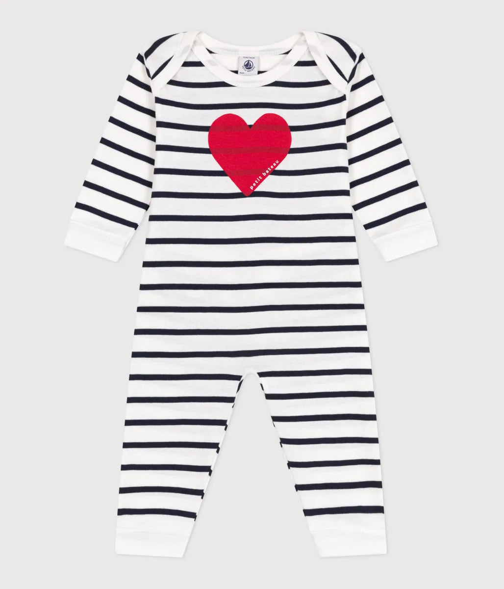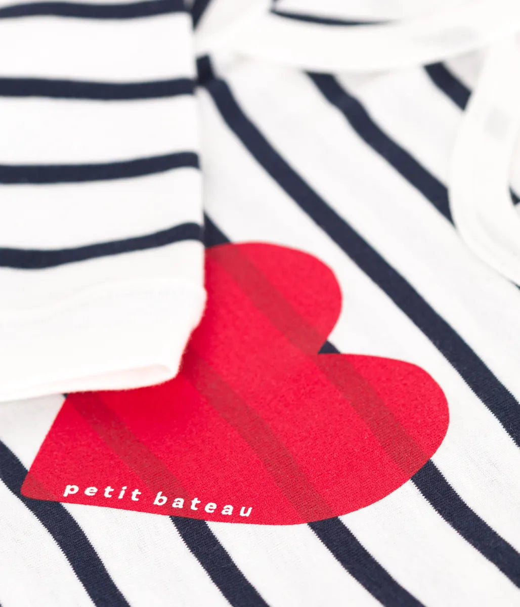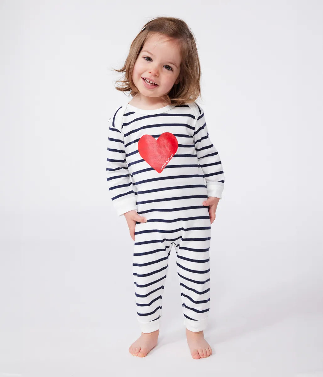 アイコニックなマリニエールボーダーに大きなハート柄をあしらったキュートなロンパースです。環境にやさしい、第二の肌と呼ばれるほどやわらかく、伸縮性に優れた1×1リブ編み素材を使用し、快適な着心地を実現。さっとお着替えができるスナップボタンがないデザインなので、子育て中のママやパパの生活をサポートしてくれます。デザイン性と機能性を兼備したアイテムは、ご出産祝いなどのギフトにも喜ばれます。