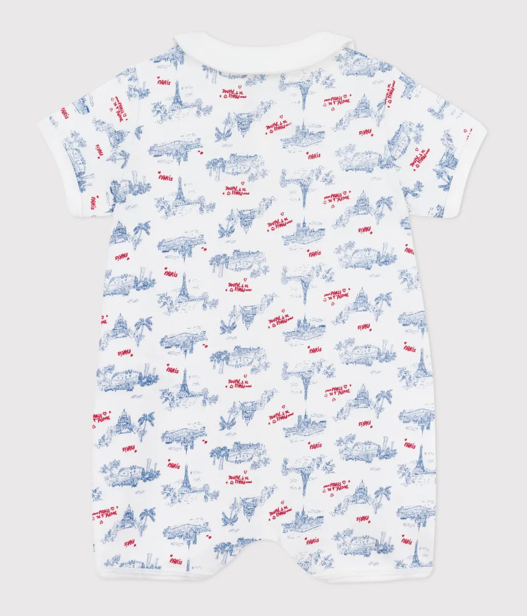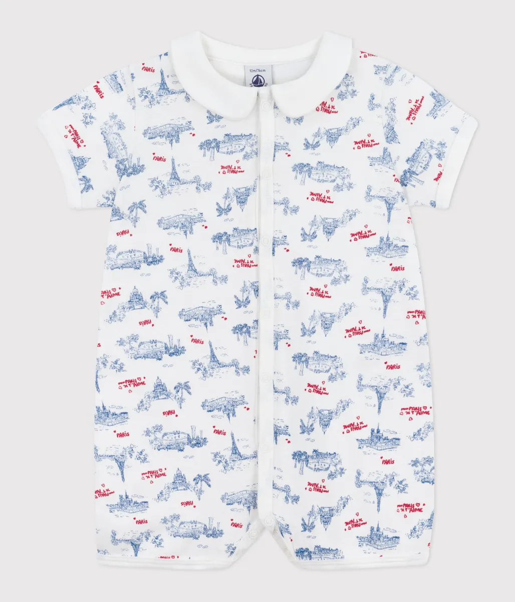 パリを象徴する建造物プリントをあしらったショートロンパースです。環境にやさしく、第二の肌と呼ばれるほどやわらかな1x1リブ編みコットン素材を使用し、ナチュラルで快適な着用感を実現。また、やさしい印象をプラスする丸衿がデザインのアクセントに効いています。前面が大きく開くので、オムツ替えやお着替えも簡単。脱ぎ着が楽なうえ何枚あっても嬉しいアイテムは、ご自宅としてはもちろん、出産祝いなどのギフトにもおすすめです。