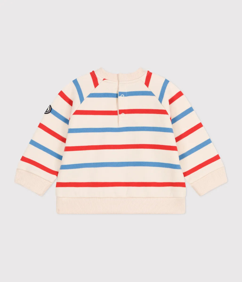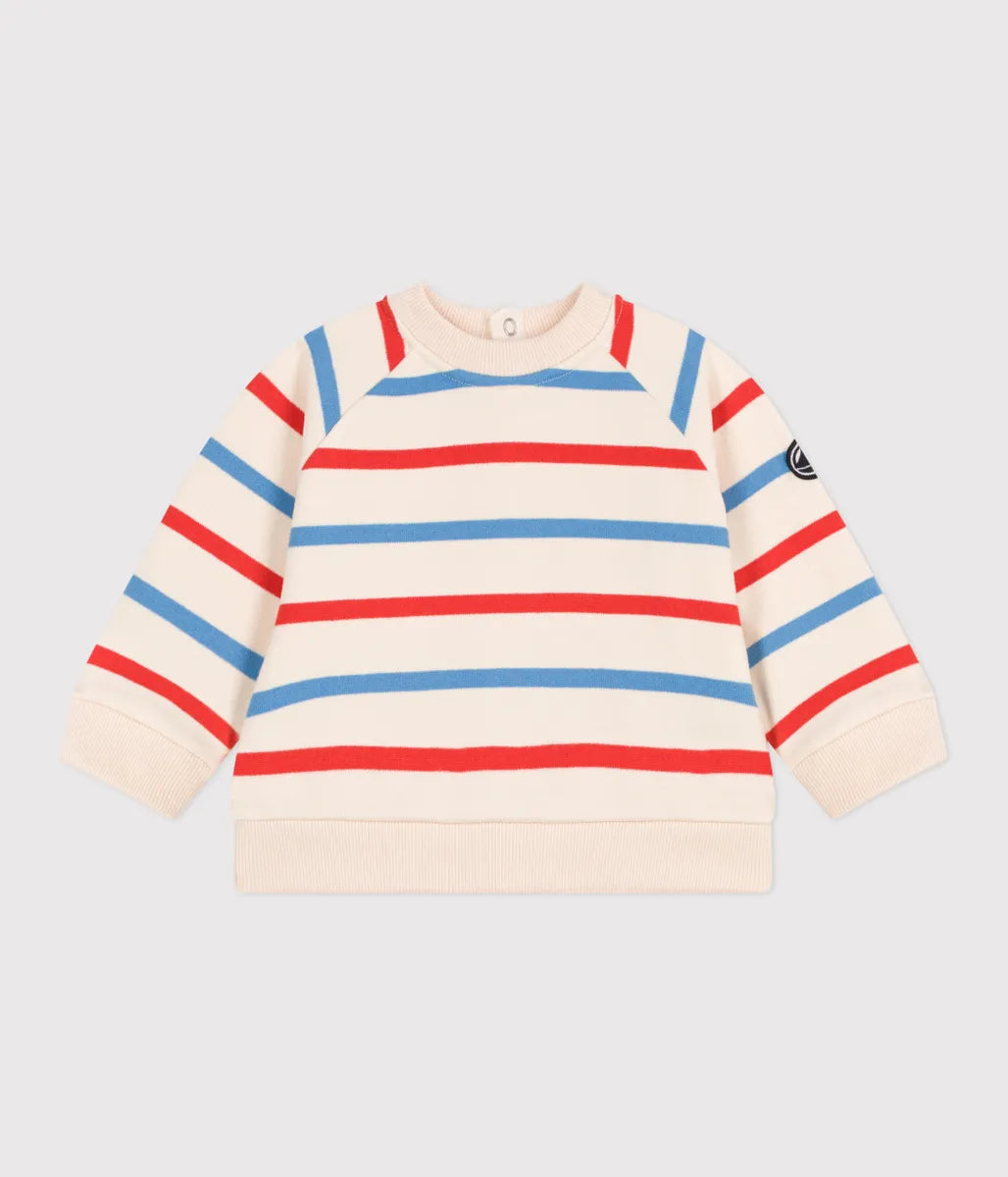 アイコニックなマリニエールボーダーをトリコロールであしらったスウェットプルオーバーです。環境にやさしく、スポーティーな風合いと心地よい肌触りを兼備したコットンスウェット素材を使用し快適な着用感を実現しています。背面にはスナップボタンが施してあるので、外出時のお着替えも安心。カジュアルスタイルの定番としてご自宅用としてはもちろん、ギフトにも喜ばれるおすすめアイテムです。
