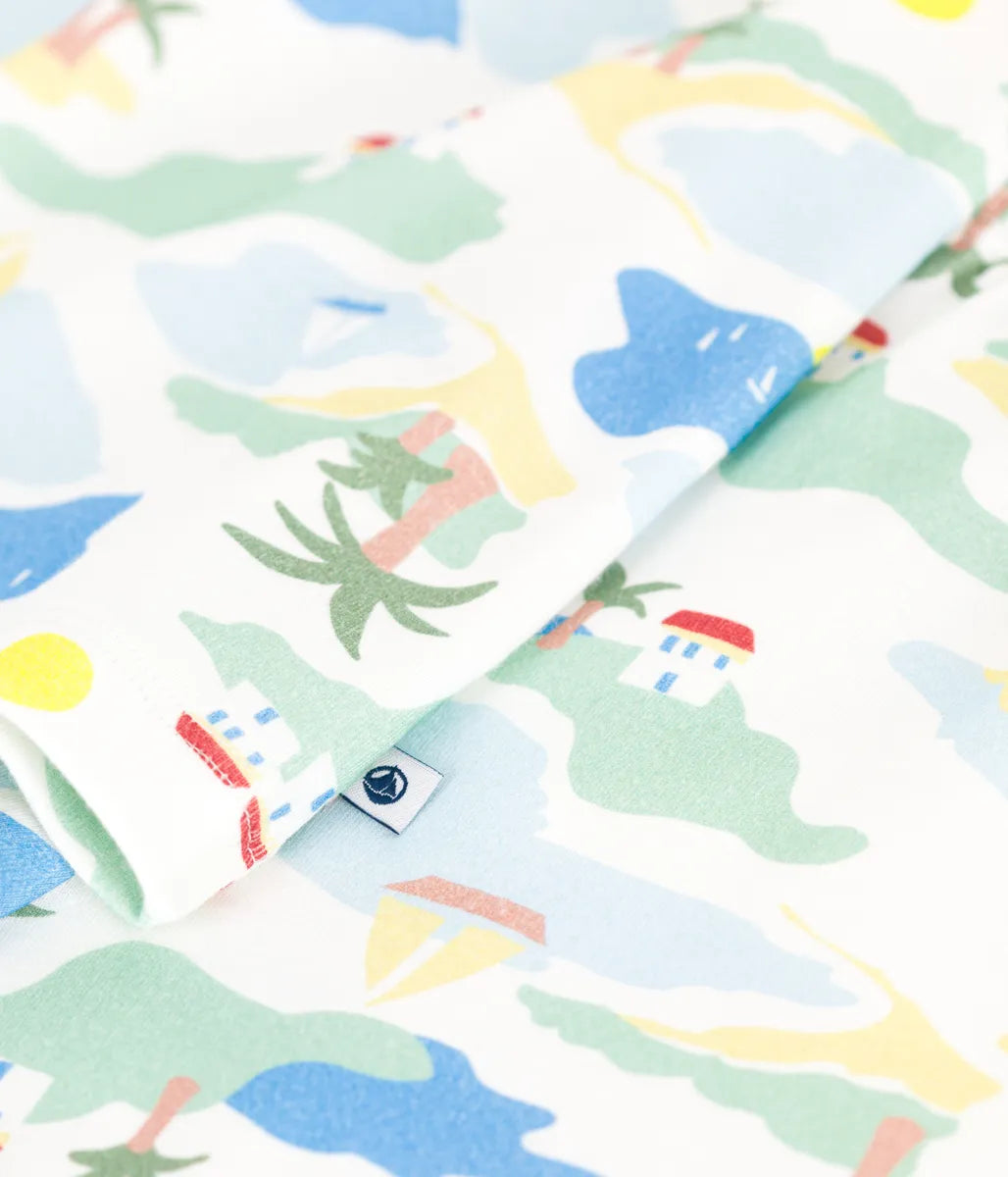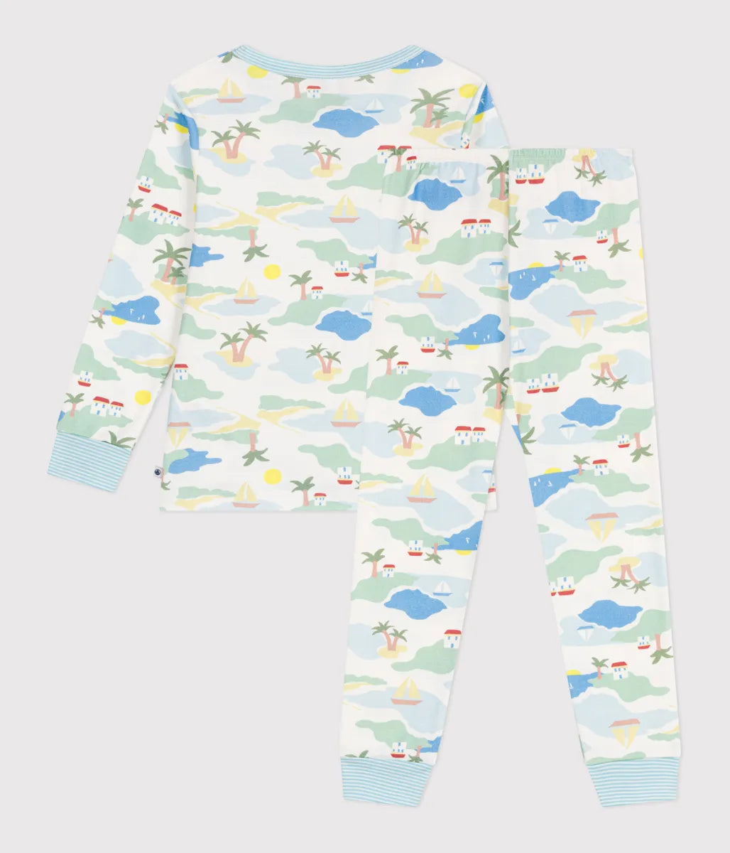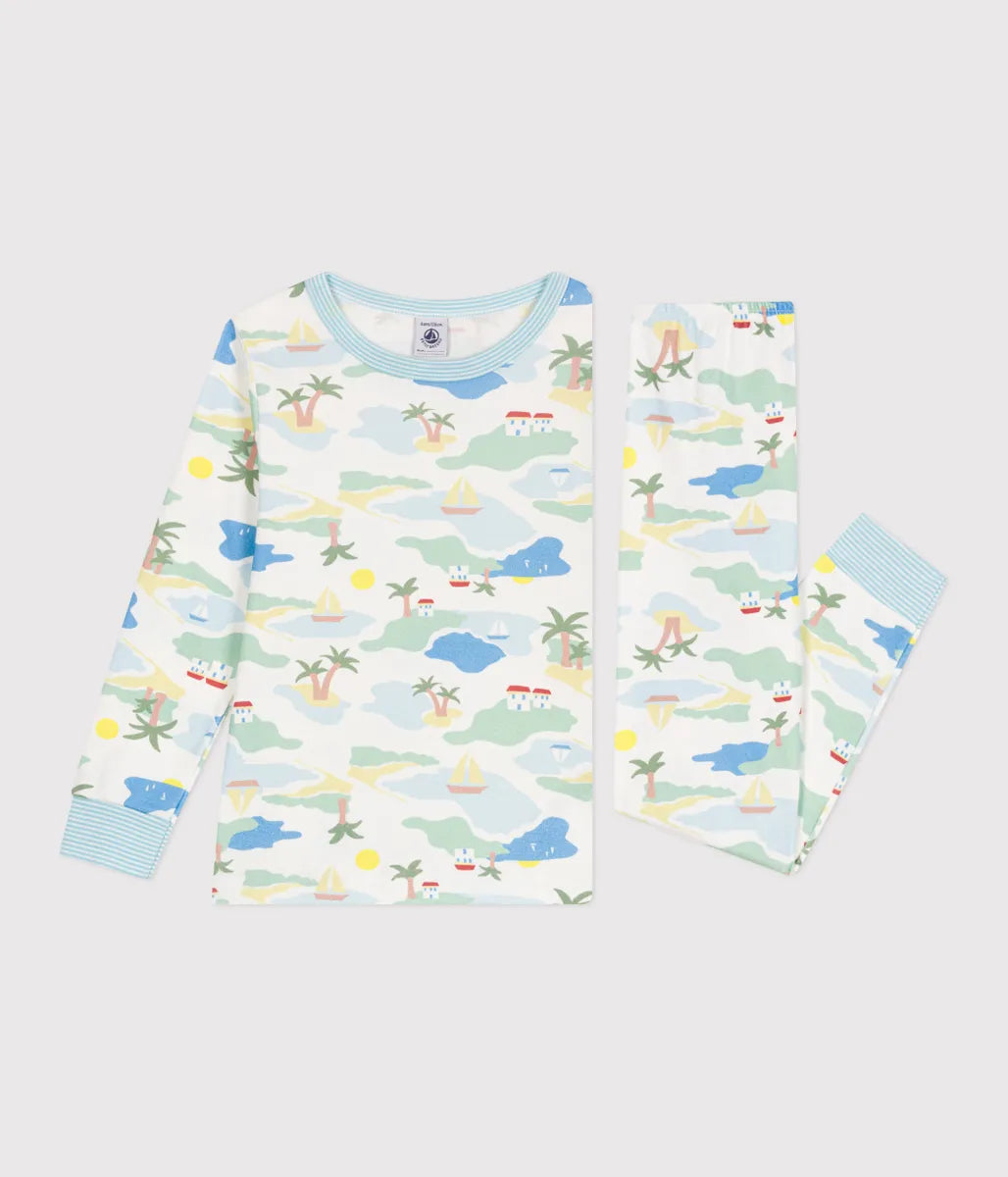 リゾート感ただようアイラインドのプリントが目を引く長袖パジャマです。環境に優しく、第二の肌と呼ばれるほどやわらかな1x1リブ編みコットン素材を使用し、ナチュラルな着心地を実現しました。袖口と裾にあしらわれたミラレボーダーのリブが睡眠時の着崩れを防止。お家でのリラックスタイムから就寝時までを快適に過ごせるおすすめアイテムです。