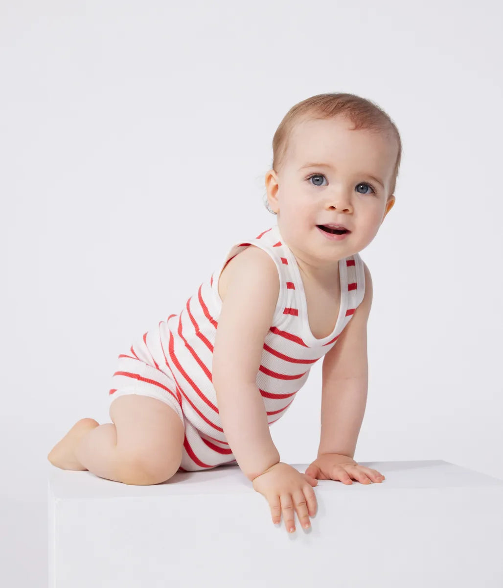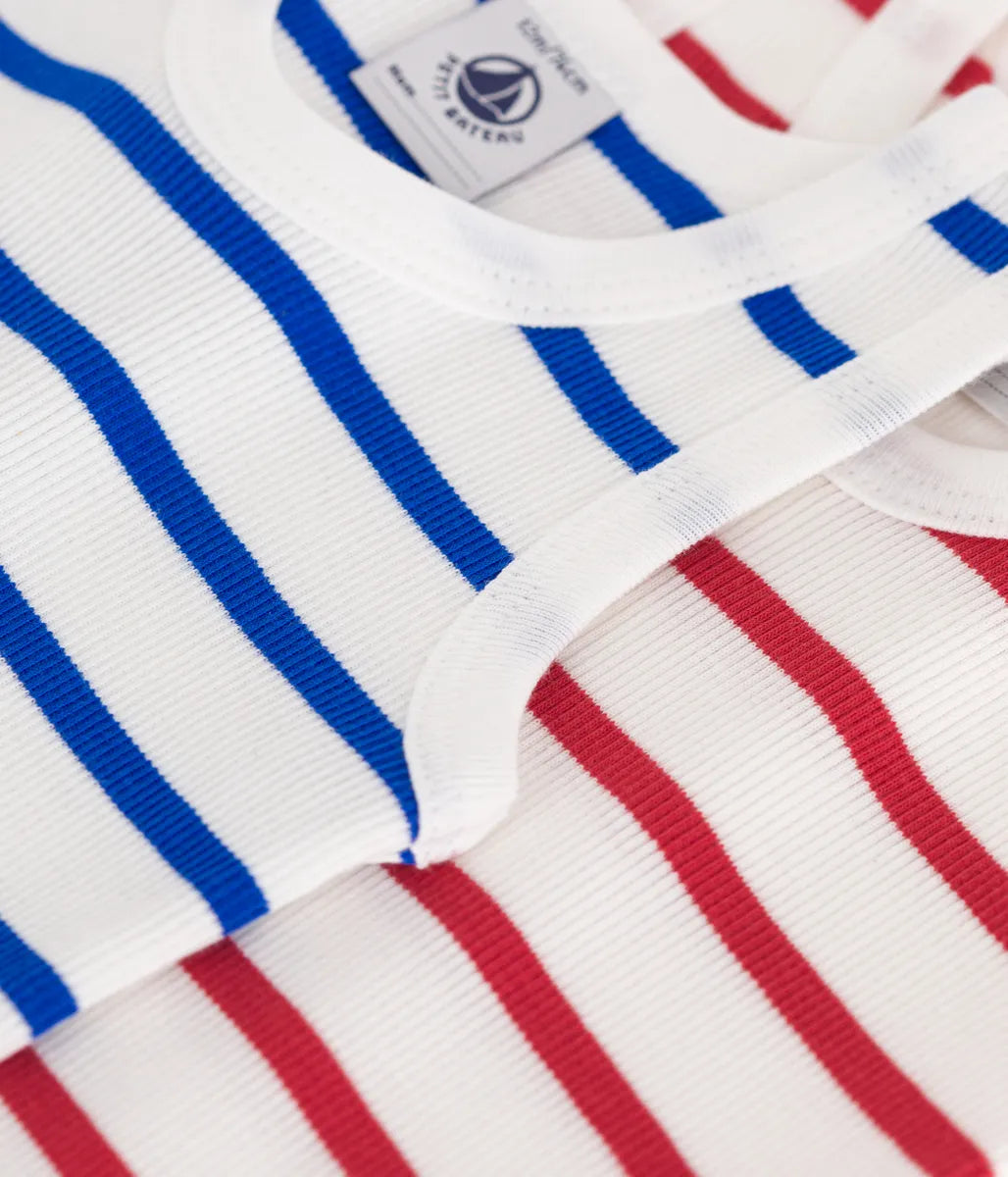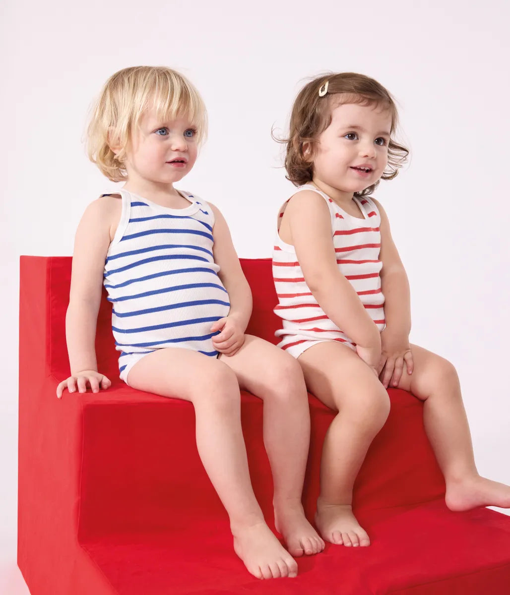 ブランドを代表するマリニエールボーダーを色違いで揃えた、オンラインブティック限定のタンクトップボディ2枚セットです。環境にやさしいオーガニックコットン、高い伸縮性とさらりとした肌触りが特徴の2×2リブ編み素材を使用し、快適な着心地を実現しています。ベーシックなデザインはアンダーウェアとしてや、タンクトップのように見せて着られるのが魅力。また、股下が大きく開くので、お着替えも簡単。ユニセックスで使えるアイテムは、ご自宅用としてはもちろん、ご出産祝いなどのギフトとしてもおすすめです。