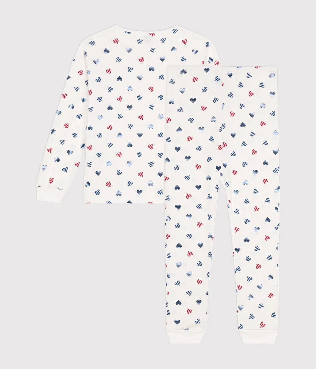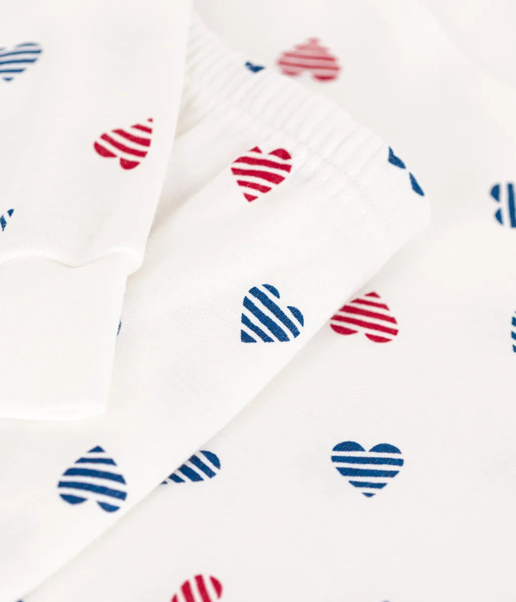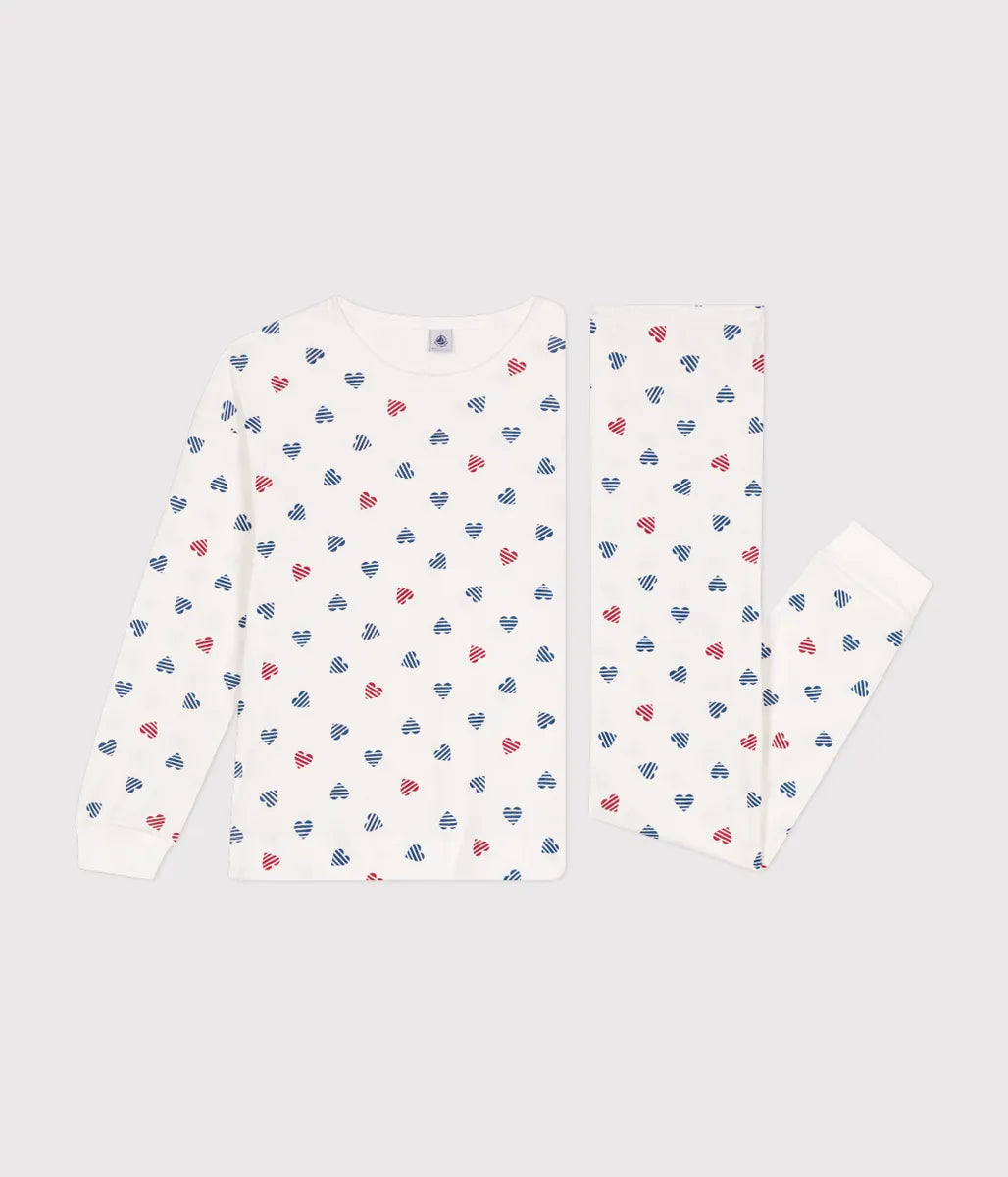 ボーダーのハート柄がとってもキュートな長袖パジャマです。環境にやさしく、第二の肌と呼ばれるやわらかな手触りの1×1リブ編み素材を使用し快適な着心地を実現しています。袖口と裾にあしらわれたリブが心地良いフィット感を提供。おうちでのリラックスタイムから就寝時までを快適に過ごせる、おすすめのアイテムです。