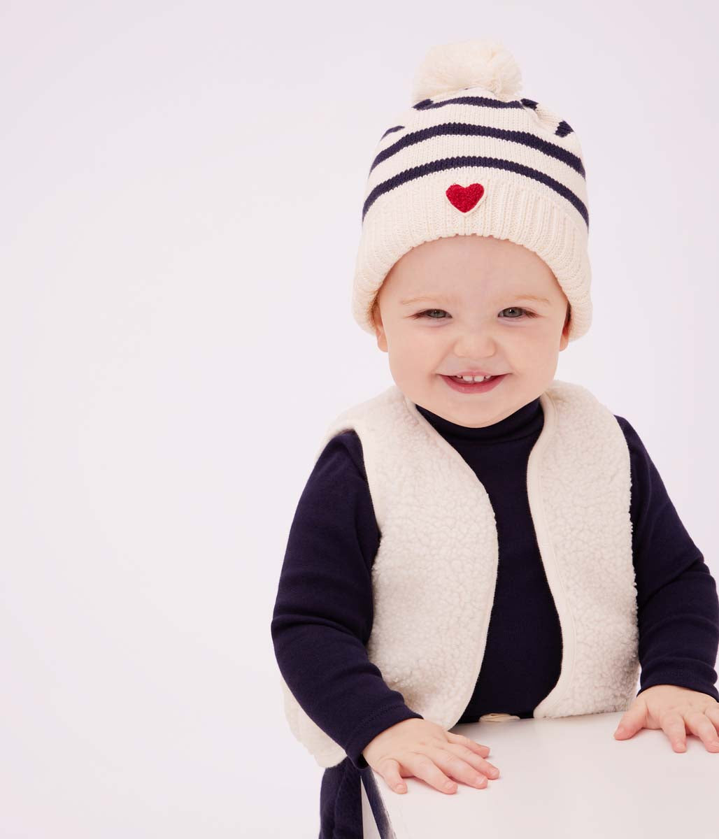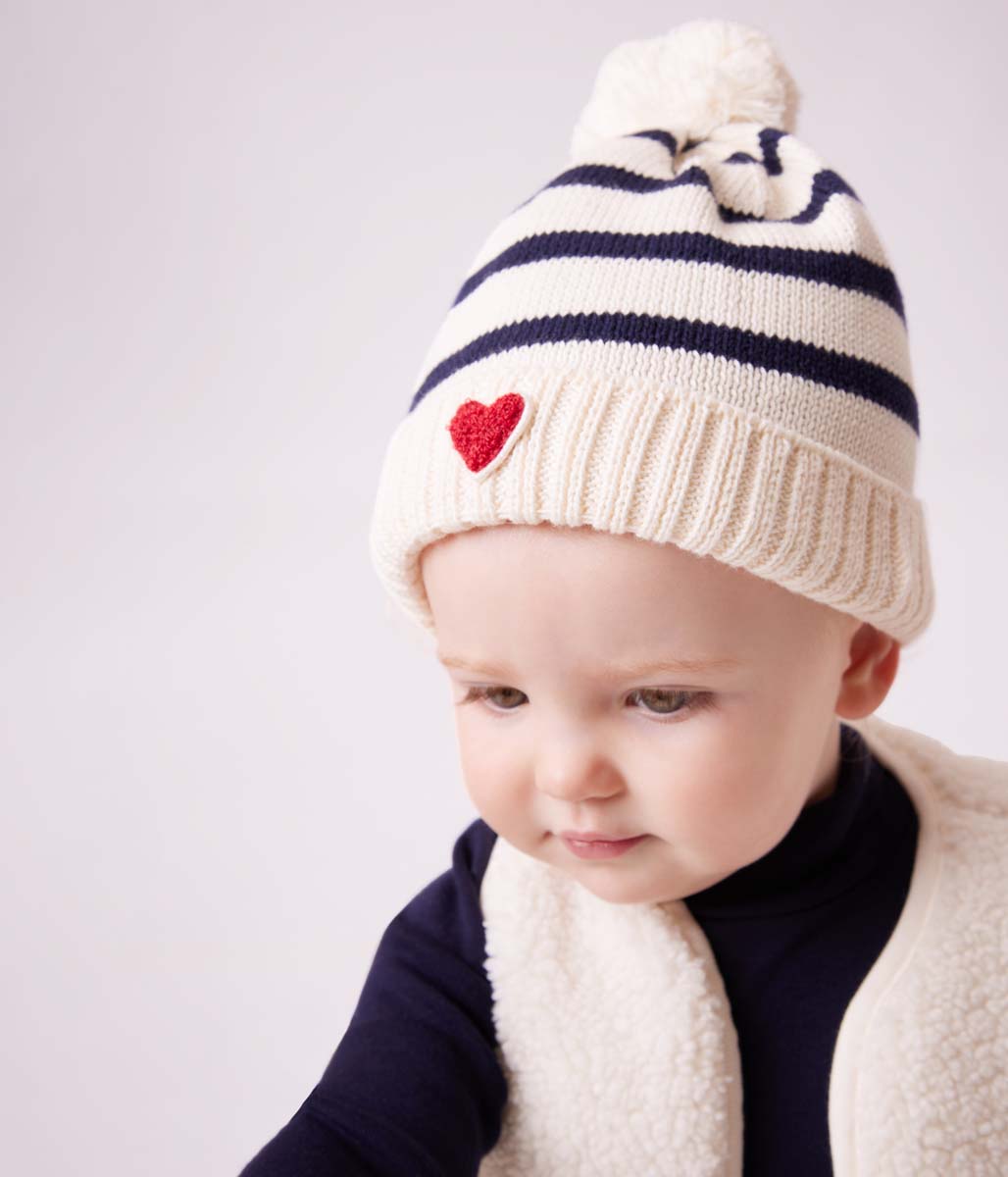 冬の寒さからベビーの頭部を守ってくれる、マリニエールボーダーのニットキャップです。伸縮性のあるニット素材を使用した快適なかぶり心地も魅力です。真っ赤なハートのワッペンが、愛らしいアクセントに効いています。あたたかくおしゃれなアイテムは、ご自宅用としてはもちろん、出産祝いなどのギフトにもおすすめ。