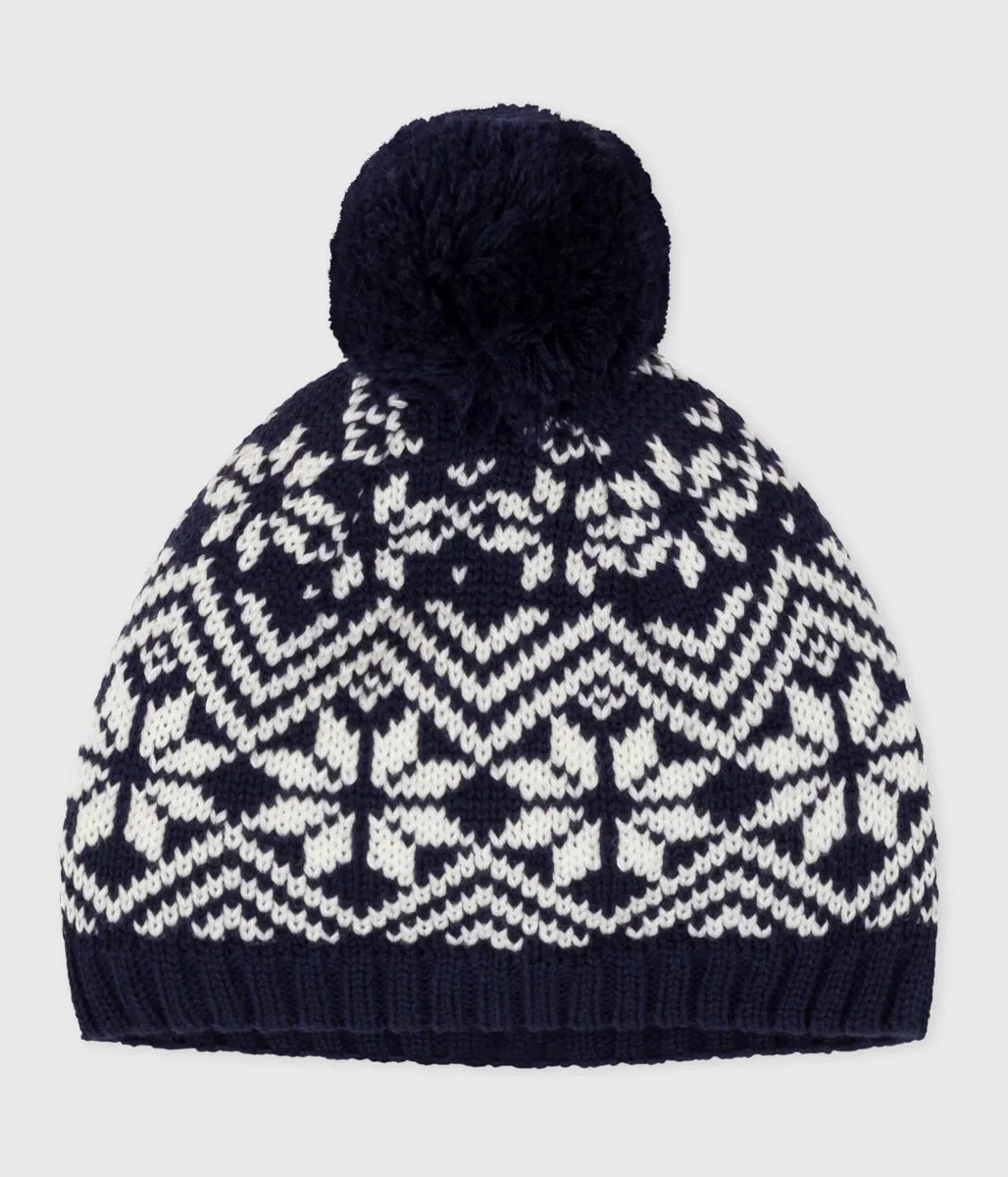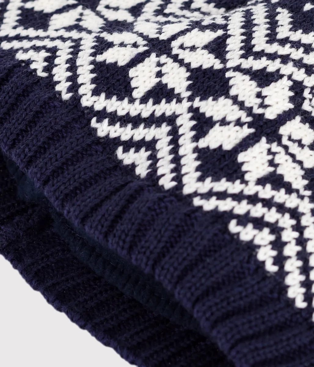 冬気分を満喫できる、ノルディック柄が特徴的なニットキャップです。環境や動物にやさしく、温かな肌触りのウールと混紡素材を編み上げた素材を使用しています。ポンポンが特徴的で、コーディネイトのアクセントにもぴったり。冬の寒さからベビーの頭部を優しく守る、おすすめのひと品です。