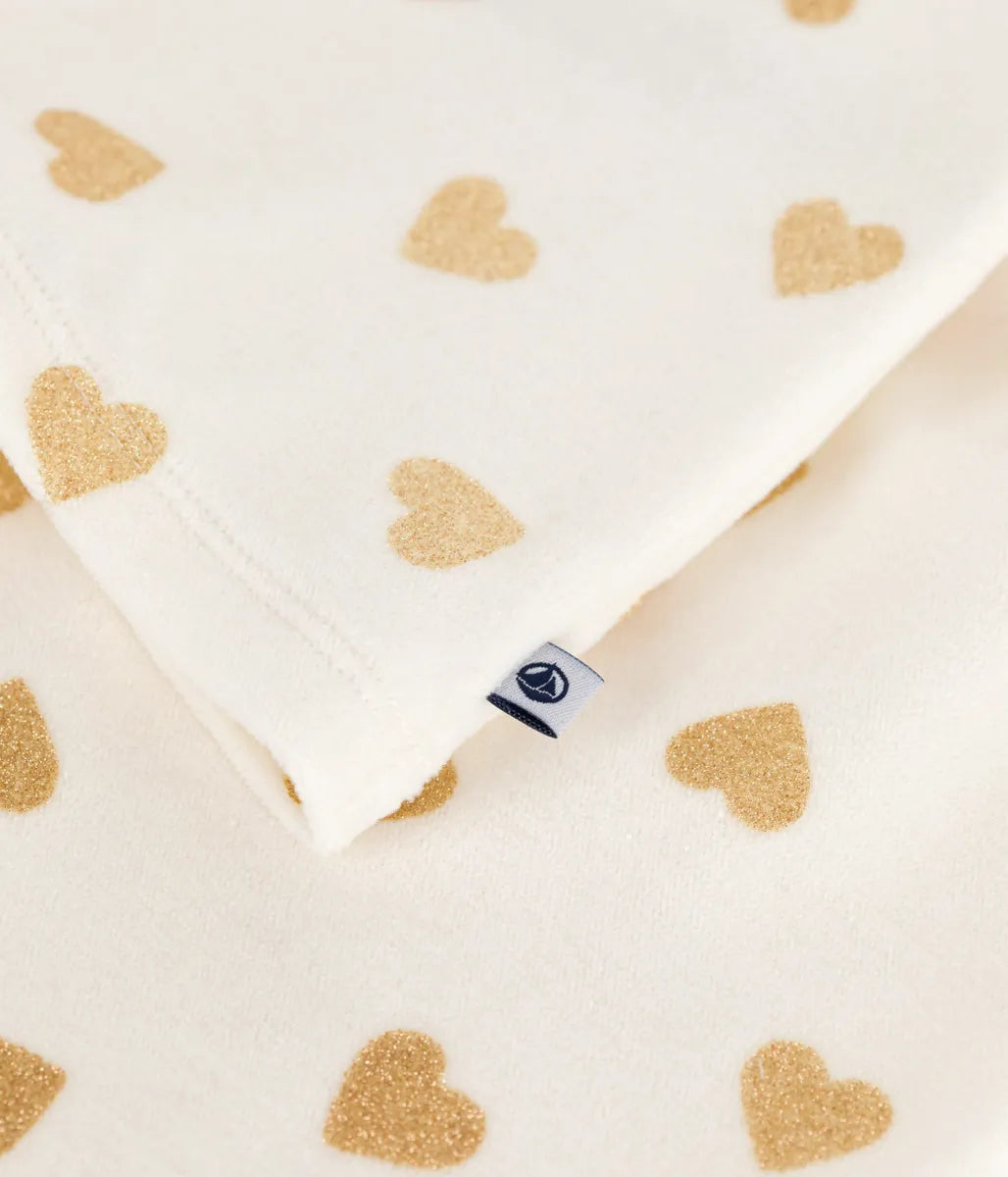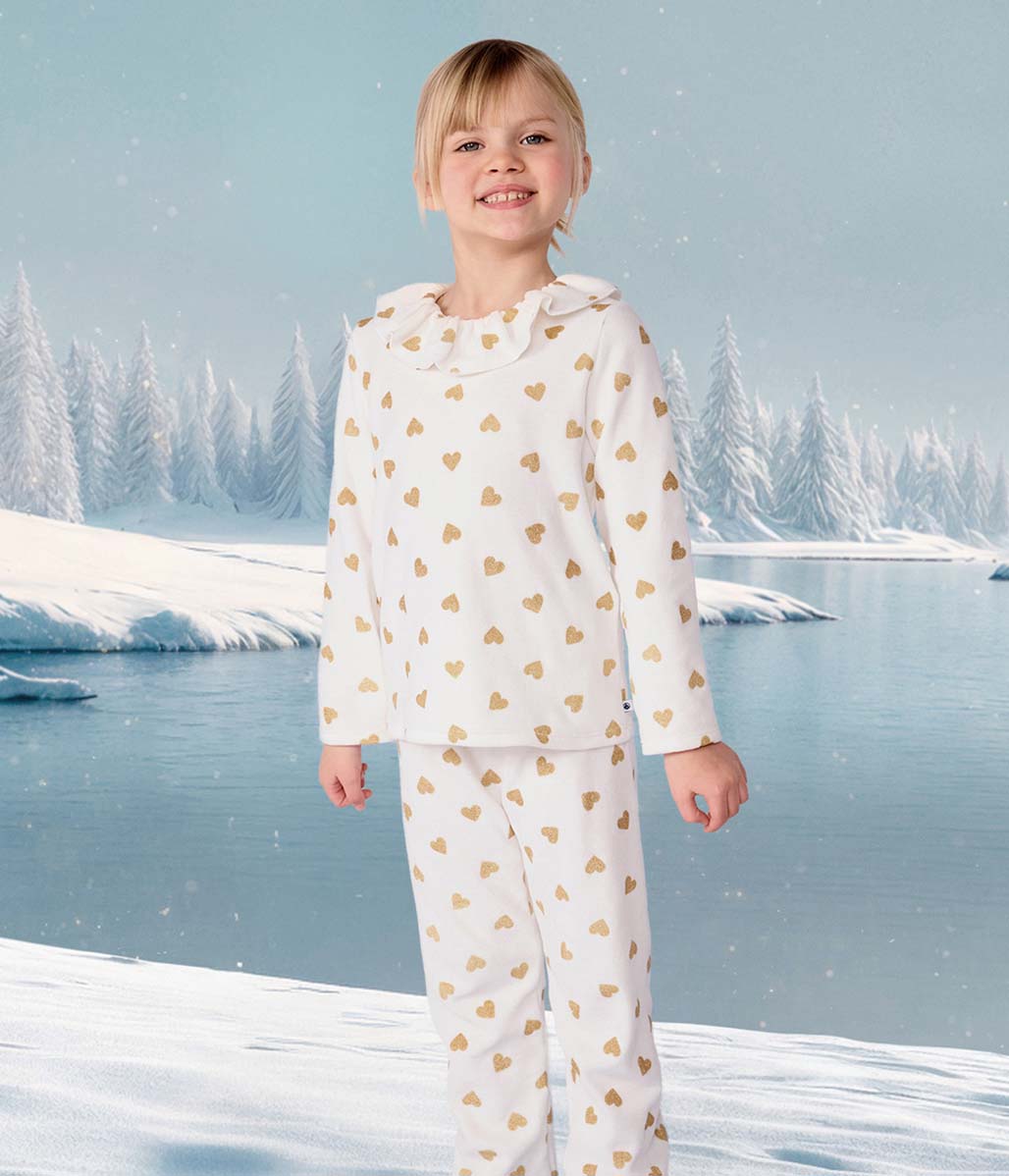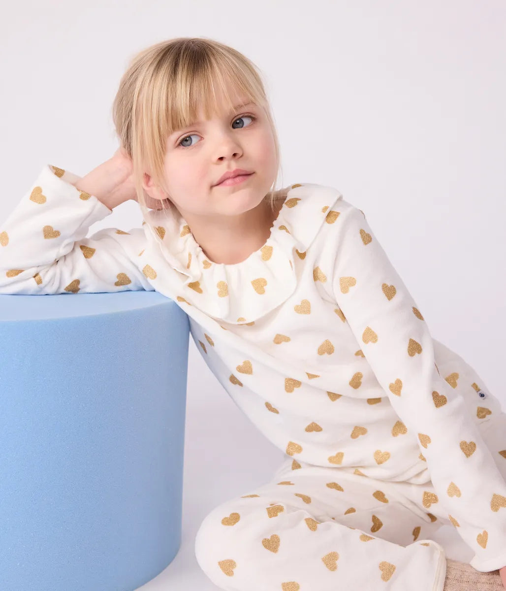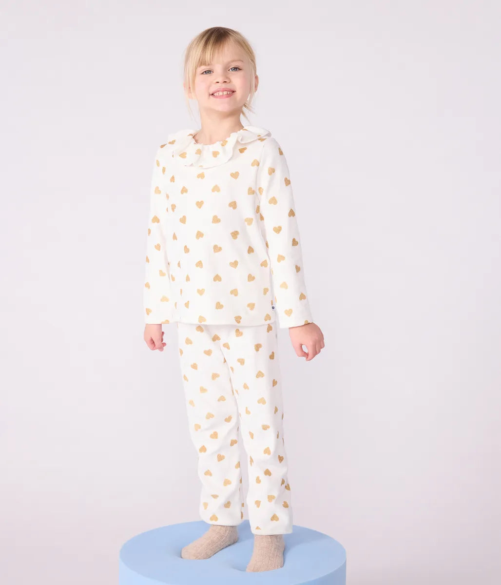 人気のラメ入りハート柄がかわいい長袖パジャマです。環境に配慮したオーガニックコットン、滑らかなで艶っぽいベロア素材を使用し、快適な着心地を実現。愛らしいフリル衿がミニマルなデザインのアクセントに効いています。お家でのリラックスタイムから就寝時までを快適に過ごせるおすすめのアイテムです。
