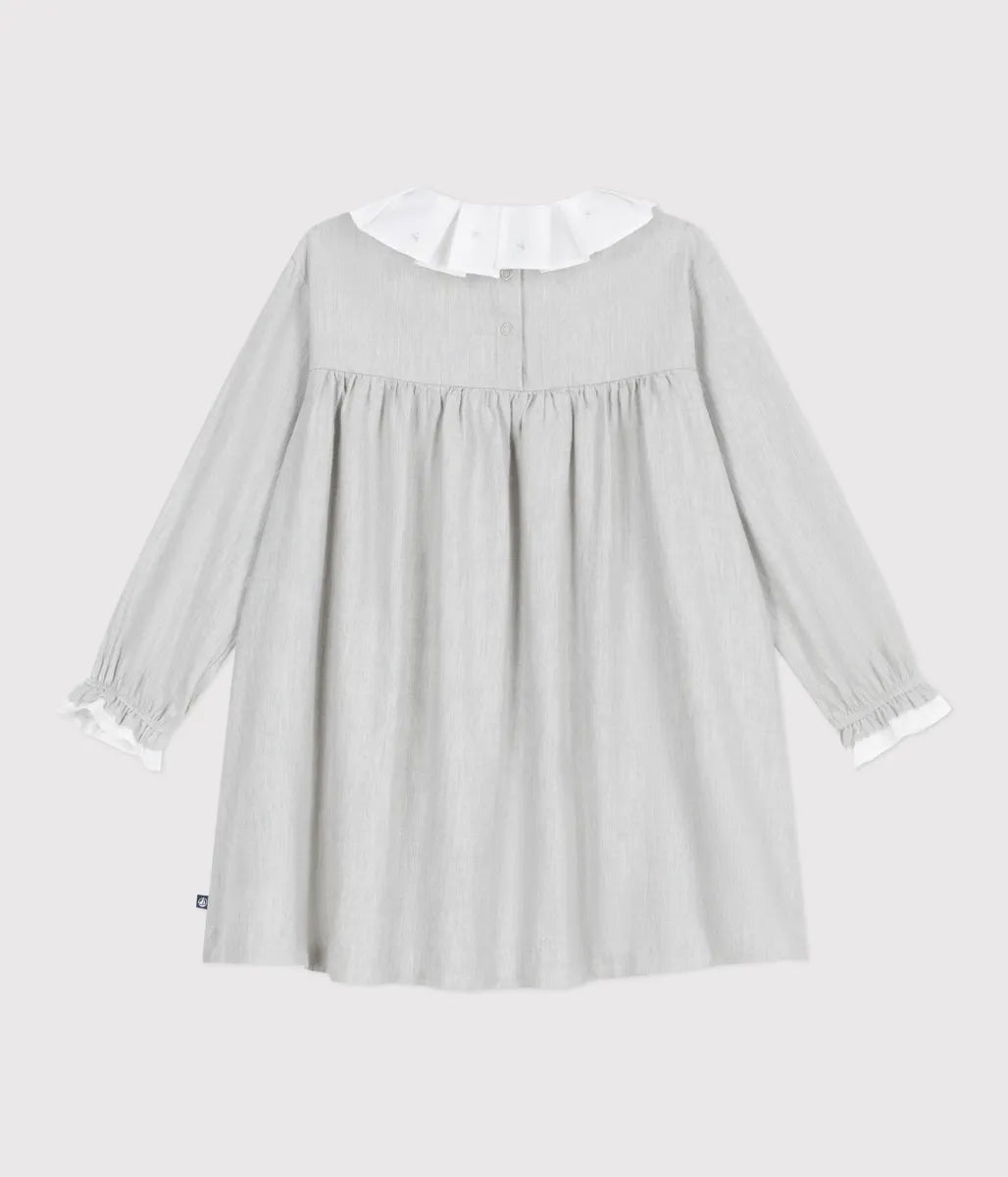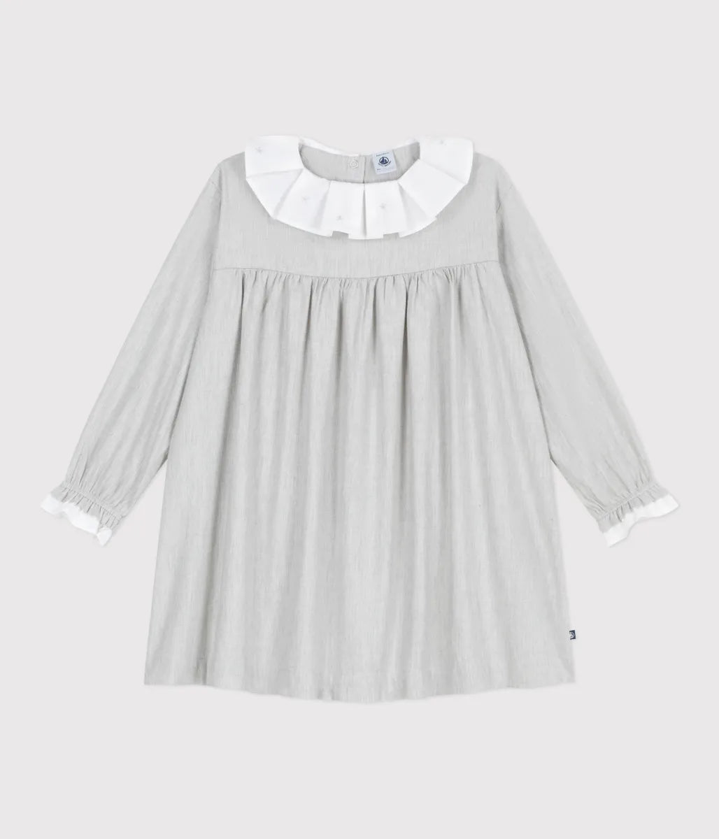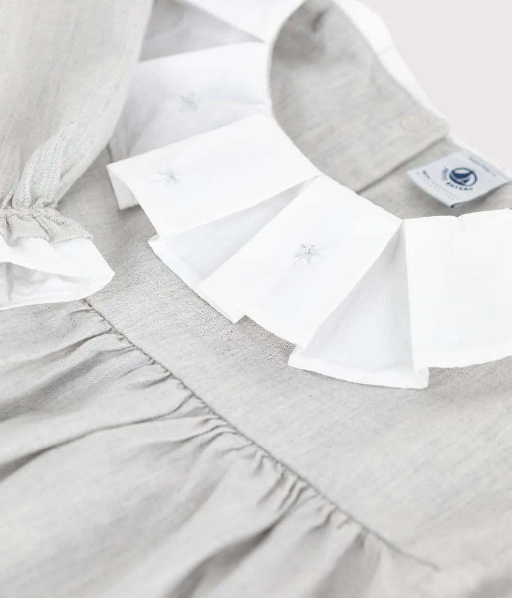 清楚な雰囲気が印象的な長袖ワンピースです。環境にやさしい、上質なオーガニックコットンの布帛素材を使用したやわらかな着心地に定評があります。シルバーの星刺繍をあしらったフリル衿がデザインのキュートなアクセントに。これ一枚でおしゃれが叶う、注目のアイテムです。