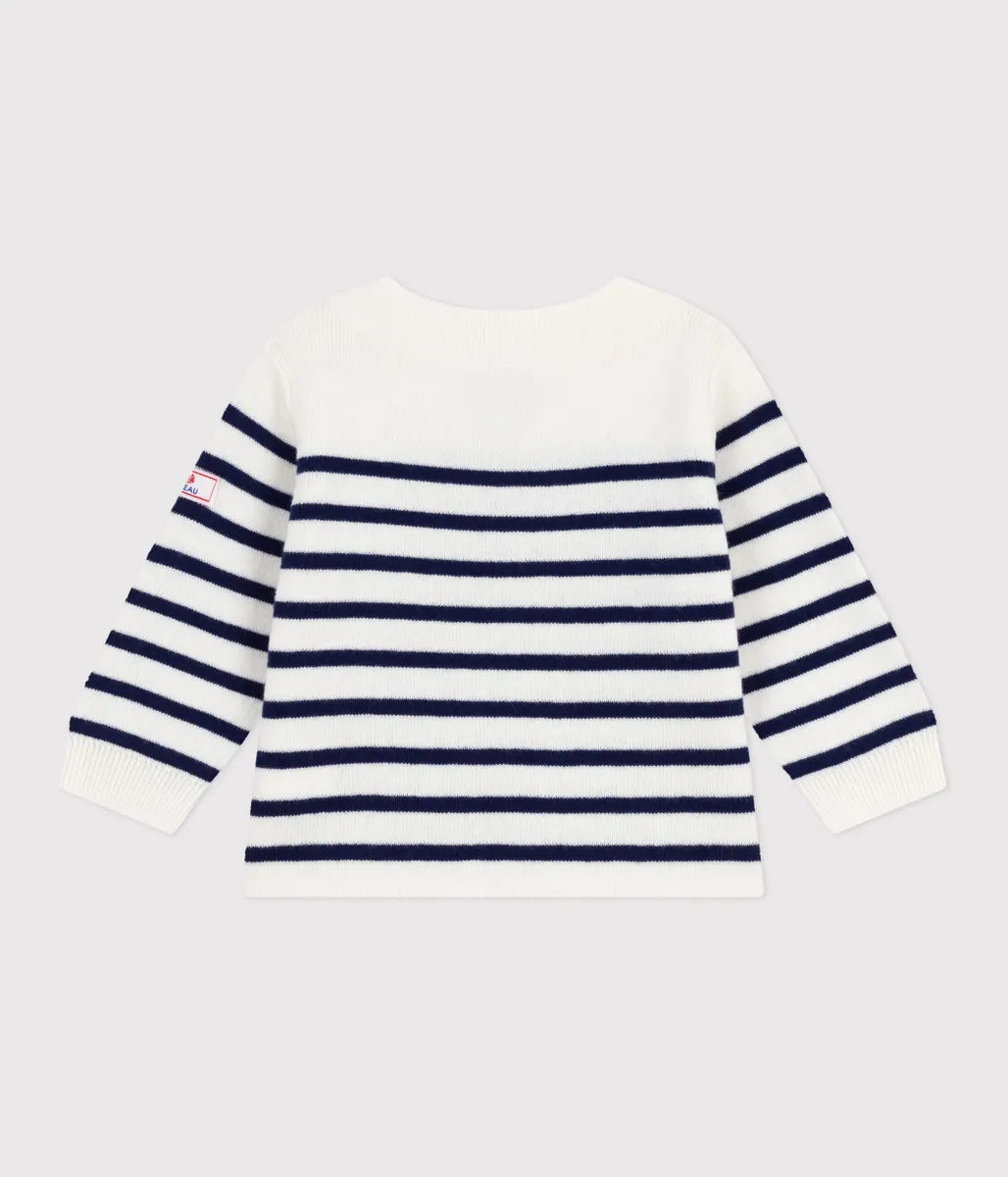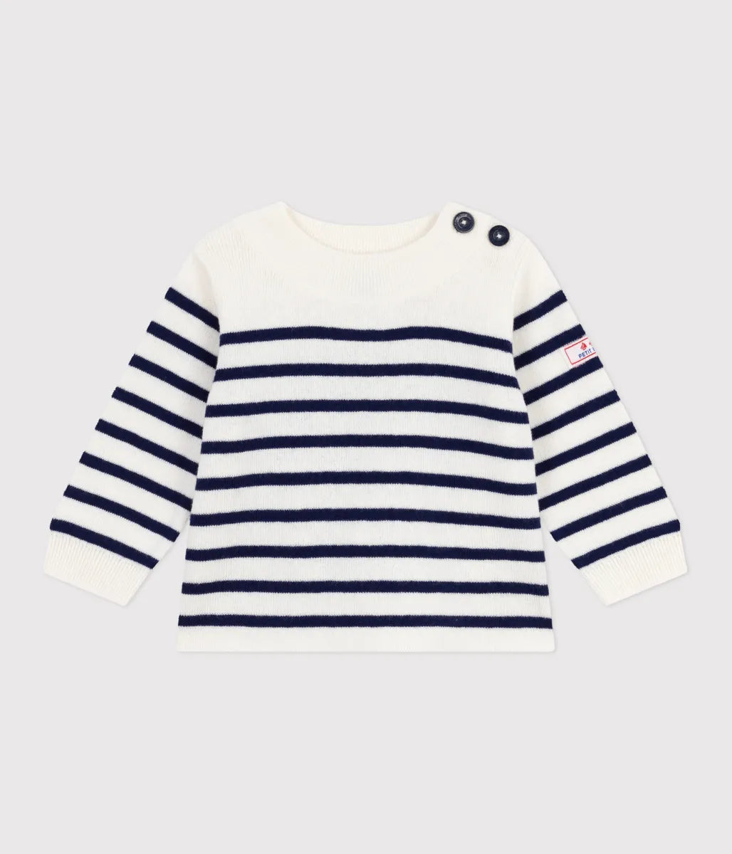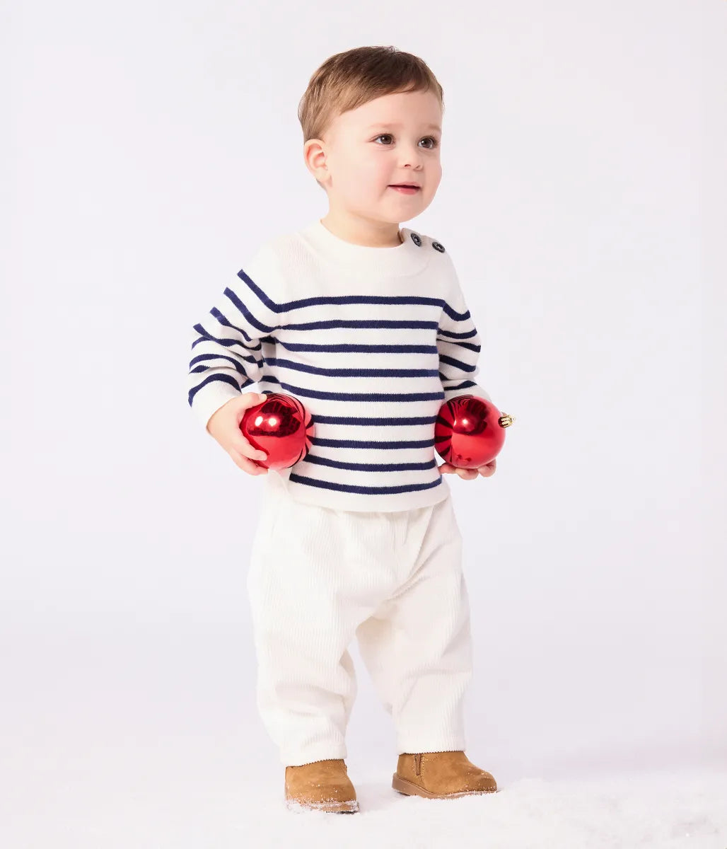 ブランドを象徴するマリニエールボーダーに、赤いラインのアクセントを効かせたニットプルオーバーです。やわらかな肌あたりが魅力のウール混素材を使用し、秋冬の装いにぬくもりをプラス。左肩のボタンがさりげないデザインポイントでありながら、着脱のしやすさも兼ね備えた実用的な一枚。袖にあしらわれたロゴタグがフレンチブランドならではのアイデンティティを主張します。きょうだいで合わせたコーディネイトも楽しめるおすすめのアイテムです。