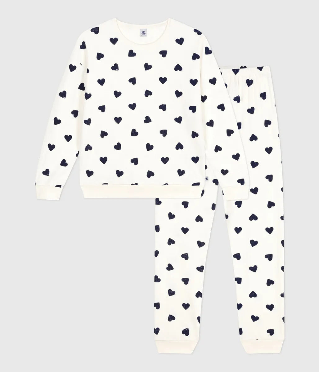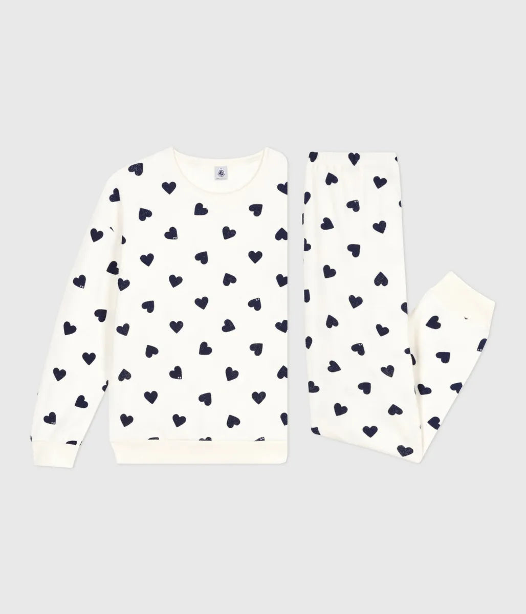 人気のハート柄がかわいい長袖パジャマです。環境にやさしく、やわらかく伸縮性に富んだパイル素材を使用し、快適な着心地が人気。胸のロゴパッチがミニマルなデザインのアクセントに効いています。親子で合わせたお家タイムも楽しめるおすすめのアイテムです。
