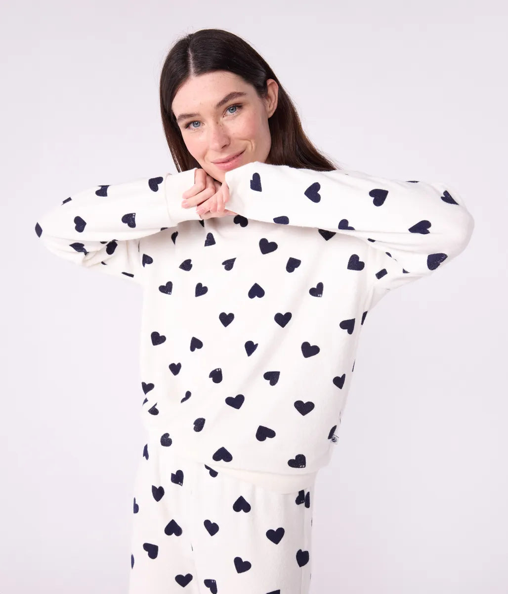 リラックスタイムを彩る、かわいいハート柄の長袖パジャマ