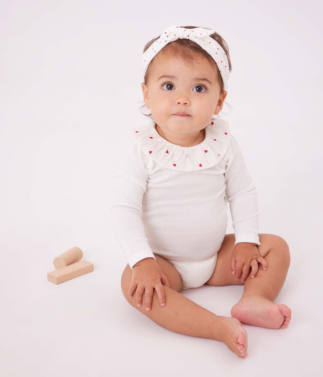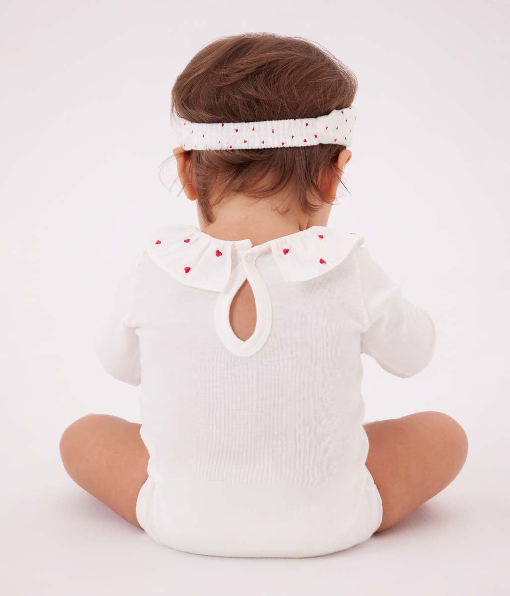 シンプルなプレーンカラーの衿付き長袖ボディです。環境にやさしいオーガニックコットン、第二の肌と呼ばれるほどやわらかな手触りの1×1リブ編み素材を使用しています。ハート刺繍をあしらった可愛らしい丸衿がデザインのアクセントに効いています。背面には取り外ししやすいスナップボタンを施してあるので、外出先などでのお着替えも簡単な、パパやママも安心なおすすめアイテムです。