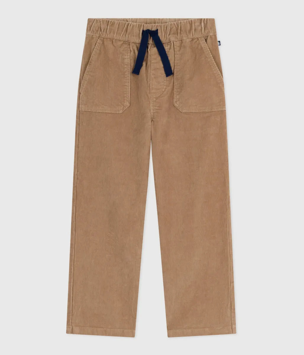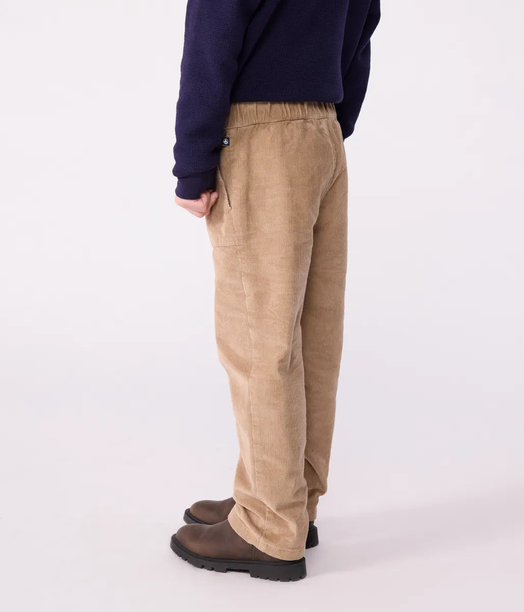 合わせやすいベージュとバーガンディの2色を用意した、コーデュロイ調の縦畝が特徴のパンツです。滑らかで艶っぽいベロア素材を使用しています。 ネイビーのドローストリングやパッチポケットが、シンプルなデザインのアクセントに効いています。快適な穿き心地がデイリーで活躍する、ワードローブのマストアイテムです。