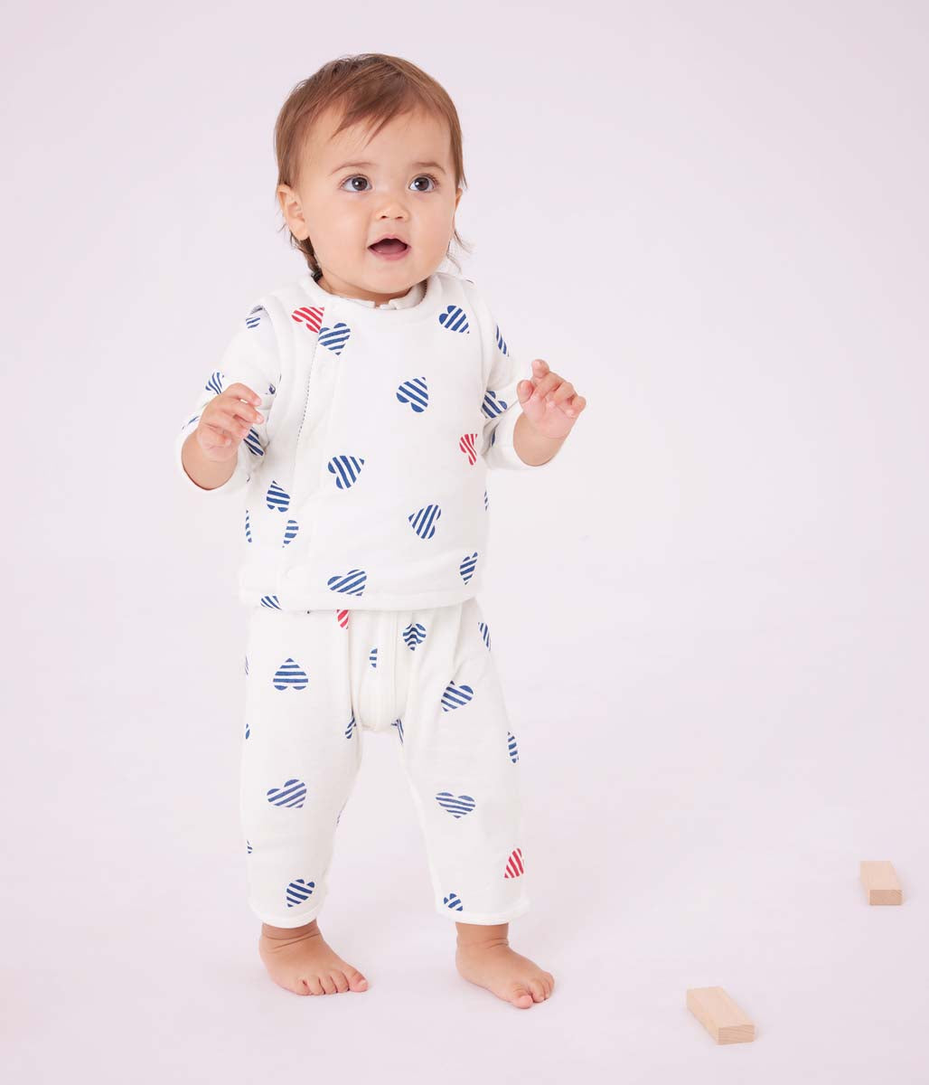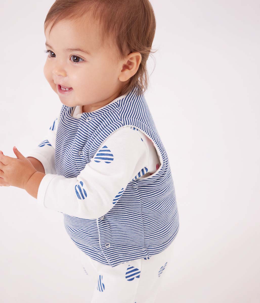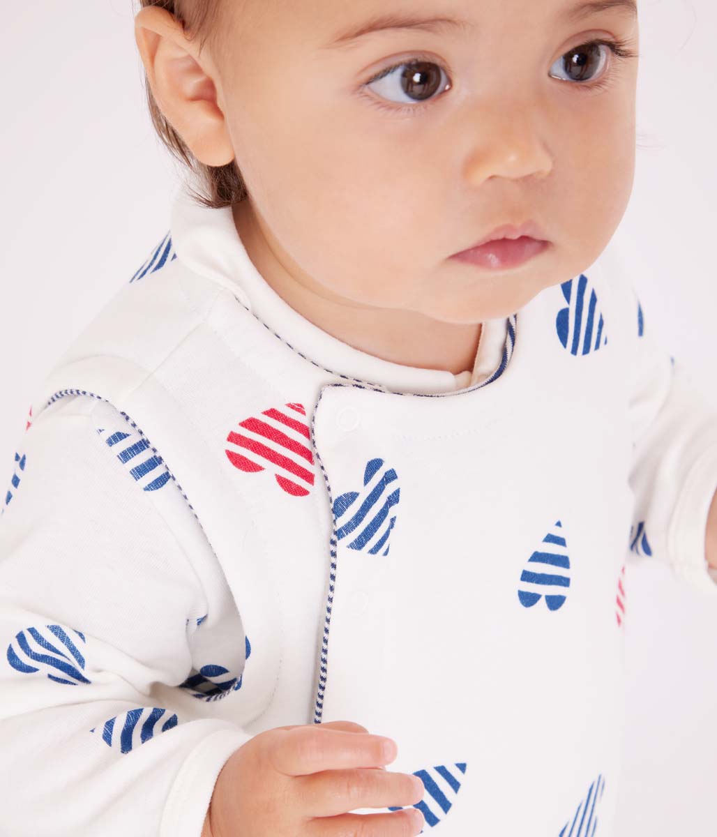 ハートプリントをあしらった合わせタイプのベストです。裏地にあしらったアイコニックなミラレボーダがデザインのアクセント。リバーシブルで着用いただけます。一枚あるととても便利で自家用はもちろん、ギフトにも喜ばれるアイテムです。