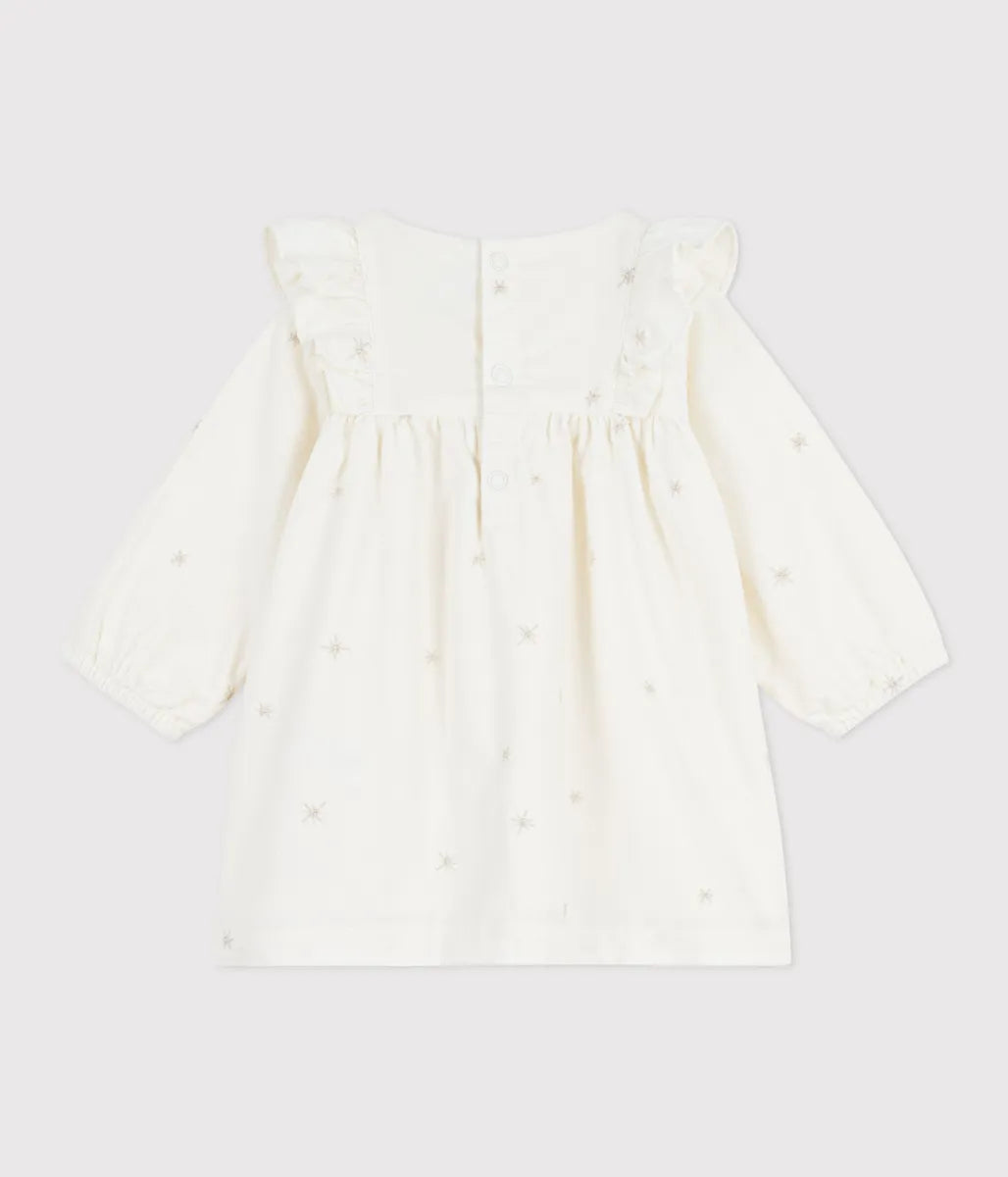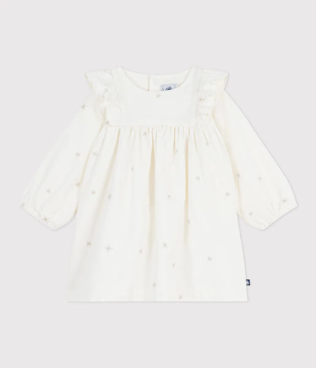 煌めく星が愛らしいフリル付きワンピースです。シルエットの変化を楽しめる切り替えがデザインのポイント。ご出産祝いなどの贈り物として、またおしゃれをしての外出が待ち遠しくなる今季おすすめのアイテムです。