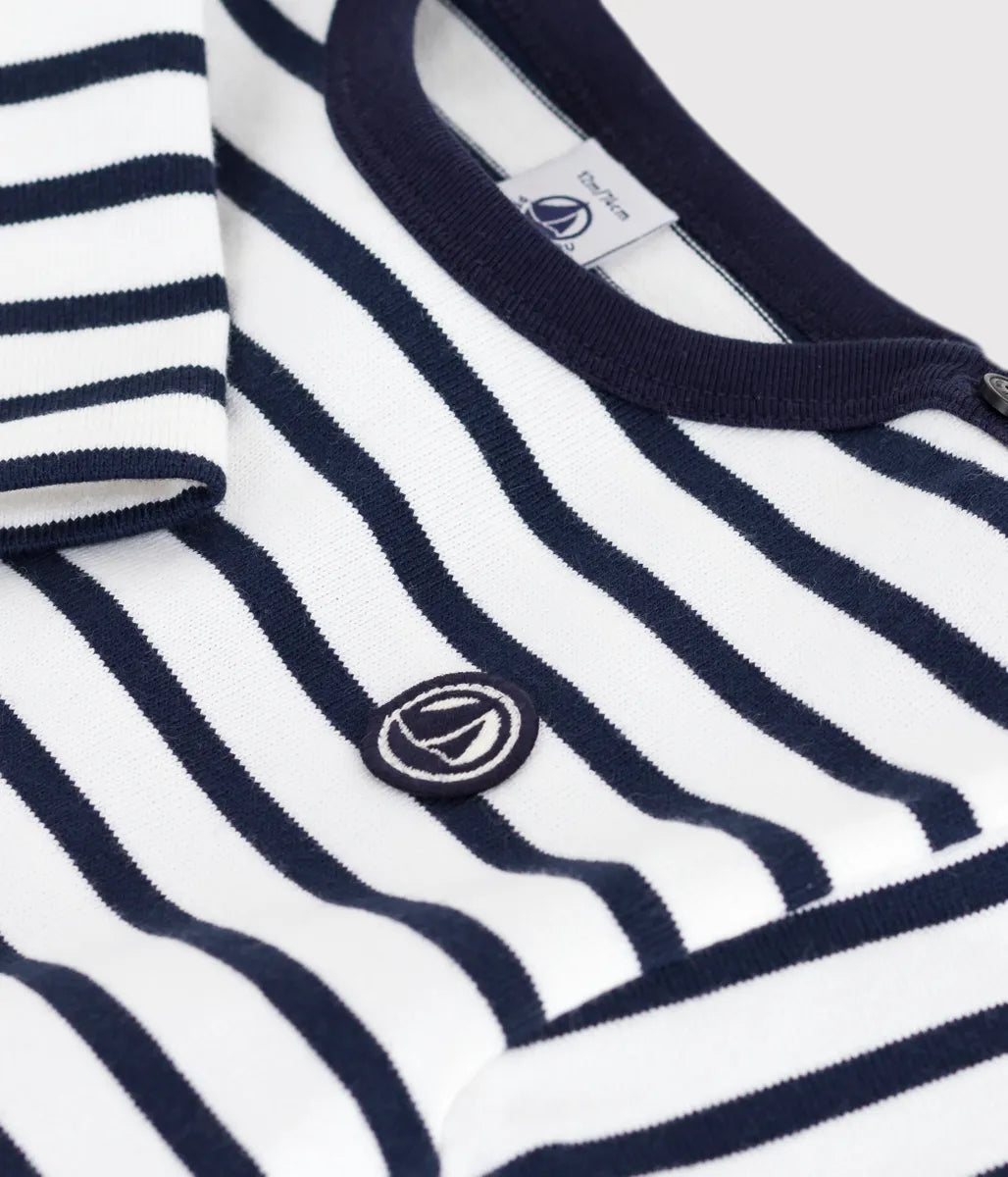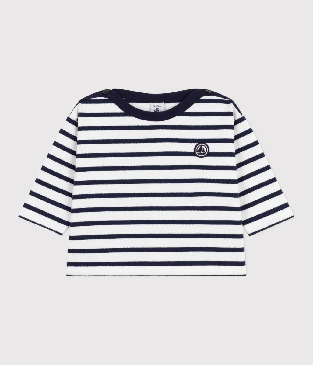 ブランドを代表するマリニエールボーダーを、プチバトーらしいネイビーとホワイトで配色した長袖プルオーバーです。環境にやさしく適度な張りが型崩れしにくい平編み素材を使用した快適な着心地が人気。ワンポイントのブランドロゴパッチがデザインのアクセントに目を引きます。幅広いアイテムと相性がよく、これ一枚でフレンチマリンルックが完成するベーシックなアイテムです。