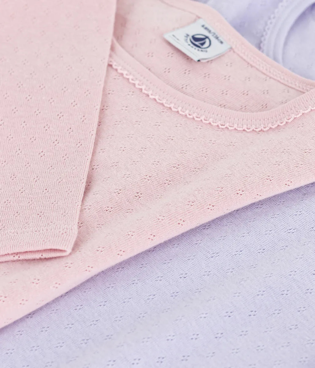 エレガントな針抜き模様をあしらい、ピンク、パープルの2色を揃えた厳選オーガニックコットン製長袖Tシャツ2枚セットです。ピコレースとリボンがデザインのアクセントに効いています。これ一枚でもインナーとしても活躍する便利なアイテムは、ご自宅用としてはもちろん、ギフトにも大変喜ばれます。