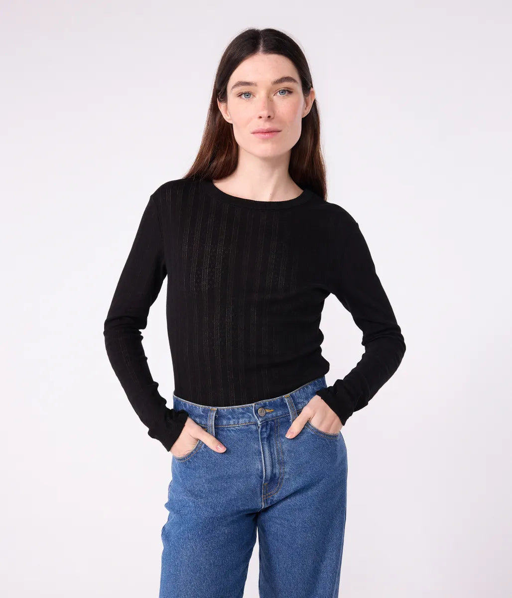 コーディネイトしやすい、ブラックとホワイトを用意した長袖Tシャツです。品のある針抜き模様と程よく体にフィットするきれいなシルエットが特徴的。裾にあしらわれた同系色のブランドロゴプリントがさりげないアクセントに利いています。あらゆるスタイルと相性がいい、シーズンを通して着回せるおすすめのアイテムです。