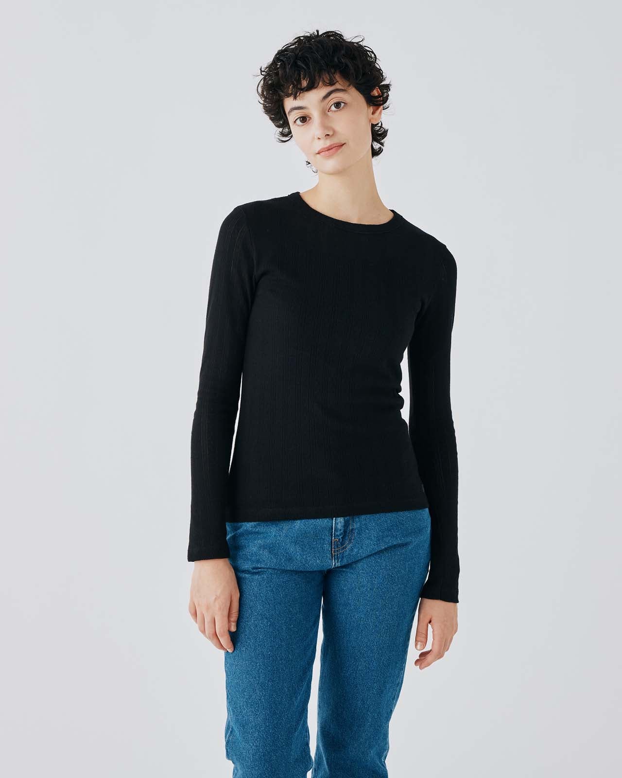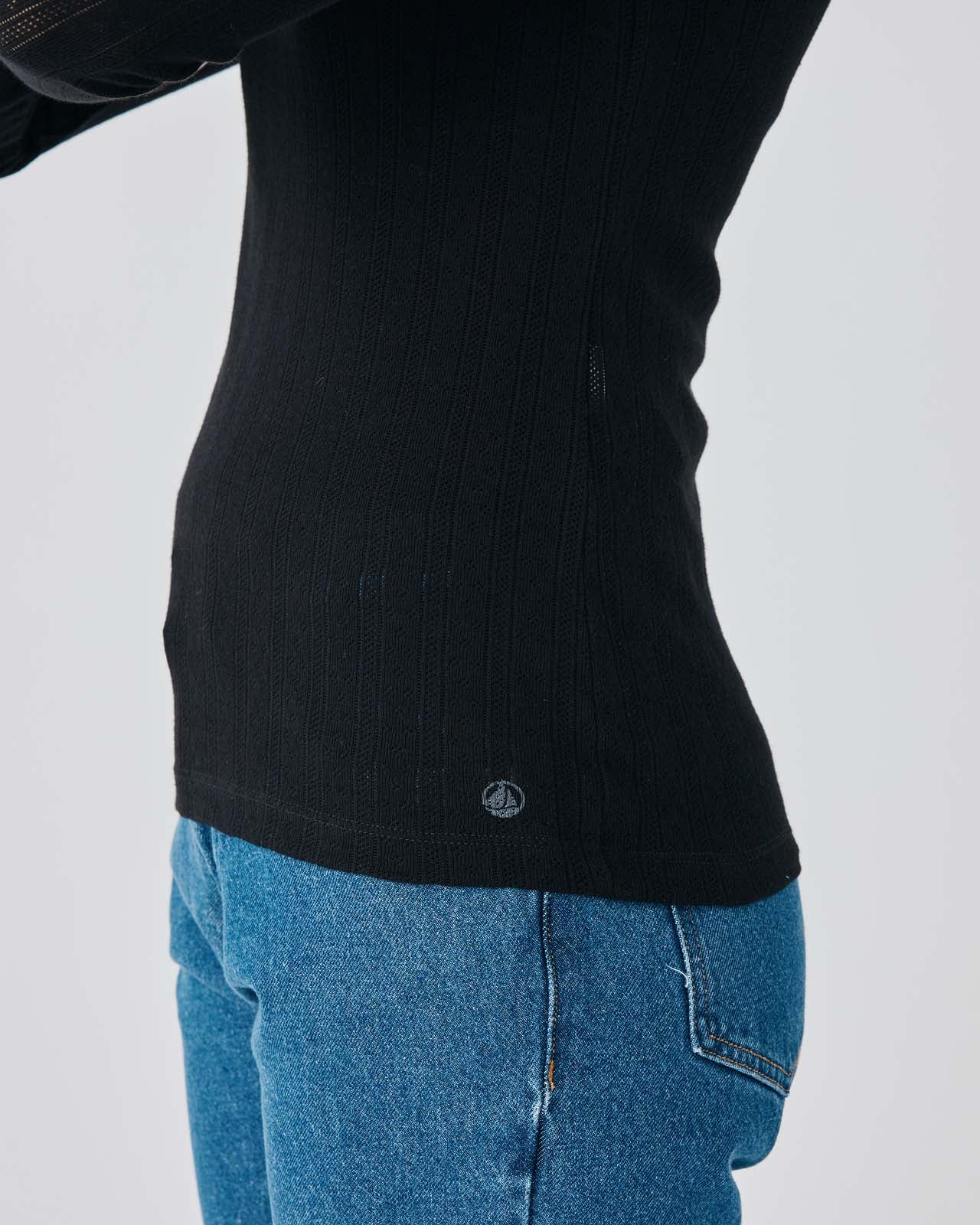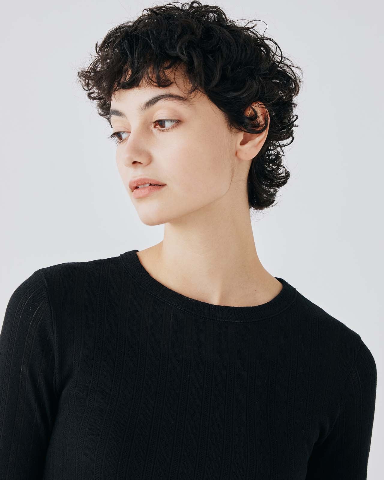 コーディネイトしやすい、ブラックとホワイトを用意した長袖Tシャツです。品のある針抜き模様と程よく体にフィットするきれいなシルエットが特徴的。裾にあしらわれた同系色のブランドロゴプリントがさりげないアクセントに利いています。あらゆるスタイルと相性がいい、シーズンを通して着回せるおすすめのアイテムです。Lサイズのみオンライン限定。