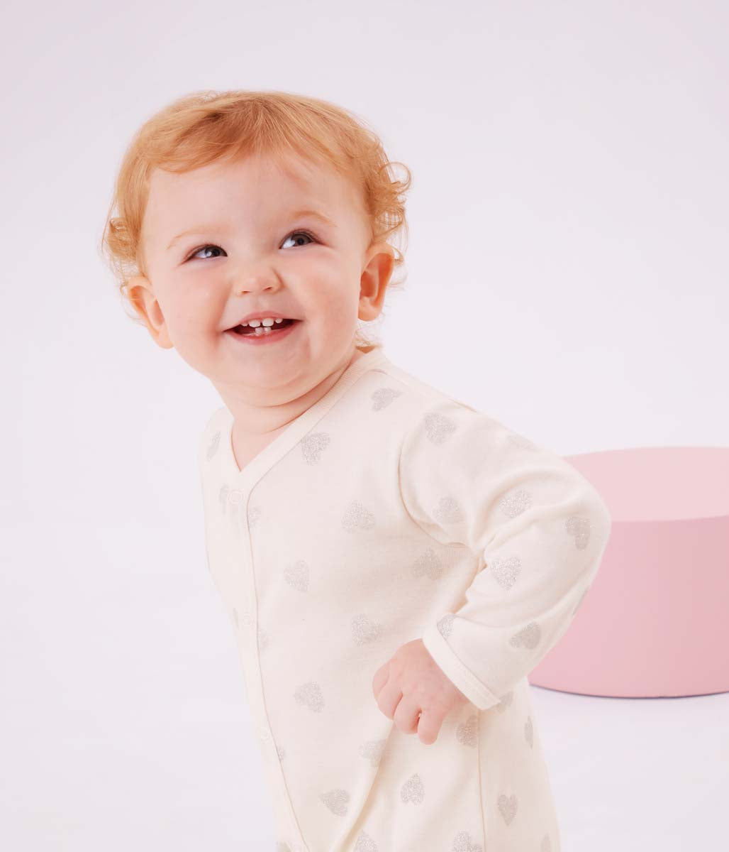 ラメ入りハートプリントの足なしロンパースです。環境にやさしく、第二の肌と呼ばれるほど心地よい肌触りの1x1リブ編みコットンを使用し、快適かつナチュラルな着心地を実現。前面が大きく開くので脱ぎ着が楽なうえ何枚あっても嬉しいアイテムは、ご自宅用としてはもちろん、出産祝いなどのギフトにも大変喜ばれます。