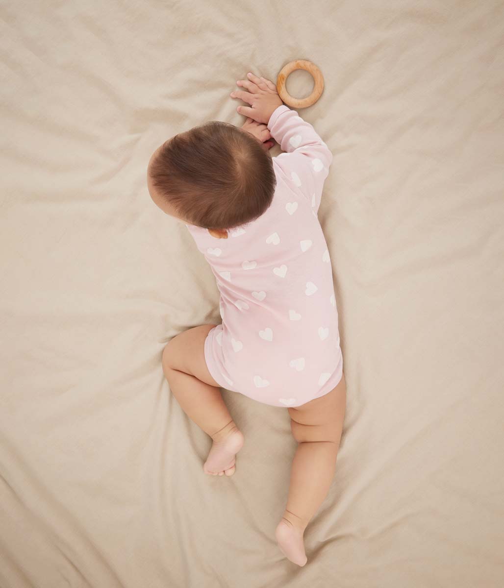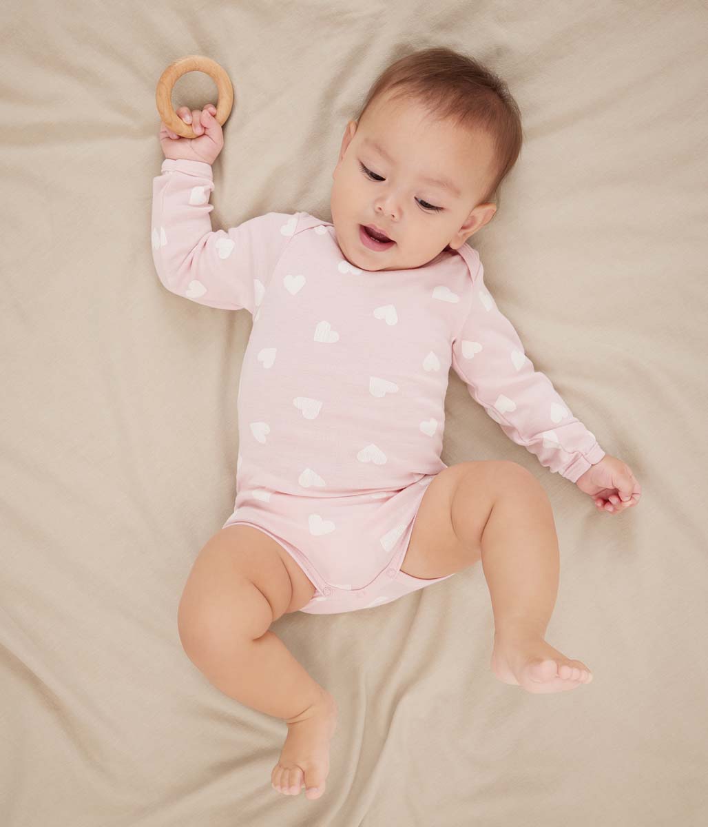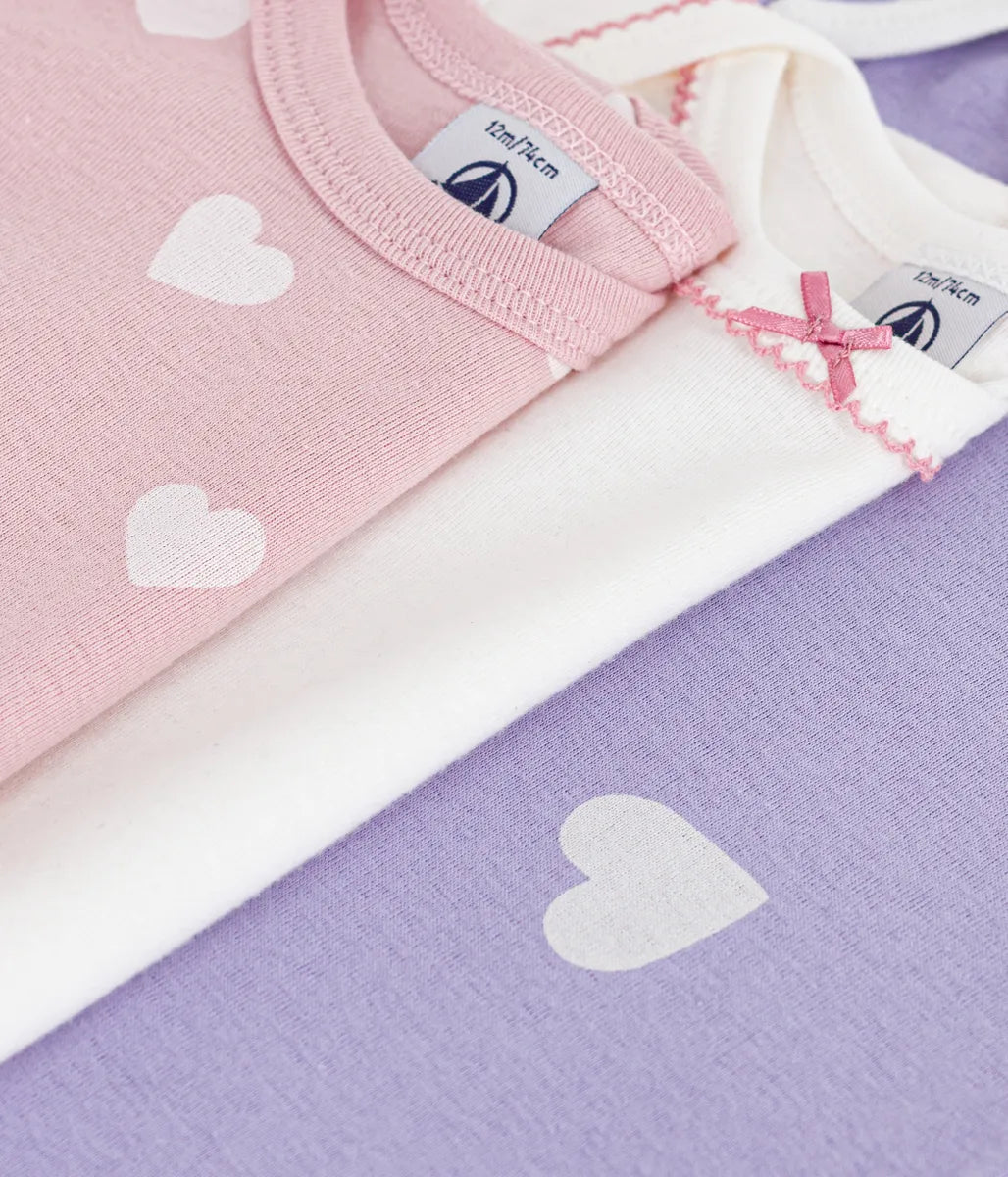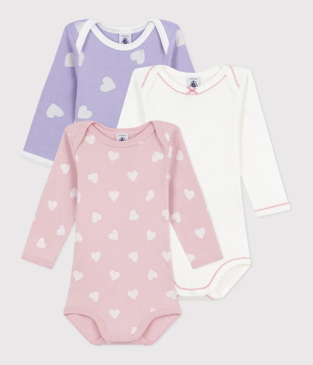人気のハートプリントと清潔感のあるピュアホワイトで揃えた長袖ボディ3枚セットです。環境にやさしく、第二の肌と呼ばれるほどやわらかな1x1リブ編みコットン素材を使用し、ナチュラルで快適な着用感を実現しています。股下がスナップボタンで大きく開くのでオムツ替えやお着替えも簡単。ご自宅での使用はもちろん、出産祝いなどのギフトにも喜ばれる、リボンとピコレースがキュートなおすすめのセットです。