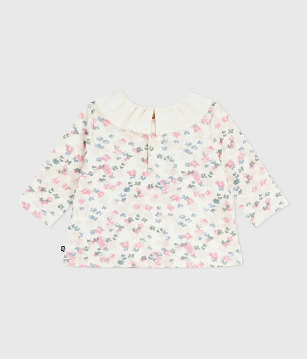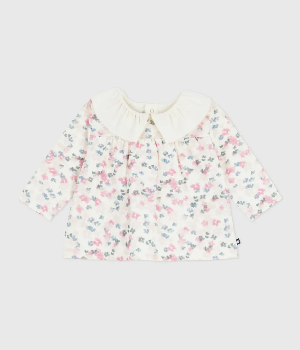 水彩画タッチのフラワープリントが美しい長袖ブラウスです。環境にやさしく、2枚の生地を編み上げたやわらかなチュビック素材を使用し、快適な着心地を実現しています。フリル衿がデザインのアクセントに。これからのシーズンに活躍間違いなしのかわいいおすすめアイテムです。