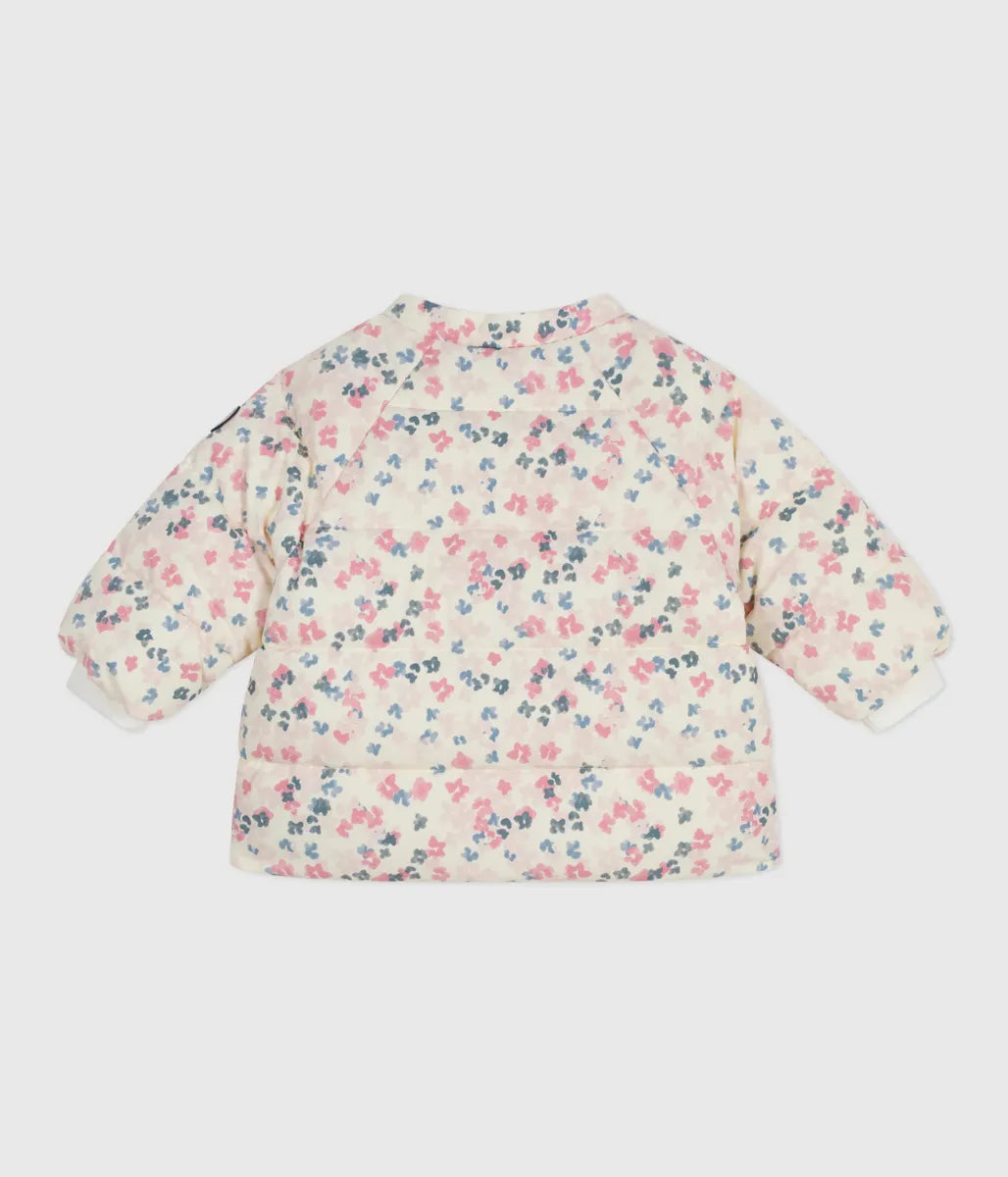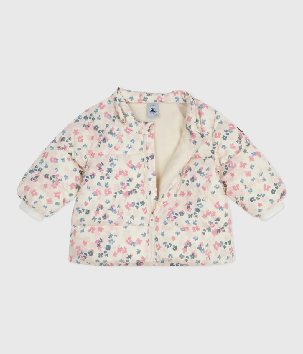 あたたかな中綿をたっぷりと充填したフラワー柄のフード付きジャケットです。環境にやさしく、軽量で型崩れしにくいポリエステル素材を使用しているので、デイリーでの着用が可能。フード裏にあしらわれた、アイコニックな極細ミラレボーダーがデザインにアクセントをプラスしています。これからのシーズンに活躍間違いなしのおすすめアイテムです。
