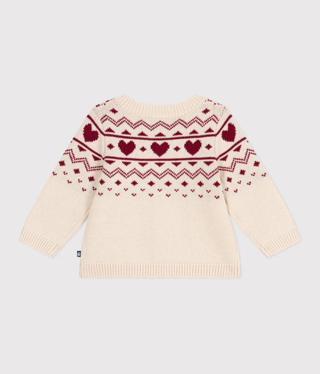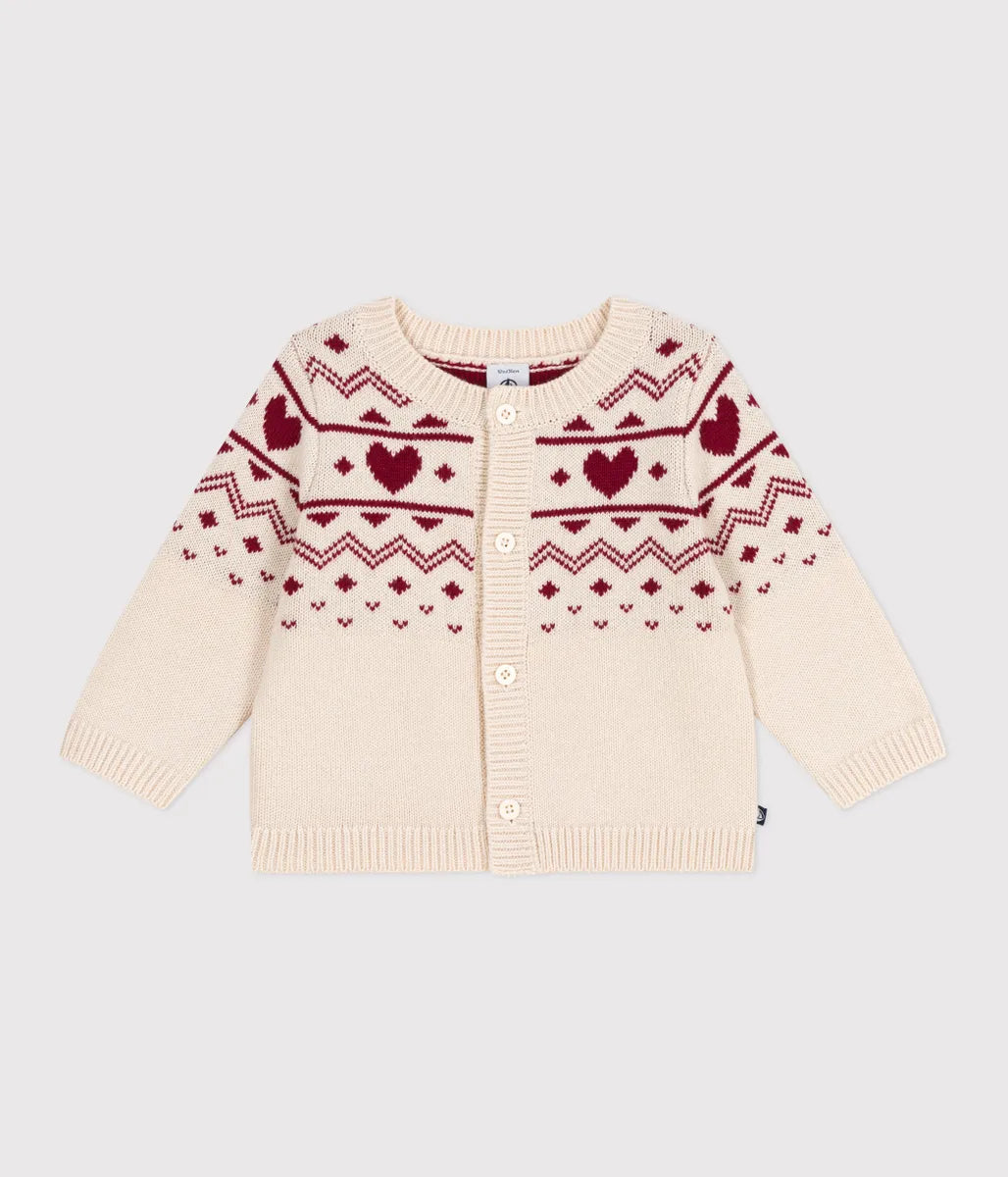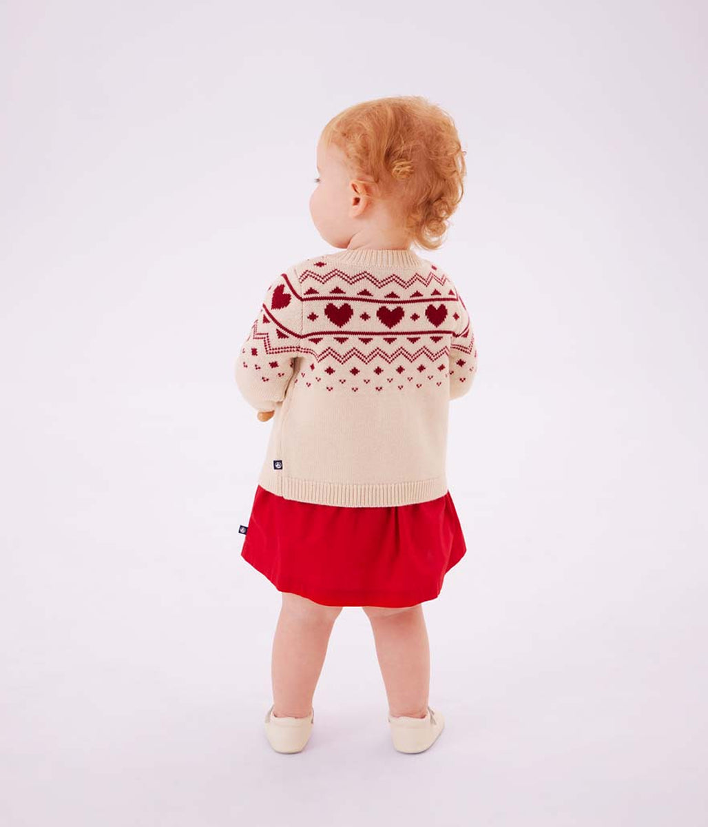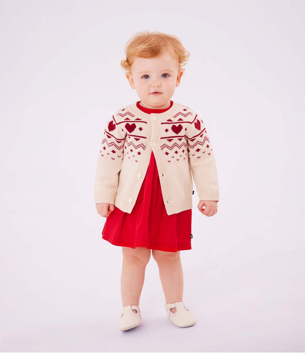 ハートを織り交ぜたノルディック調のデザインがキュートなカーディガンです。環境や動物にやさしいウール混素材を使用した、あたたかみのある肌触りと着心地に定評があります。脱ぎ着がしやすく動きやすいデザインは、元気なベビーたちにぴったり。肌寒い時の羽織としてなどシーズンを通して活躍するおすすめのアイテムです。きょうだいでお揃いコーデも可能。
