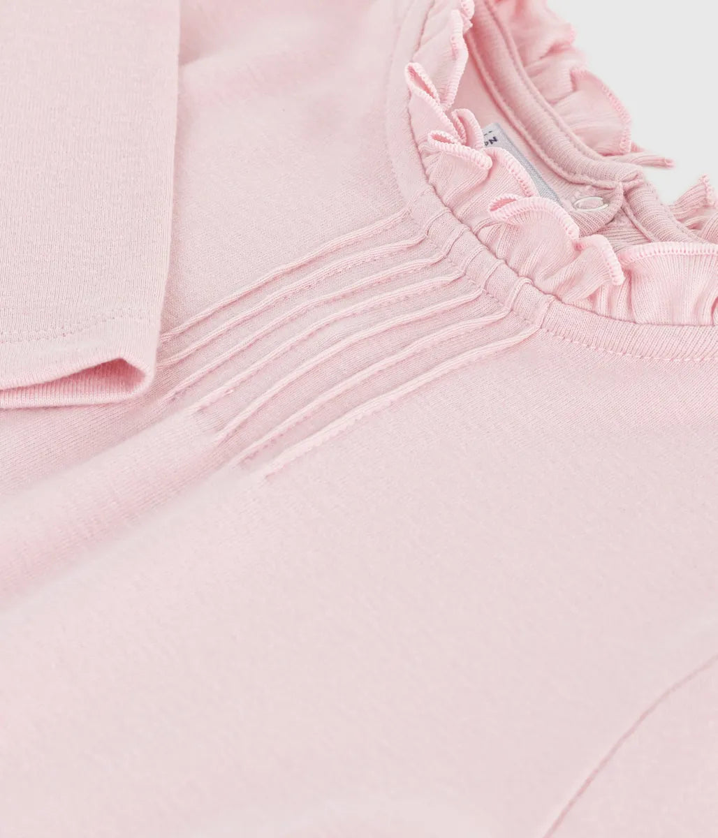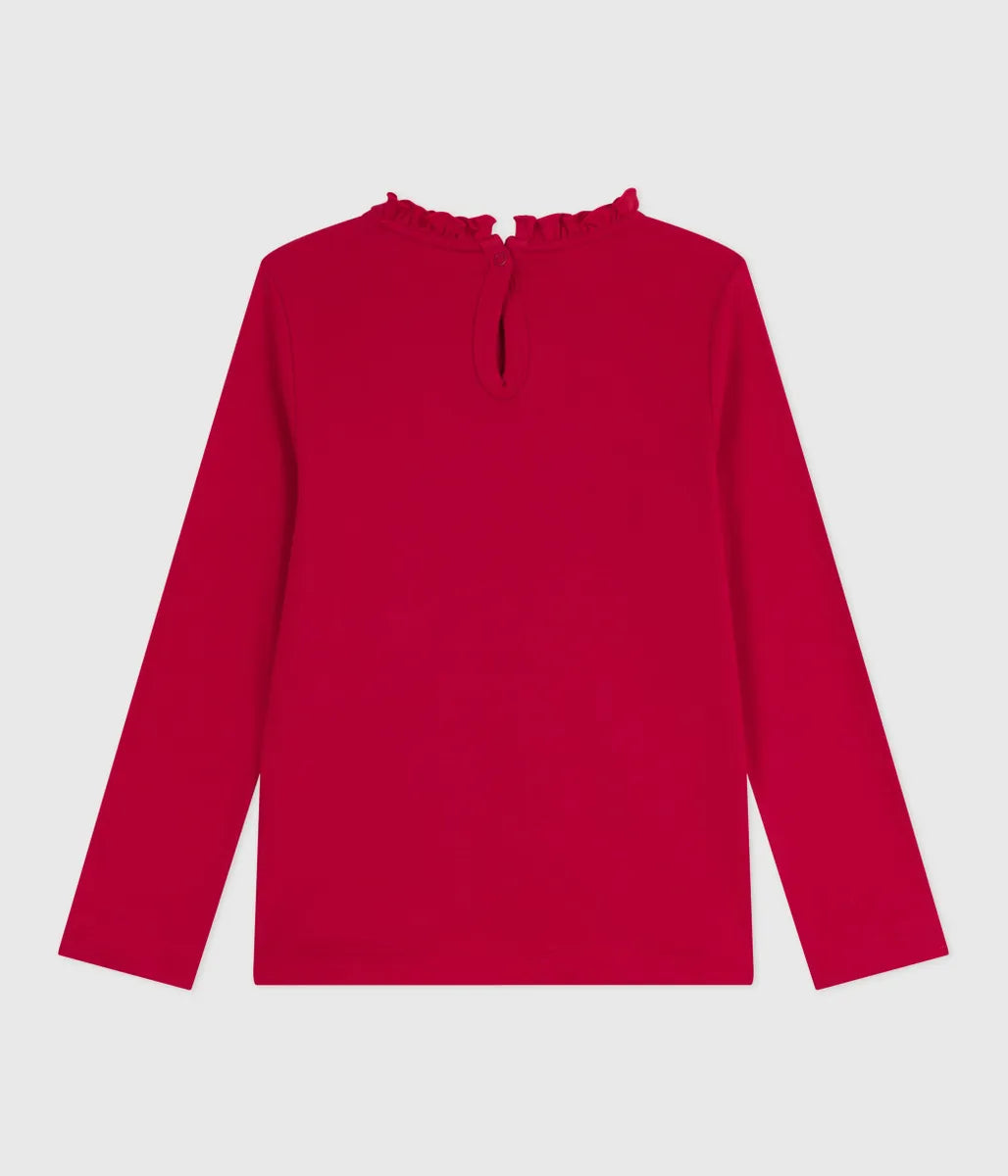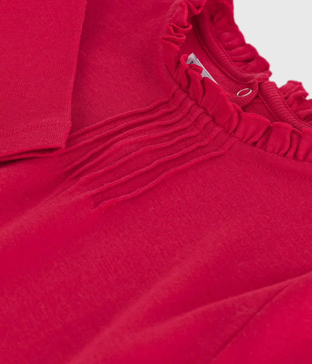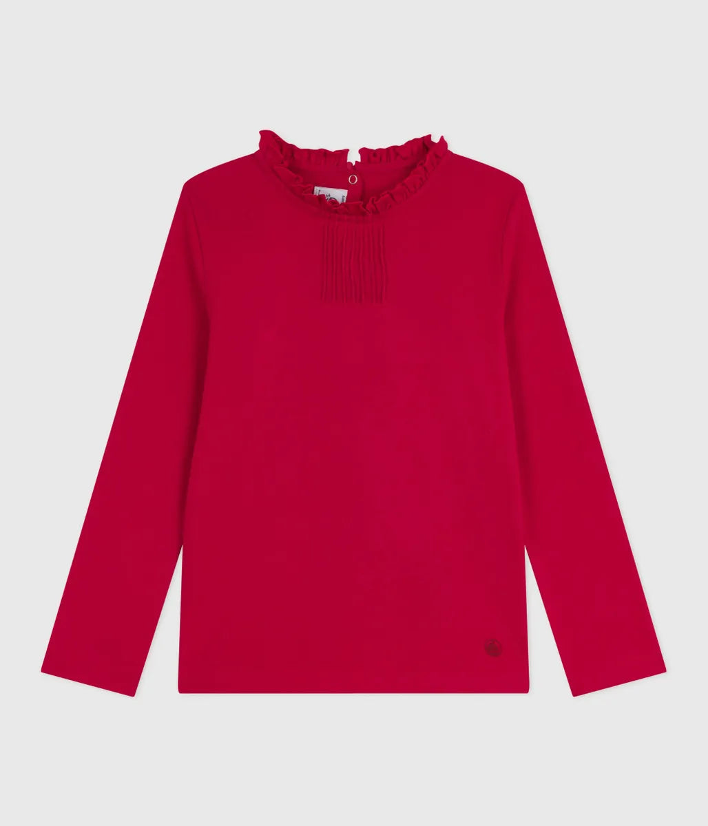胸元の7本ラインがアクセントになった長袖Tシャツです。環境にやさしい、第二の肌と呼ばれるほどやわらかな1x1リブ編みコットン素材を使用しやわらかな着心地を実現しています。甘さのあるフリル衿がデザインのポイント。デニムからスカートまで幅広いスタイルを楽しめる注目アイテムです。ピンク、ホワイト、レッドの3色展開。