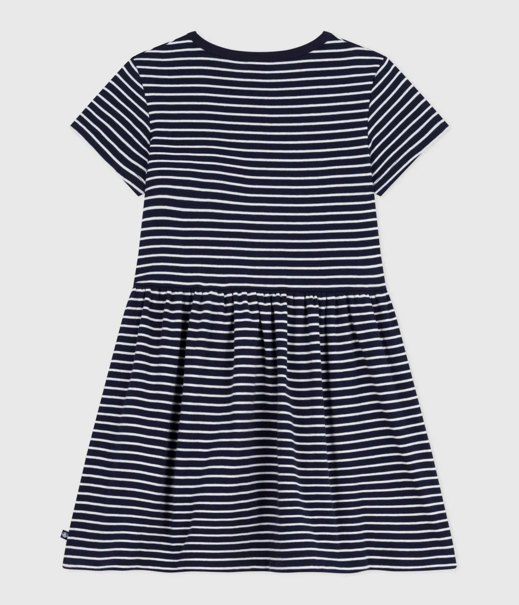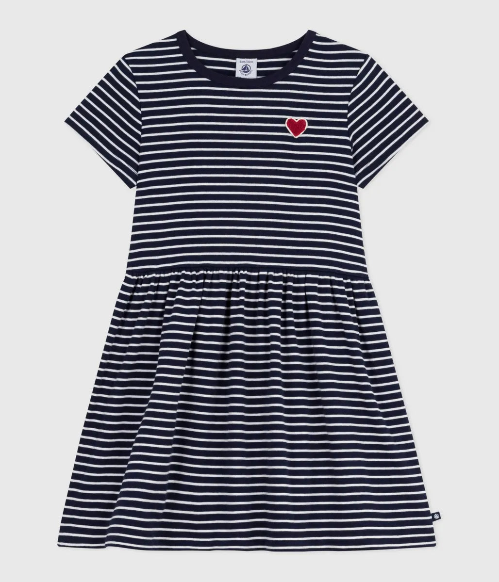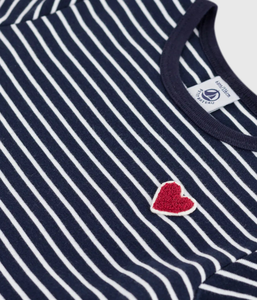 プチバトーを象徴するミニマリニエールボーダーが目を引く、キュートな半袖ワンピースです。環境にやさしい、第二の肌と呼ばれるやわらかな手触りと伸縮性に優れた1×1リブ編み素材を使用し、快適な着用感を実現しています。シルエットの変化を楽しめる切り替えと胸のハートワッペンがデザインのポイント。これ一枚でフレンチマリンスタイルが叶うプチバトーらしいおすすめのアイテム。