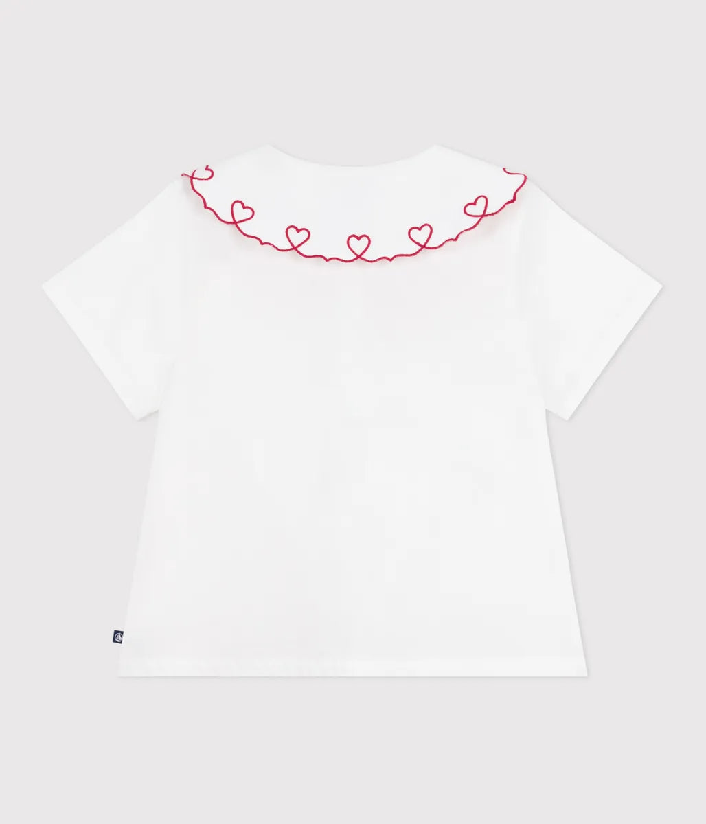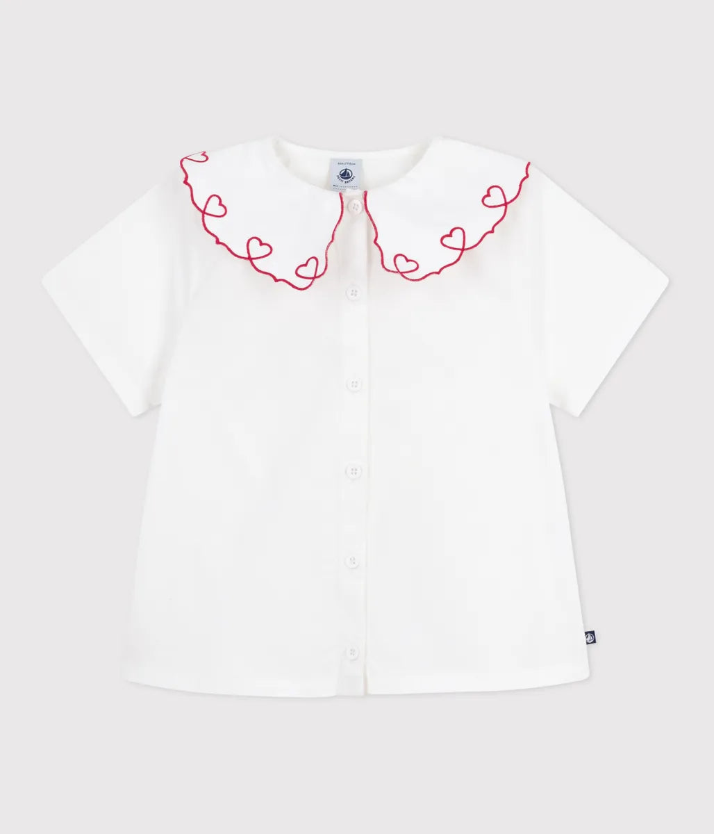 ハートの刺繍で縁取ったセーラーカラーが愛らしい半袖ブラウスです。環境にやさしく、柔らかな着心地のポプリン素材を使用し快適な着心地を実現しています。スカートからパンツまで幅広いアイテムと合わせたコーディネイトが楽しめる注目のアイテムです。