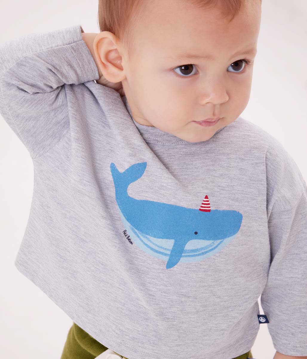 人気のクジラプリントがかわいい長袖Tシャツです。さらりとした肌触りのコットンジャージ素材を使用した快適な着心地に定評があります。背面にはスナップボタンが施されているので、お着替えも簡単。これ一枚でもインナーとしても活躍する便利なアイテムは、ご自宅用としてはもちろんギフトにも大変喜ばれます。