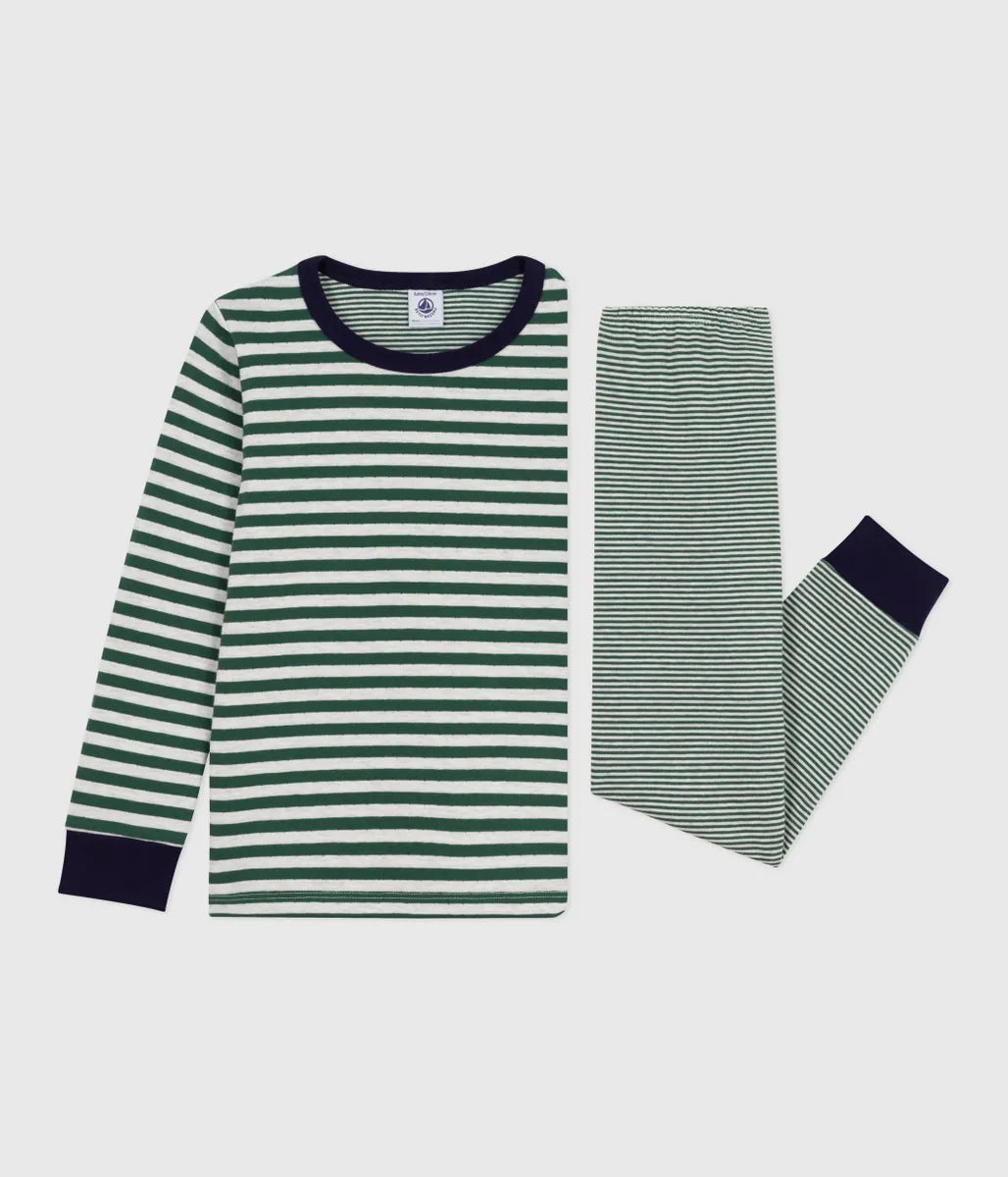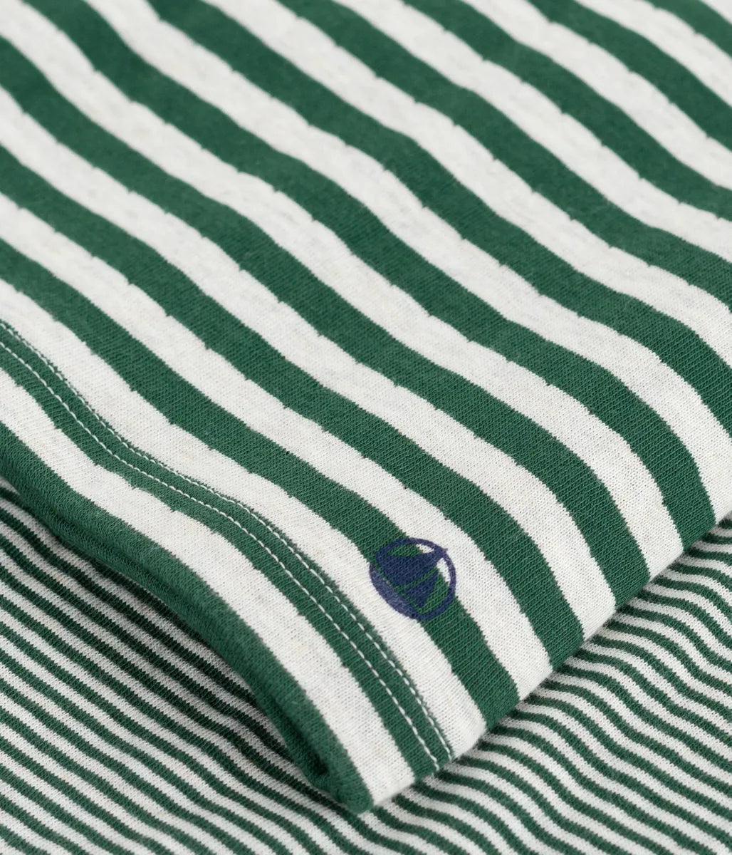 トップスには定番のボーダー、ボトムスにはアイコニックなミラレボーダーをあしらった長袖パジャマです。環境にやさしい、2枚の生地を編み上げたチュビック素材を使用し、ナチュラルな着用感を実現しています。袖口や裾にあしらわれたリブが心地良いフィット感を提供。お家でのリラックスタイムから就寝時までを快適に過ごせる、おすすめのアイテムです。
