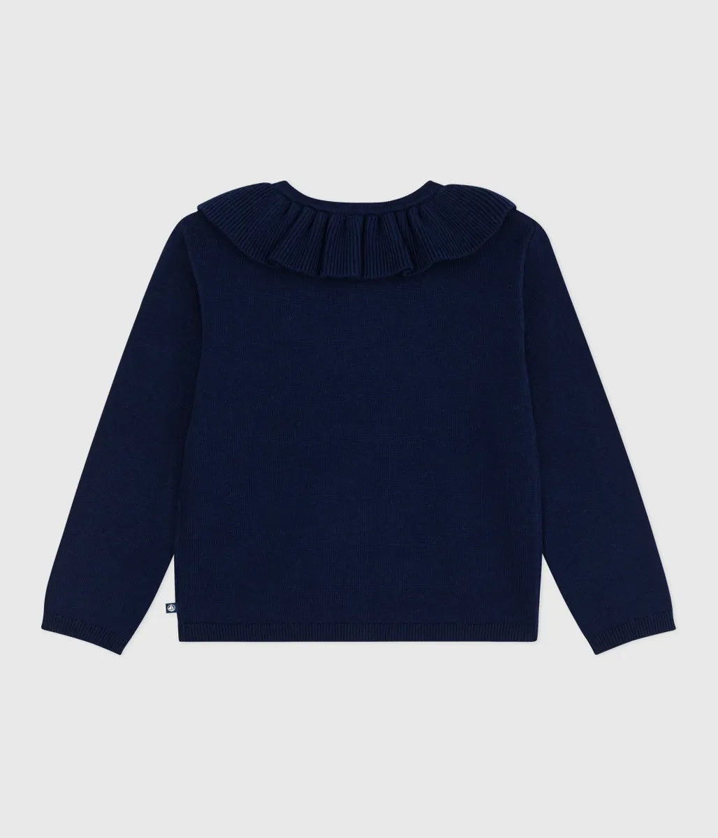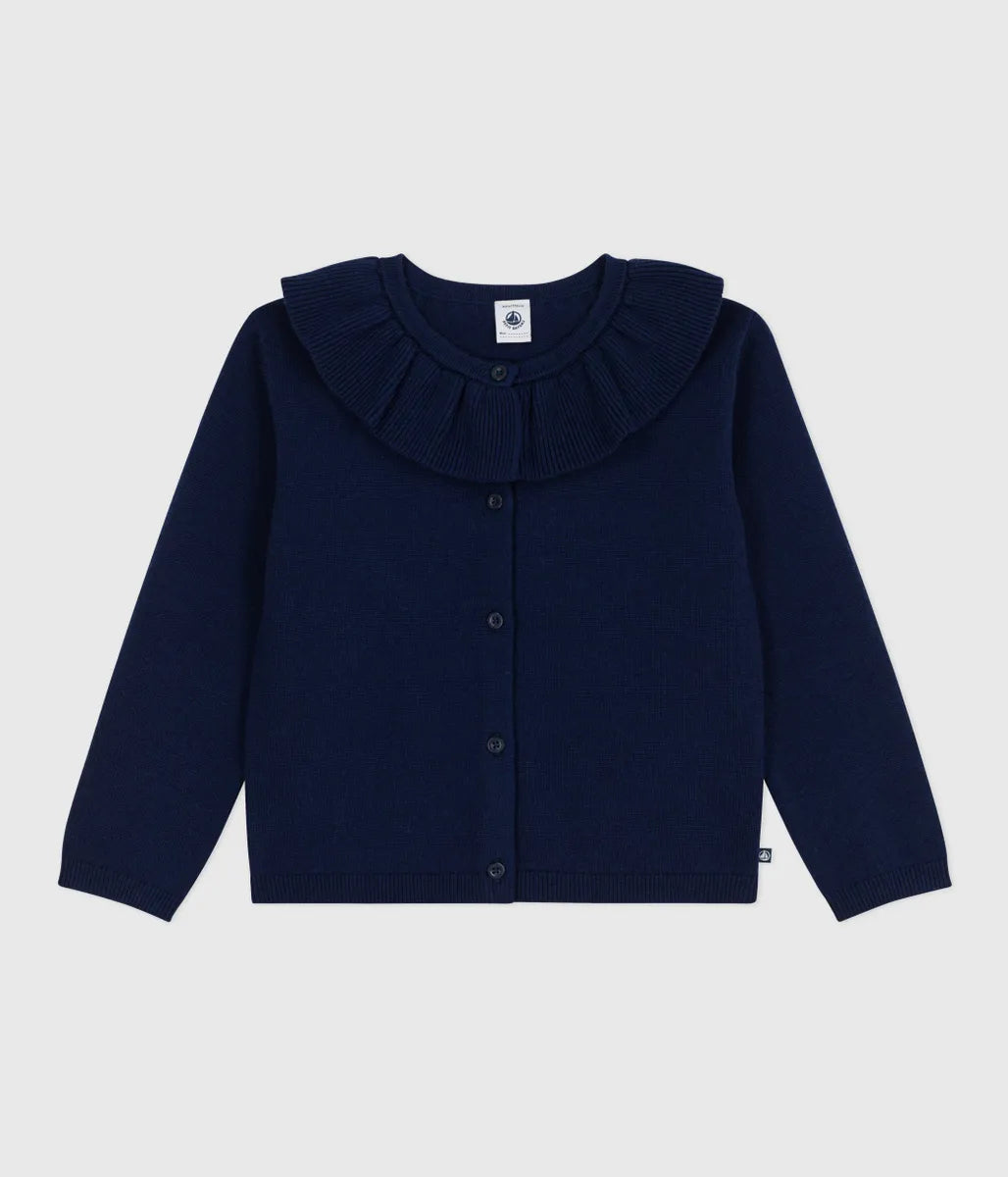 ブランドカラーのネイビーをあしらったフリル衿付きカーディガンです。環境と動物にやさしく、温かな肌触りのウール混素材を編み上げたニットの快適な着用感が人気。サッと羽織れ、カジュアルスタイルと相性がいいアイテムは、特別なギフトにも最適なアイテムです。