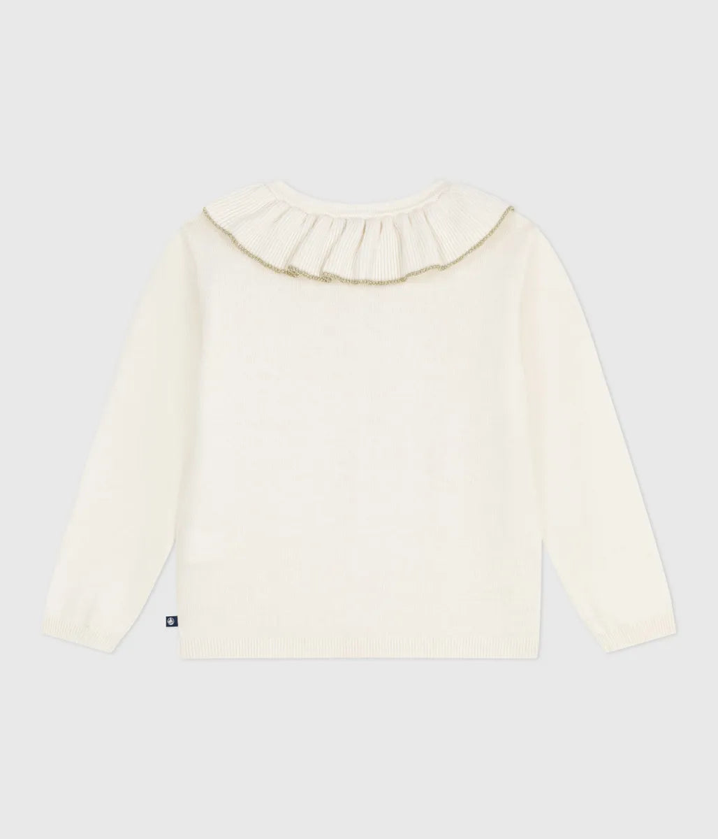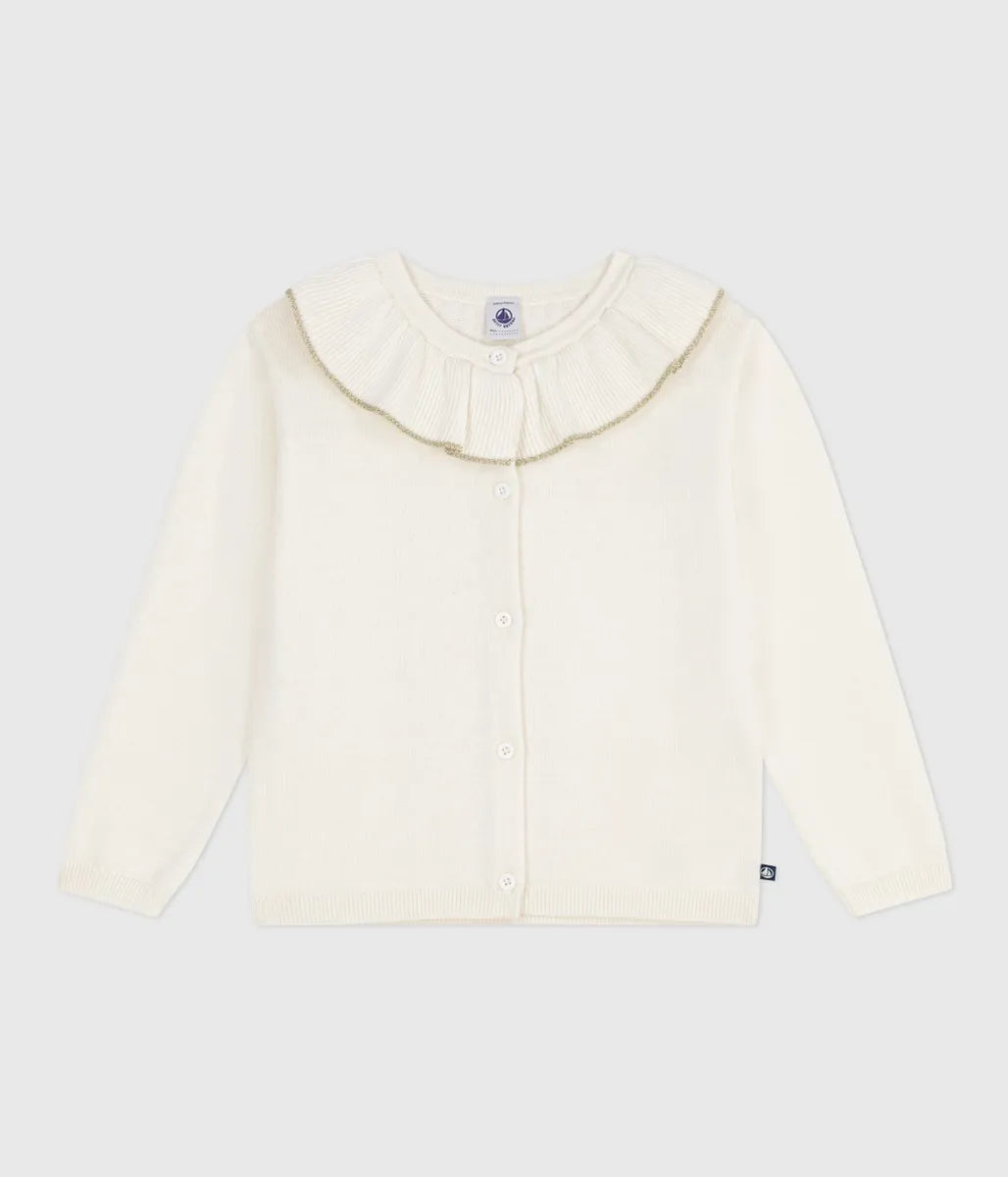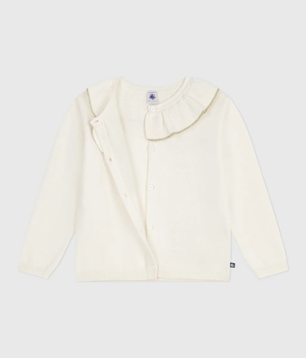 フリル衿が可愛らしい、合わせやすい色合いのカーディガンです。環境や動物にやさしいウール混素材を使用した、あたたかみのある肌触りと着心地に定評があります。羽織としても、インナーとしても、これからのシーズンにぴったりなおすすめアイテムです