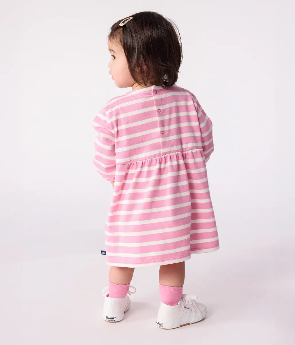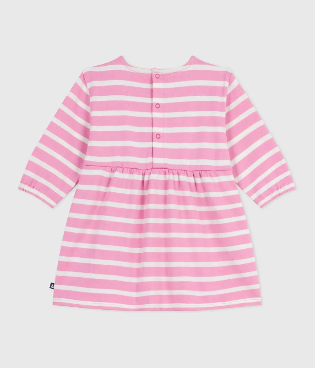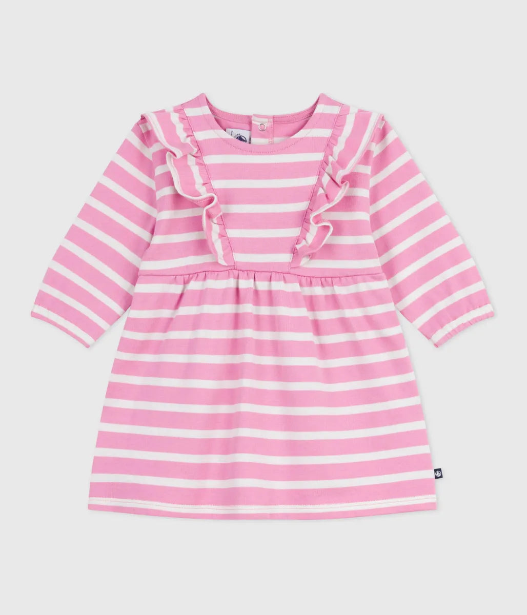 人気の定番ボーダーをあしらったワンピースです。環境にやさしく、軽量で丈夫な混紡素材を使用した快適な着心地に定評があります。フリル、シルエット変化を楽しめる切り替えやギャザーがデザインのポイント。お着替えがしやすいスナップボタンを施した、パパとママにもやさしいおすすめアイテムです。