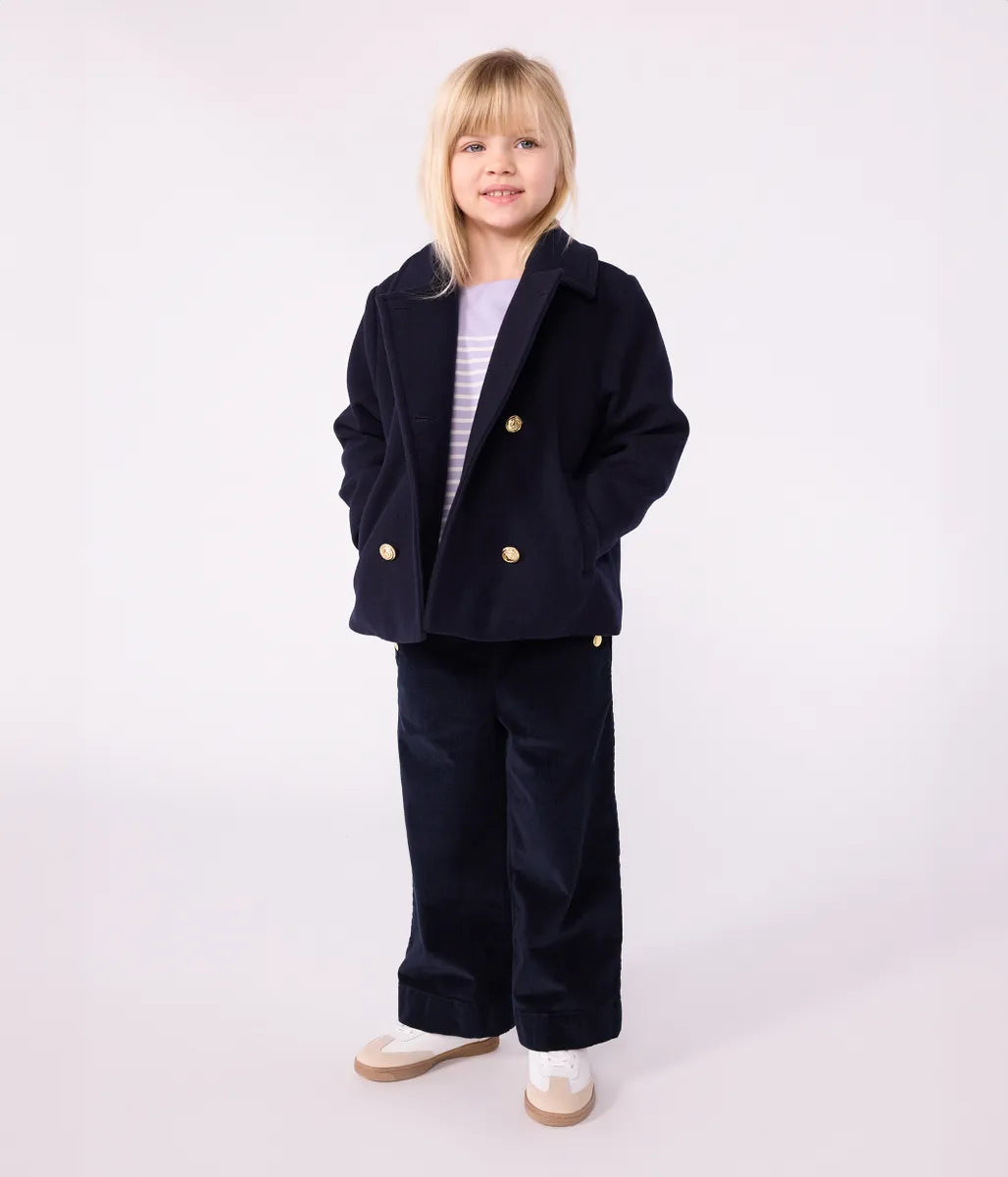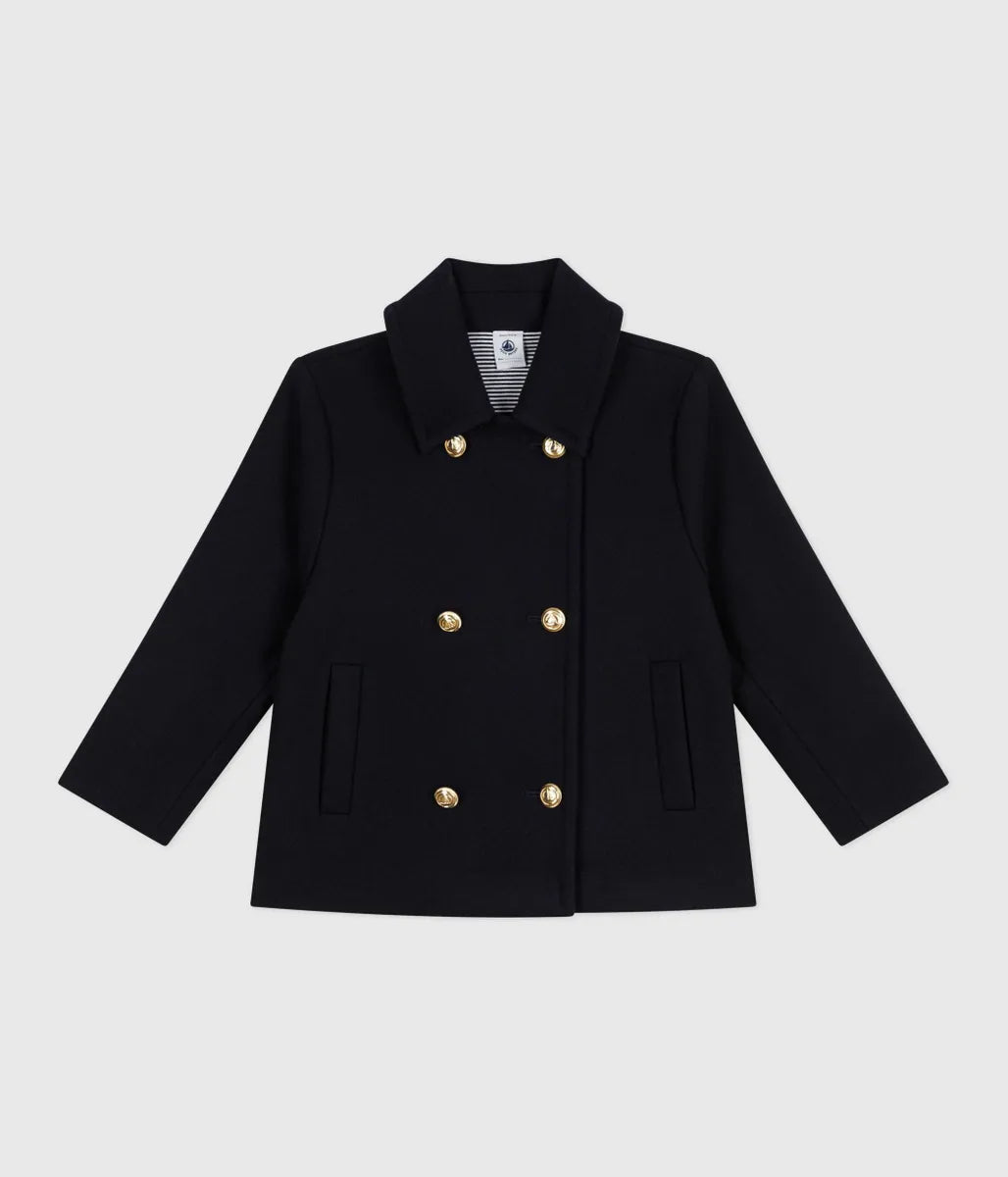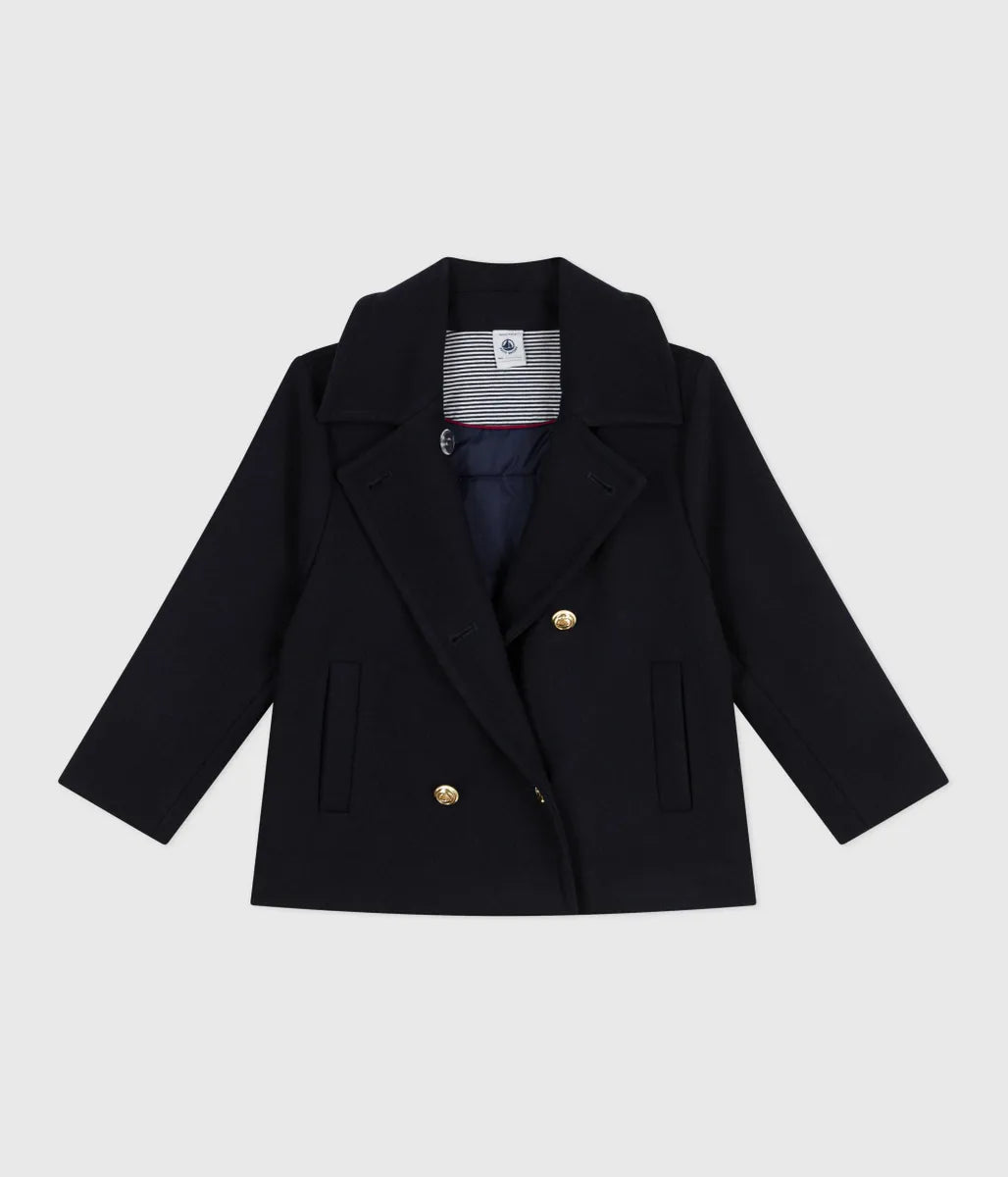 オーセンティックなピーコートをプチバトーらしくモダナイズした一着が登場です。ブランドカラーのネイビーをメインカラーに、ロゴ入りゴールドボタンや裏地にあしらったアイコニックな極細ミラレボーダーがデザインのアクセントに。これ一枚あればお出かけが待ち遠しくなる、今季注目のアイテムです。