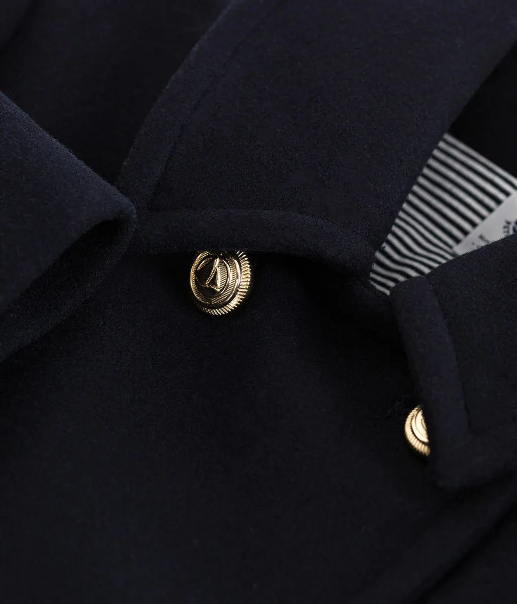 ネイビーに映えるゴールドボタン、冬を彩るプチバトーのピーコート