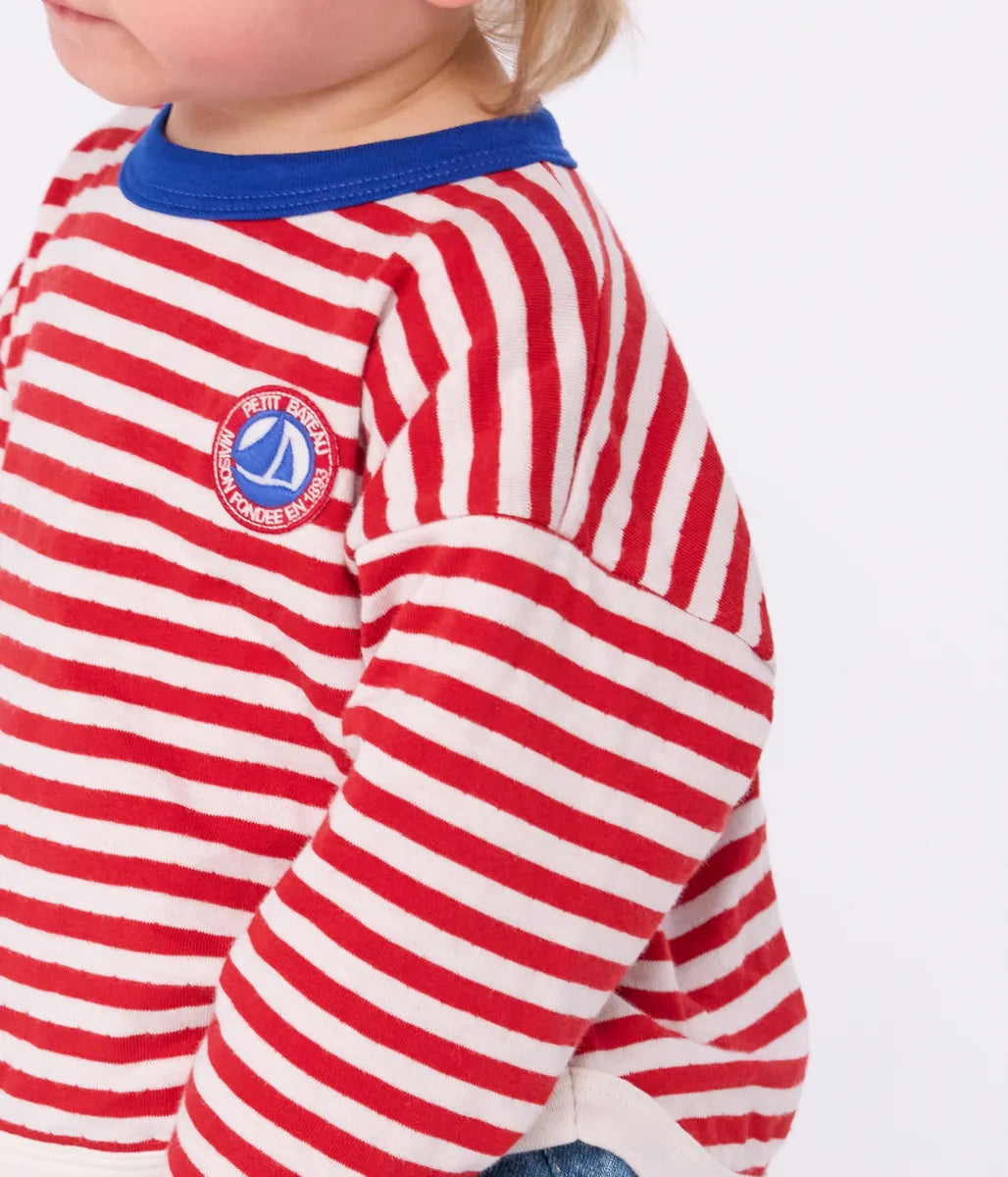 表地には定番ボーダー、裏地にはアイコニックな極細ミラレボーダーをあしらった長袖Tシャツです。環境にやさしく、2枚の生地を編み上げたやわらかな肌触りのチュビック素材を使用し、ナチュラルで快適な着用感を実現しています。胸のブランドロゴパッチがデザインのアクセントに。これ一枚でも、インナーとしても通年で着用可能なおすすめアイテムです。
