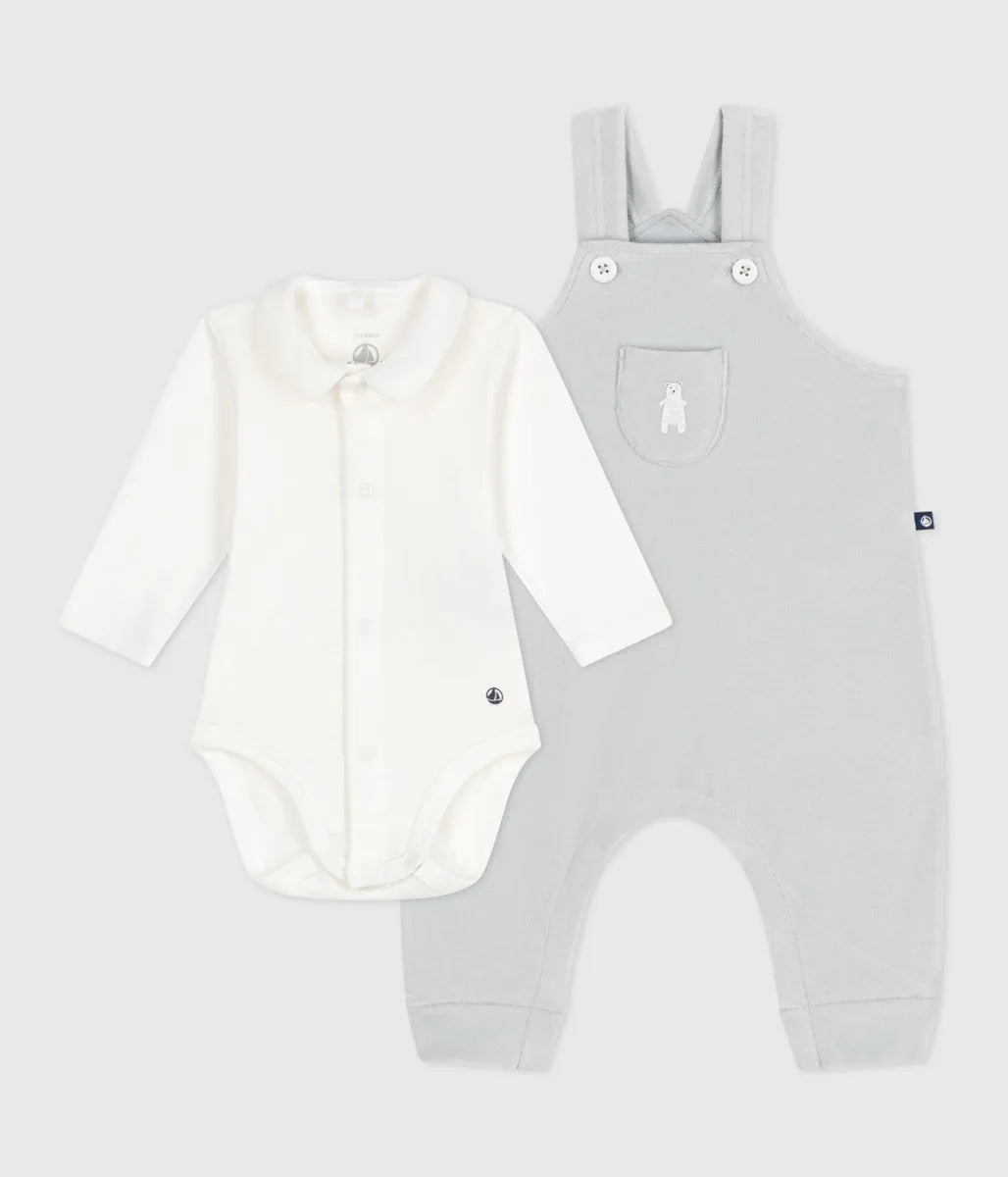 清潔感のあるピュアホワイトの丸衿ボディと、便利なサロペットを揃えたベビー2点セットです。環境にやさしく、滑らかな肌触りのベロア素材を使用し快適な着用感を実現しました。ユニセックスで着られるセットは、ご自宅用としてはもちろん、ご出産祝いなどのギフトにも大変喜ばれるおすすめのセットです。