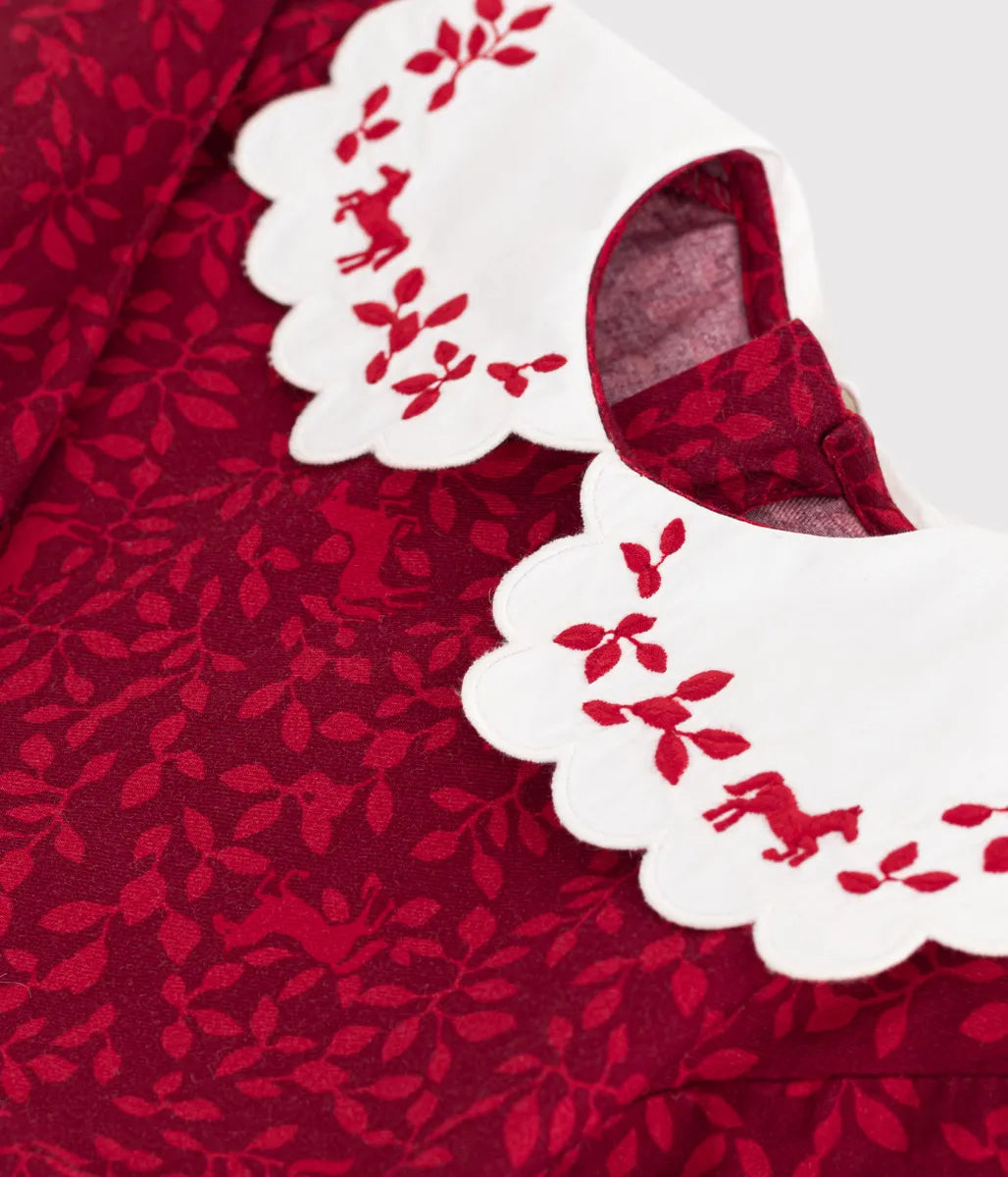 同系色であしらわれたボタニカル柄がかわいいワンピースです。滑らかで丈夫なサージ素材を使用しているので、元気なキッズも安心して着用できます。フリルとウマ刺繍をあしらった丸衿やシルエットの変化を楽しめる切り替えがデザインのアクセント。ご出産祝いなどの贈り物として、またおしゃれをしての外出が待ち遠しくなるおすすめのアイテムは、姉妹で合わせたコーディネイトも楽しめます。
