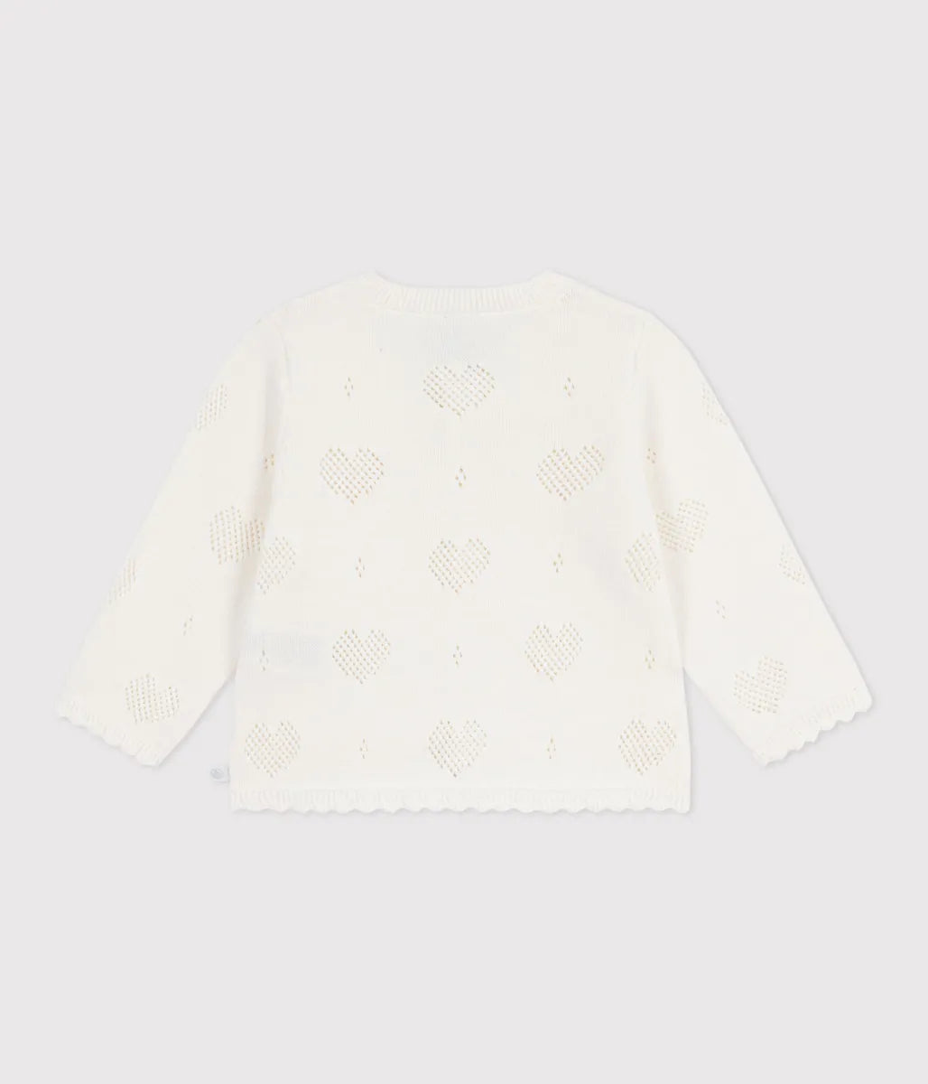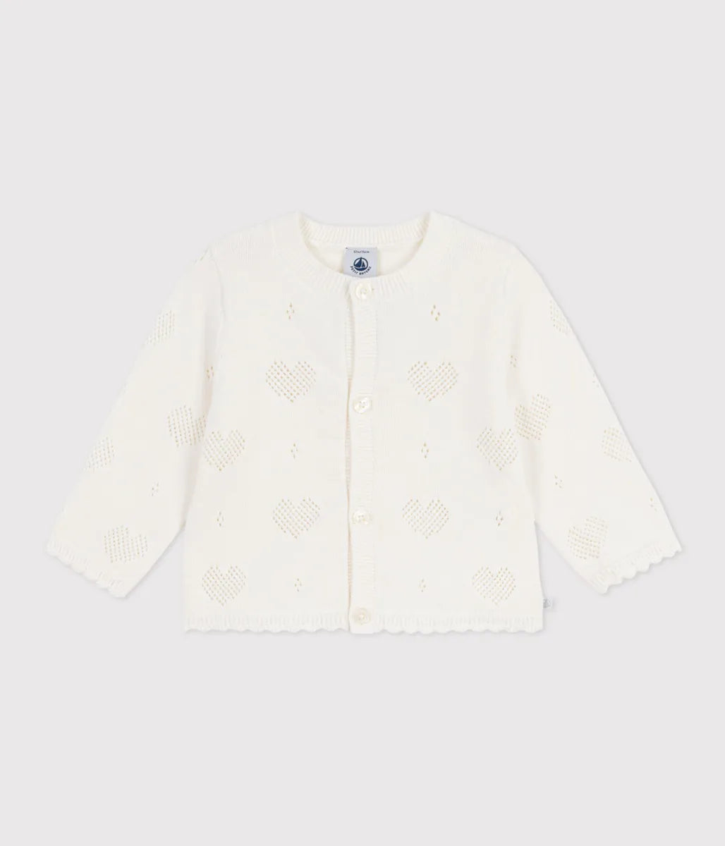 人気のハート柄をあしらったニットカーディガンです。ホワイト、ピンク、ミントグリーンの3色展開。脱ぎ着がしやすく動きやすいシンプルなデザインは、ベビーたちにもぴったり。肌寒い時の羽織としてなどシーズンを通して活躍するおすすめのアイテムです。