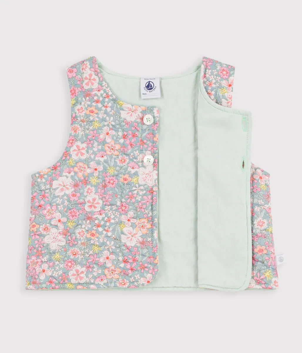 キュートなフラワー柄の前開きベストです。前開きタイプなのでお着替えも簡単な、可愛さと機能性を兼ね備えた一枚あると大変便利なアイテムです。ブラウスやワンピースに合わせたコーディネートもおすすめ。