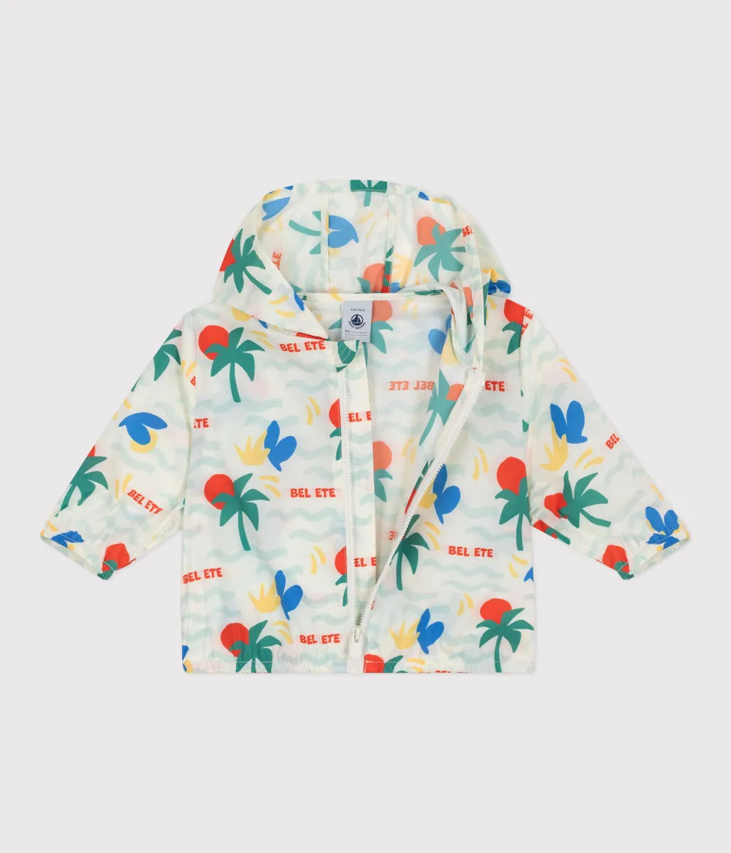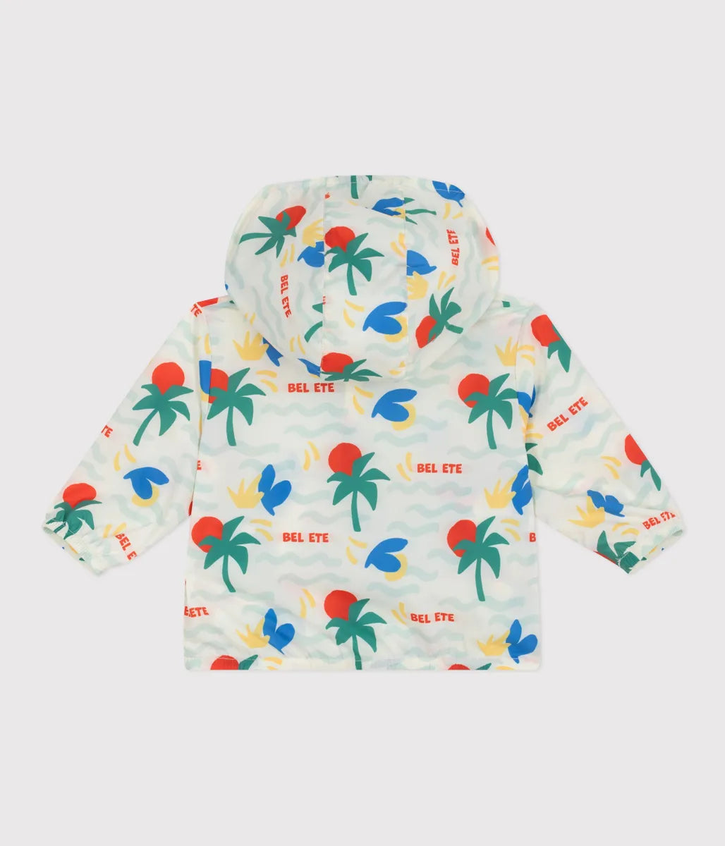 ヤシの木や太陽をモチーフにしたカラフルなプリントが目を引くフード付きサンブレーカーです。折りたたんで内ポケットに収納可能で持ち運びも便利。日差しの強い季節の外遊びやお出かけに活躍します。